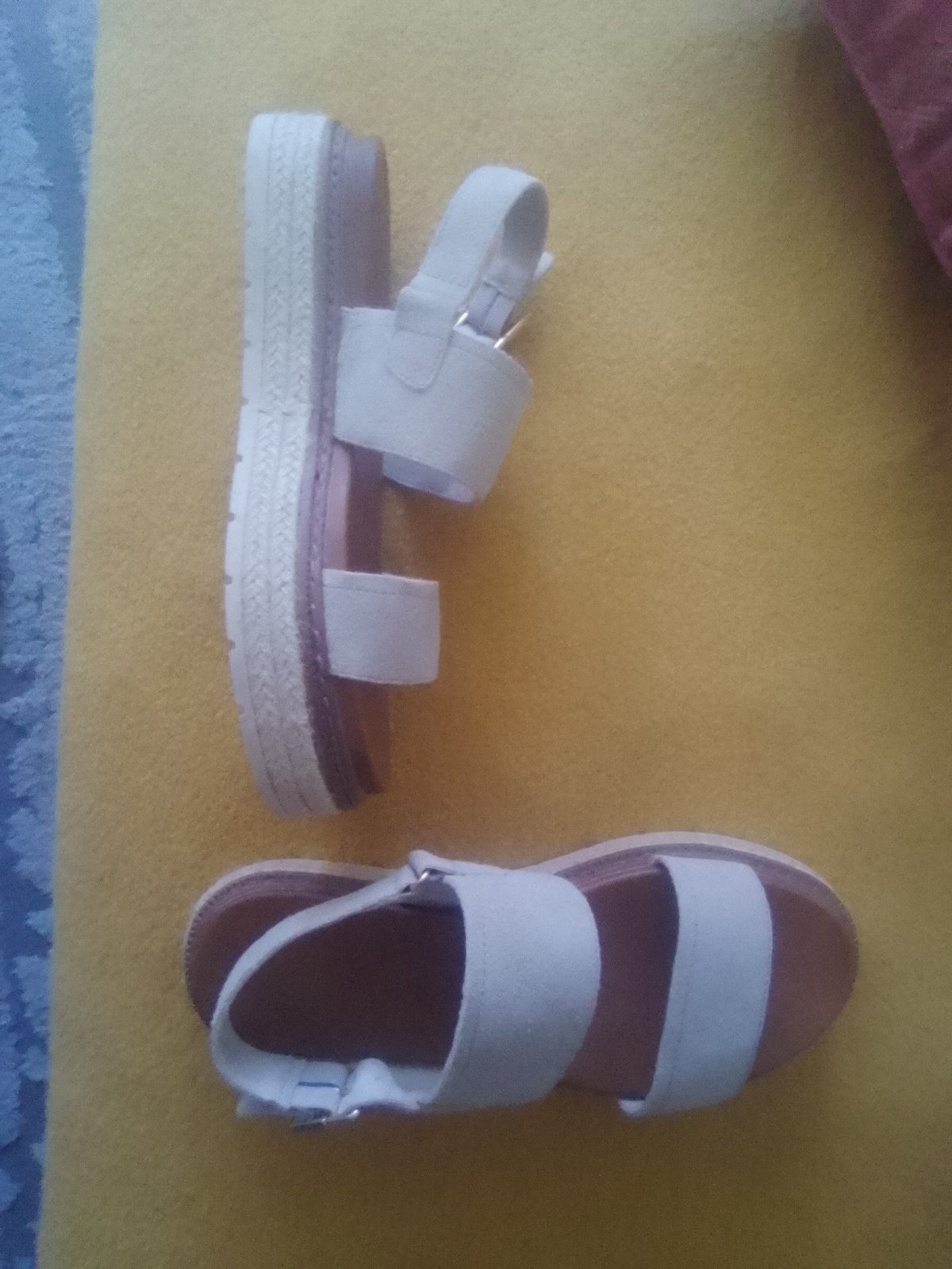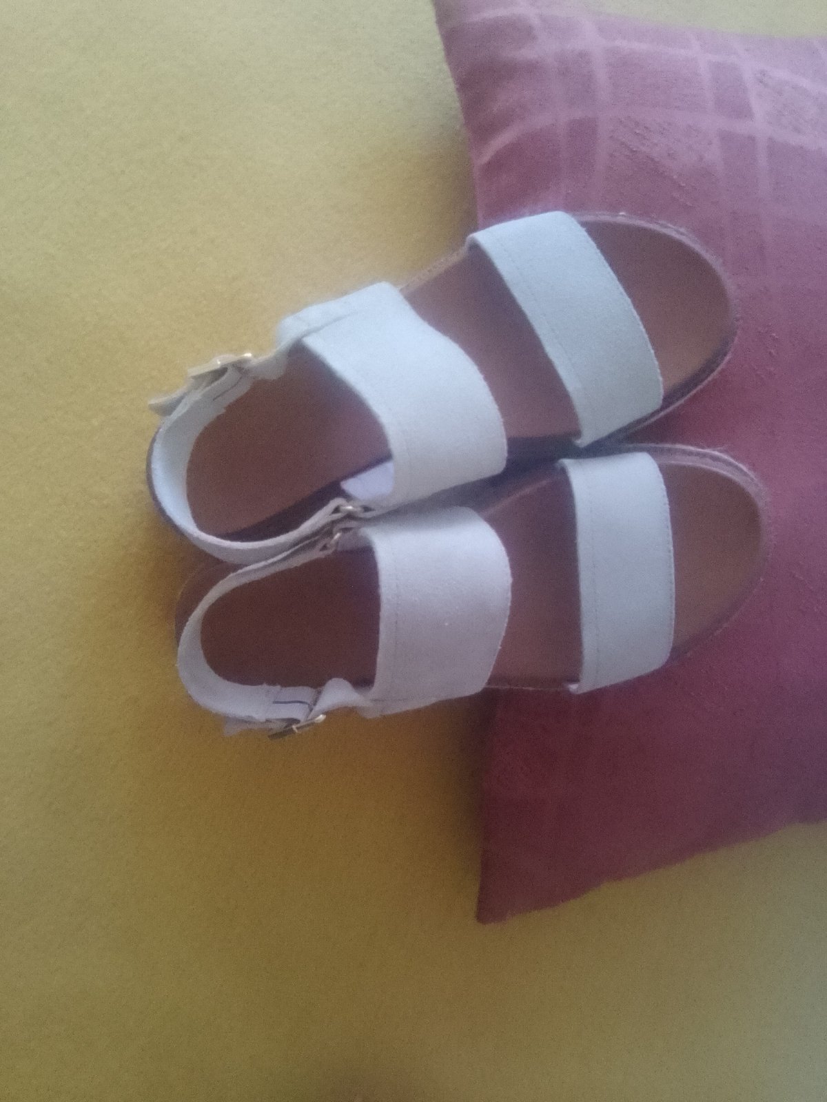 Predám sandálky krémovej farby (pôvodná cena 40€) alebo vymením za 1/2 kg zrnkovej kávy úplne nové, nenosené,nesadla veľkosť.Vnútri dĺžka stielky 26 cm.Remienky z mäkkej velúrovej kože vypracovanej bez použitia chrómu