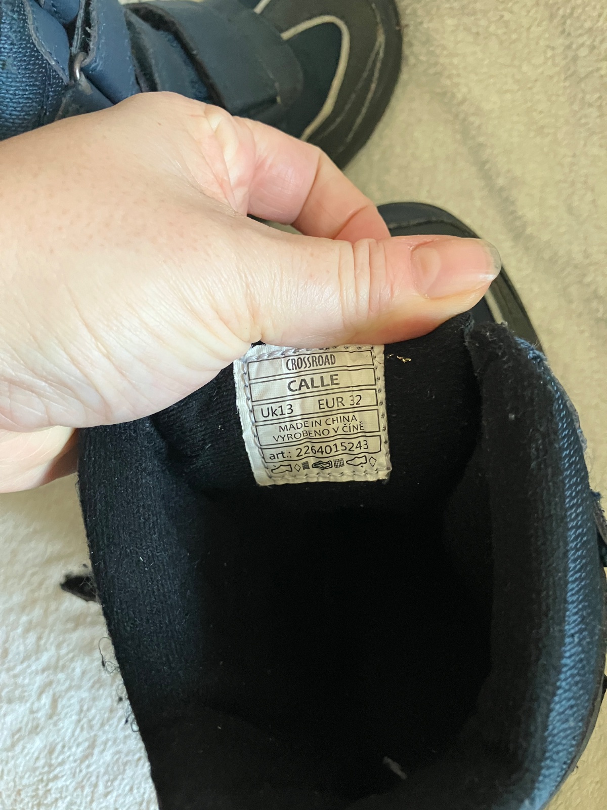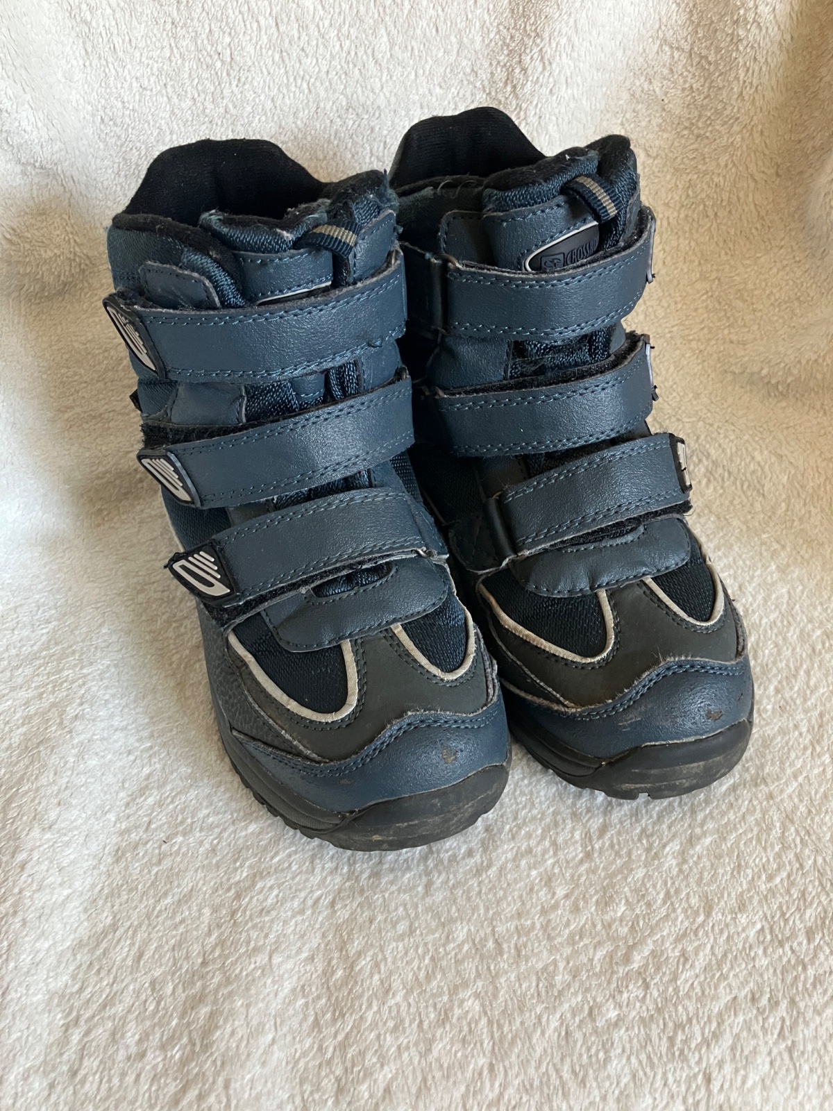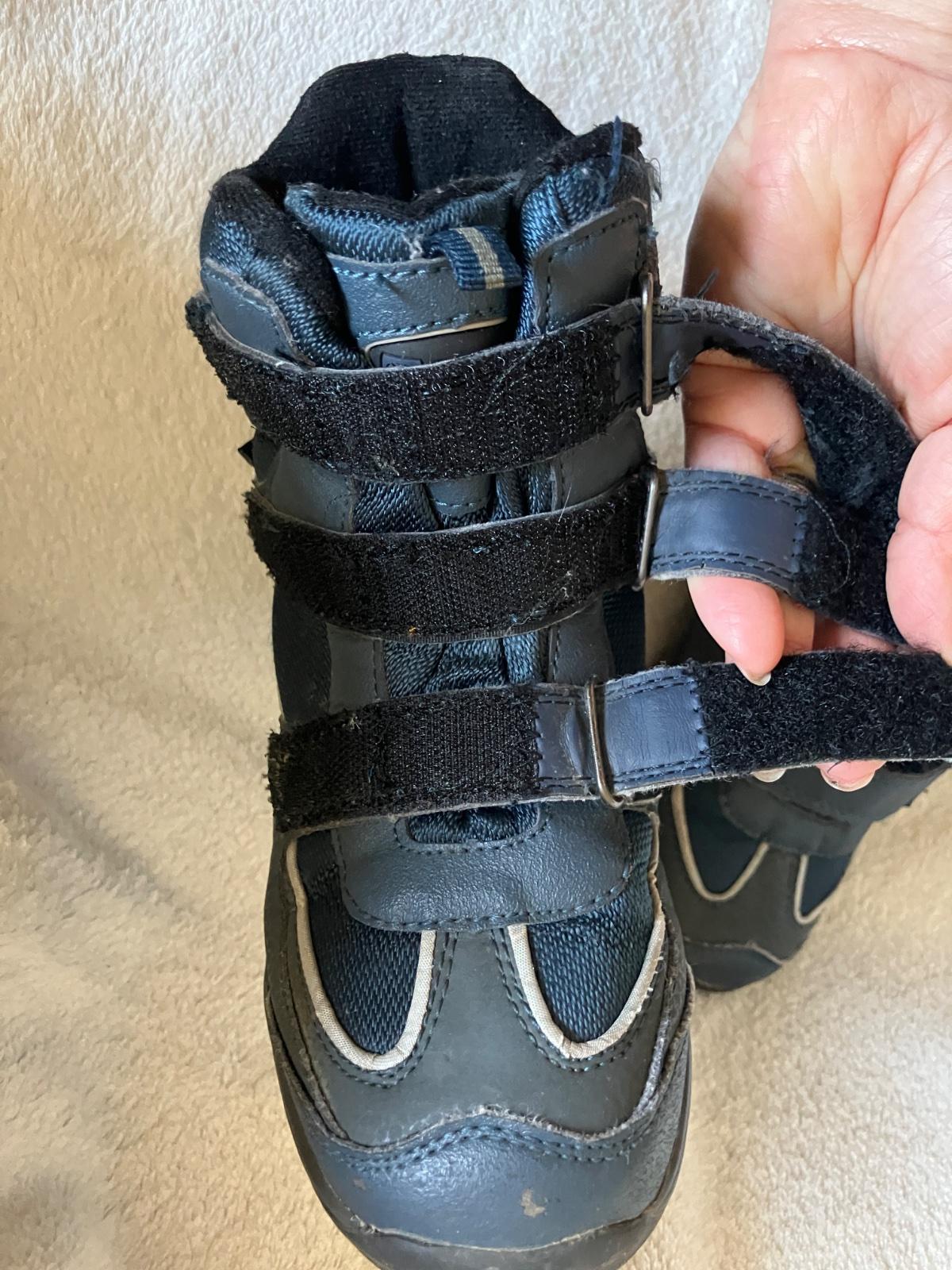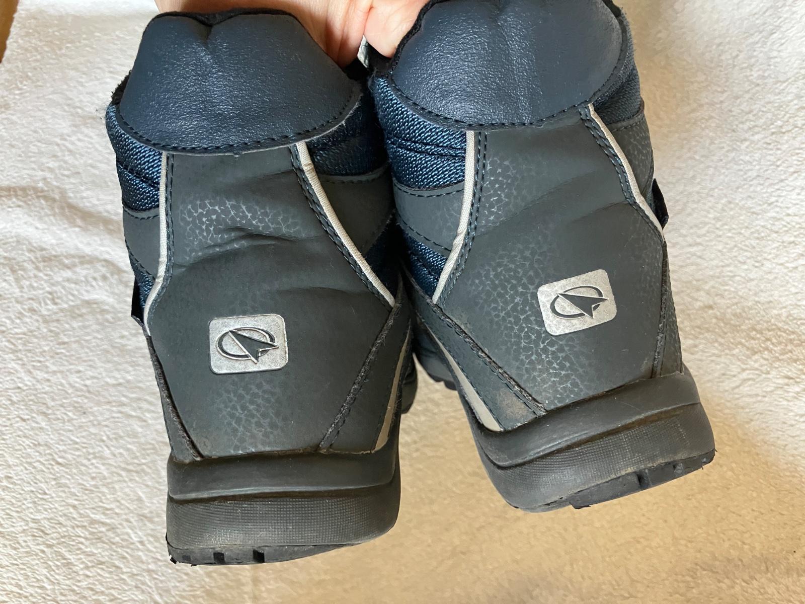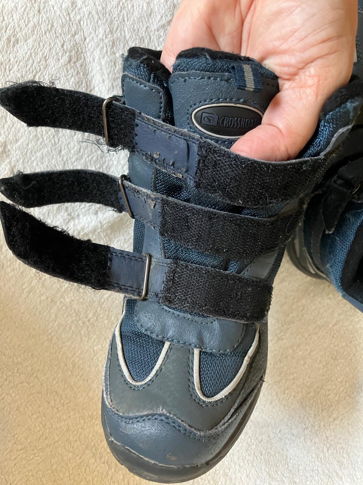 Tmavomodre vyssie topanky na suchy zips zn. Crossroads, velkost 32, dlzka stielky na foto. Stielka je pri pate vyvysena, preto nie je merane od konca. Suche zipsy drzia, spicky miestami zakopnute, podrazka neschodena. Dnu nie su zosuchane paty.