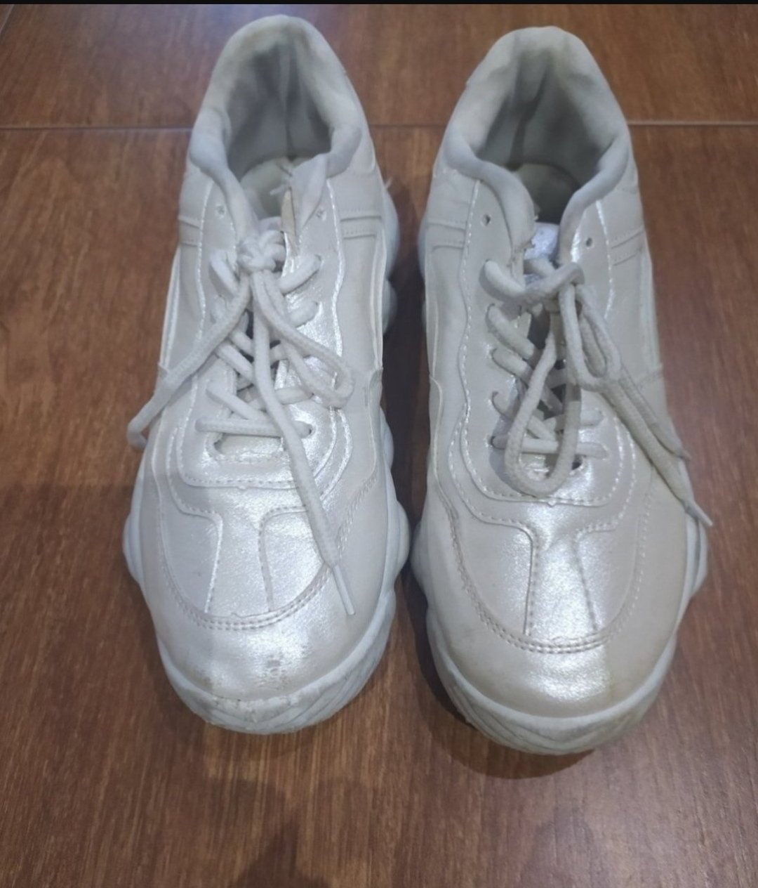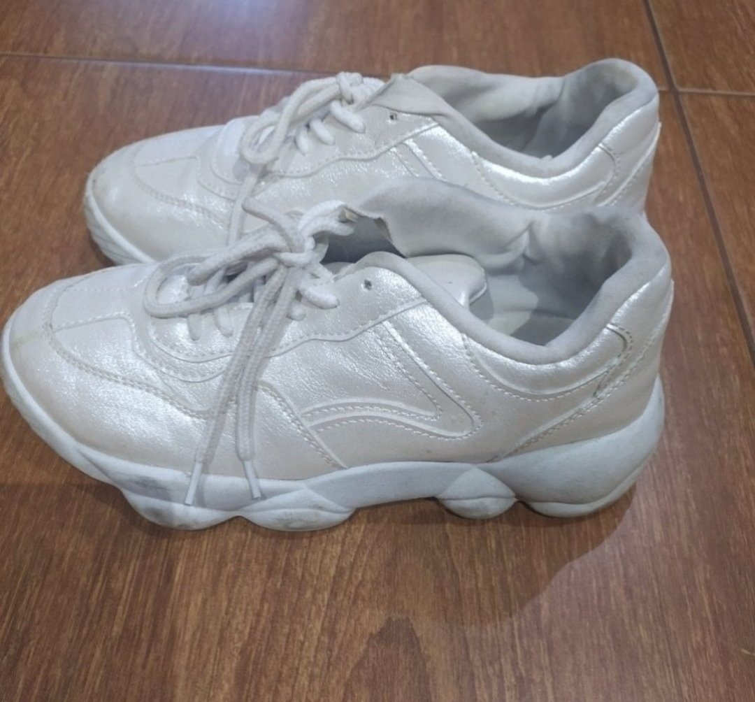 Obuté pár krát,tenisky majú hrubú podrážku,maslovo perletovej farby.mensie nedostatky,jednu sa dcére podarilo jemne skrabnut