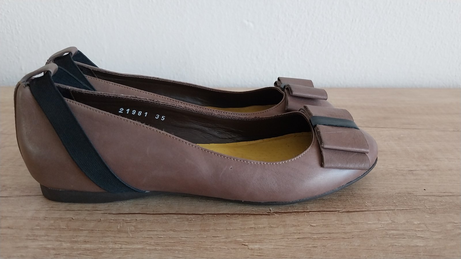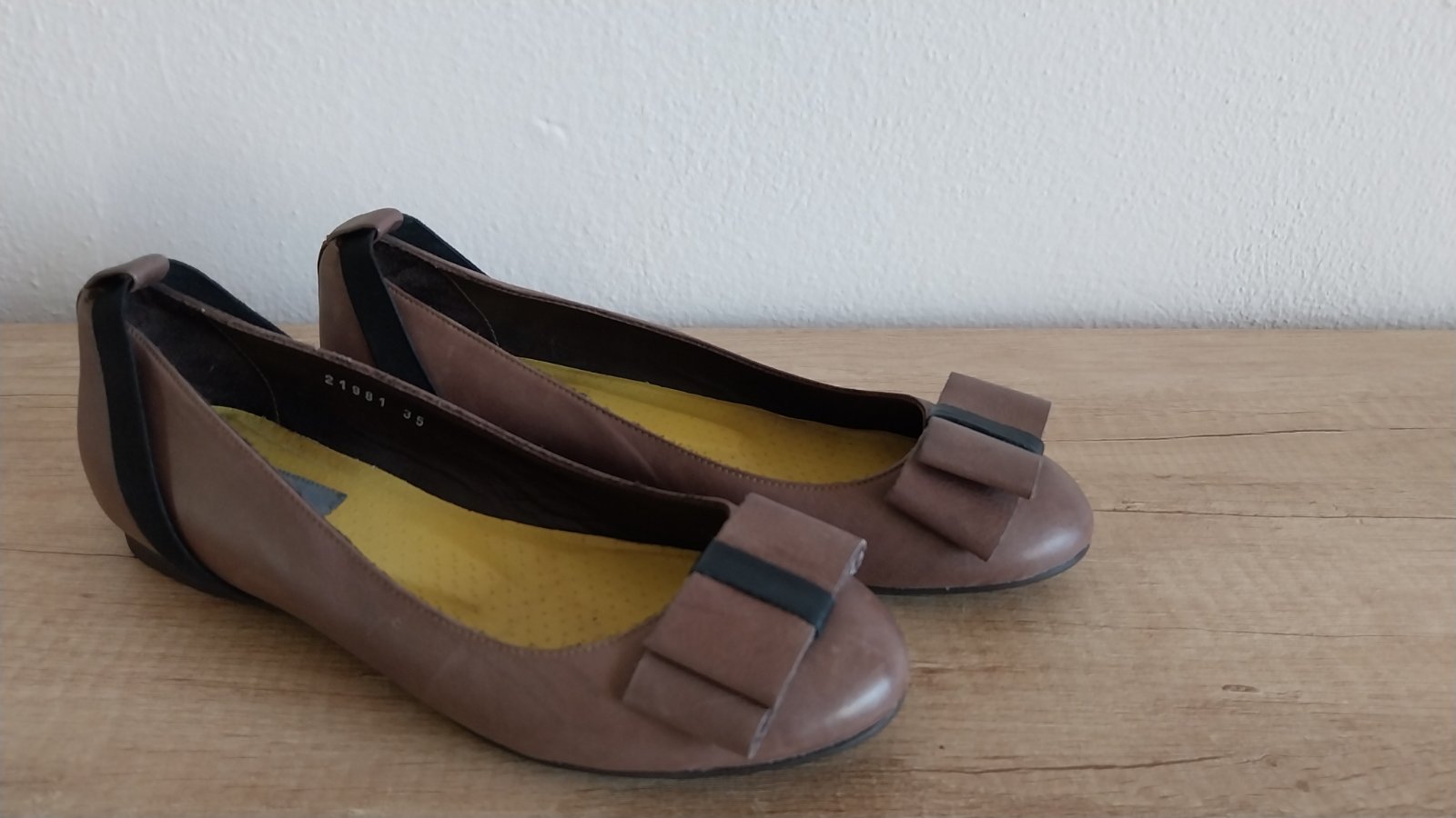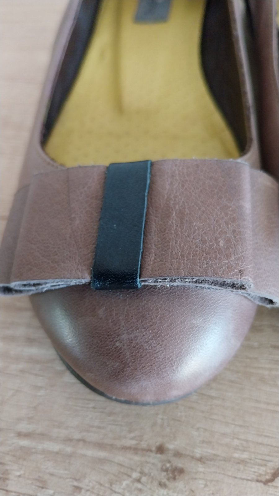 Hnedé kožené baleríny s mašličkou. Anatomická stielka. Obuté 2x, sú nám malé. (10)