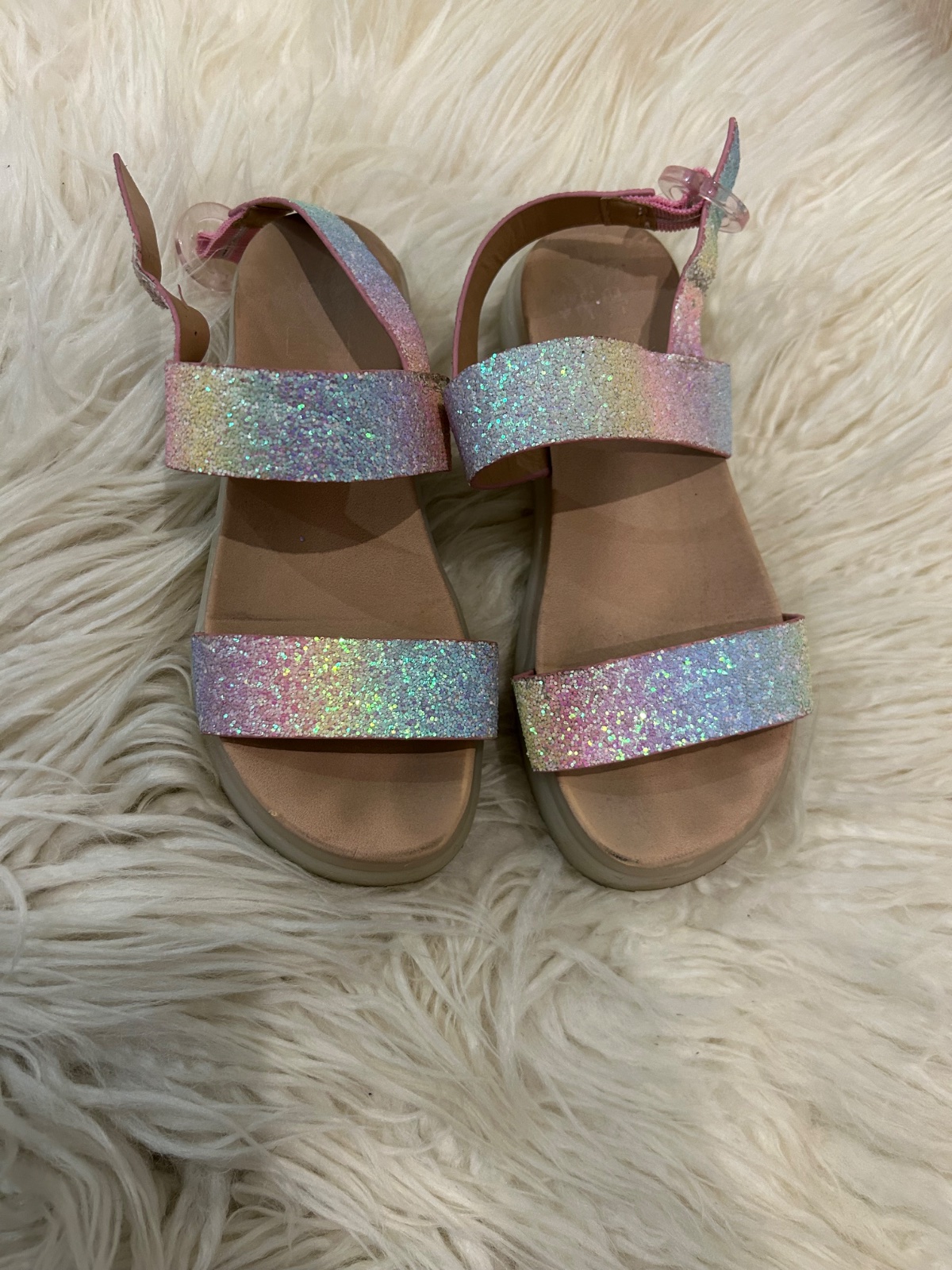 Remienkové sandálky krémovej farby s leskom Zn.F&F, vel.33, vnútorná dĺžka 20,8cm Asi len raz obuté, no vpredu sa stihli mierne okopať Stav ako na foto Zohľadnené v cene