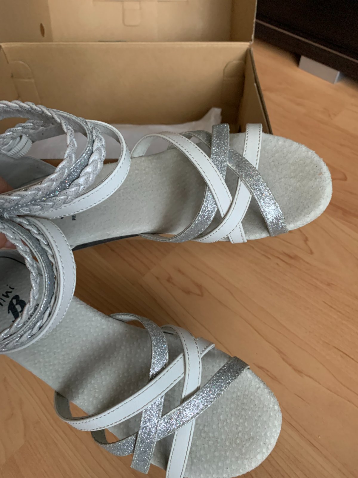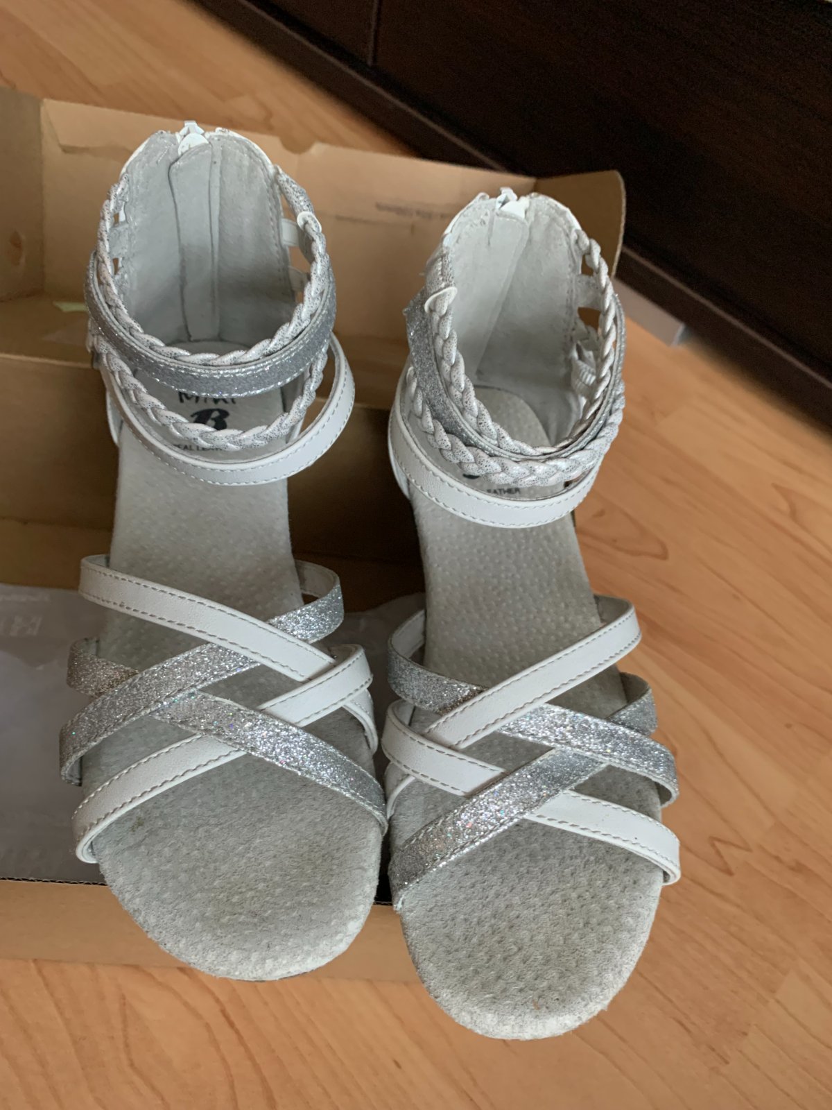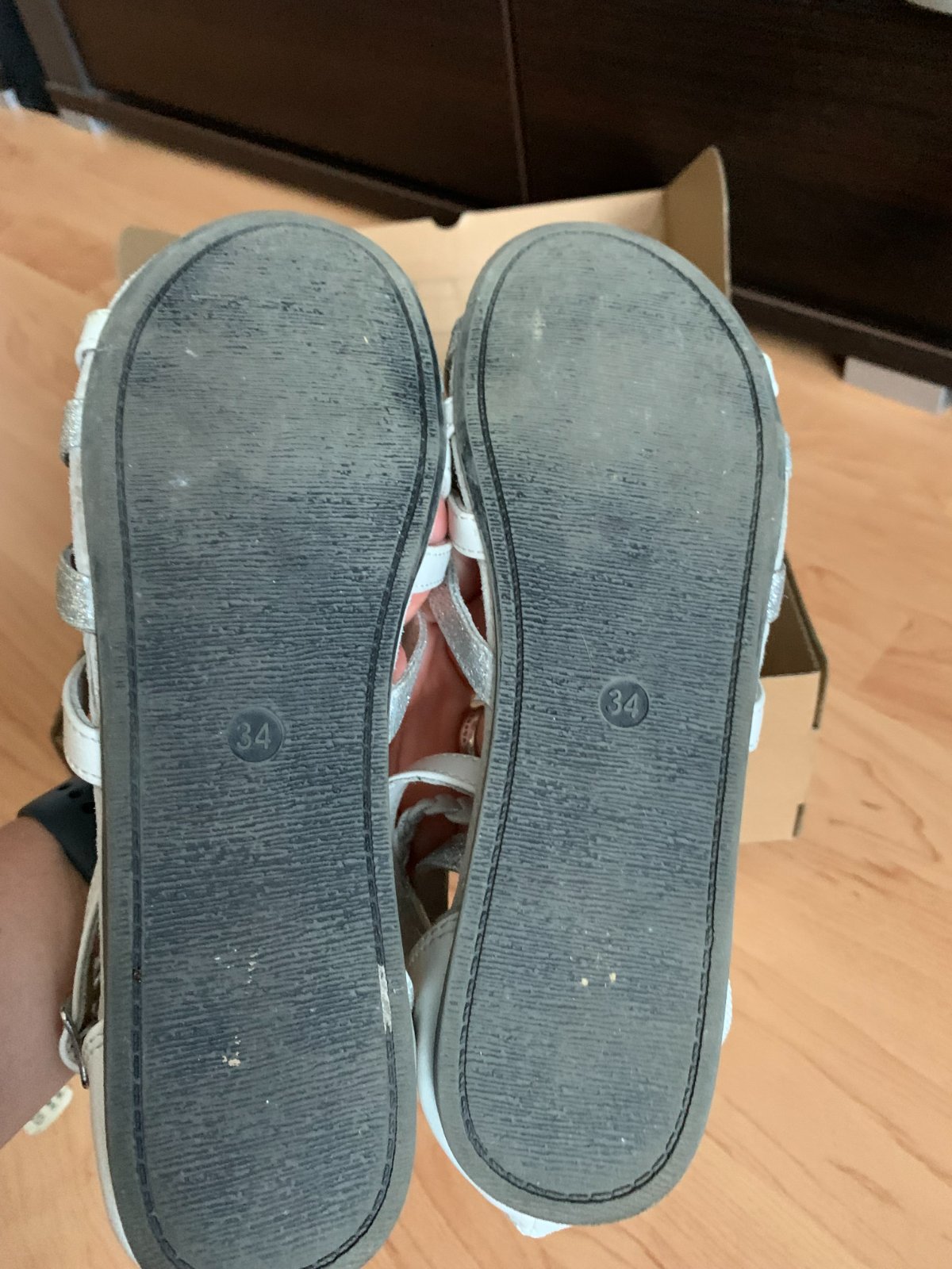 Sviatočné sandálky, veľmi dobrý stav bez poškodení, nosené minimálne, takmer ako nové. Veľkosť uvedená 34, ale odporúčam podľa vnútornej dĺžky skôr na 33.