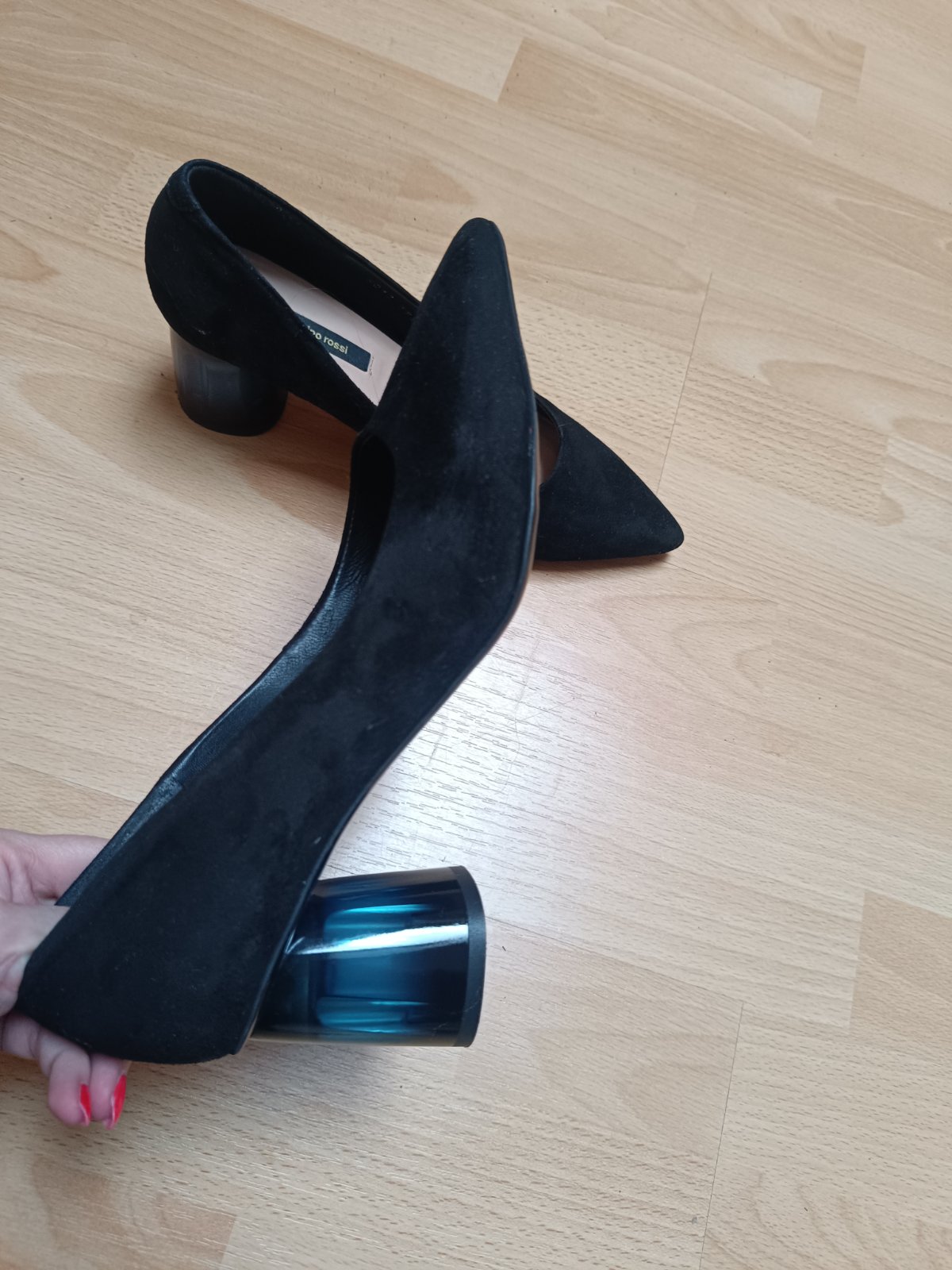 Ihličkové kožené lodičky s plastovým modrým opätkom