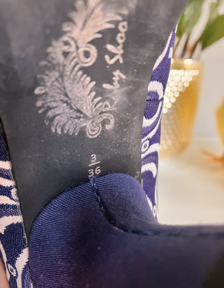 Nadherne lodicky anglickej znacky Ruby Shoo, velkost uvedena 36 (uk 3), vnutorna vlozka 22cm. Tmavo-modre s bielou a cervenymi kvetmi. Malo nosene lebo ma tlacia.