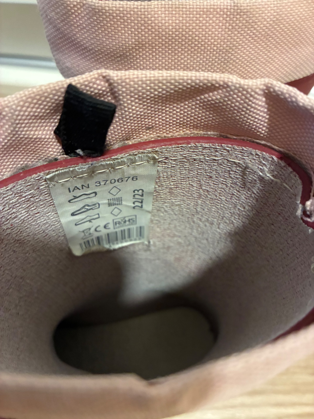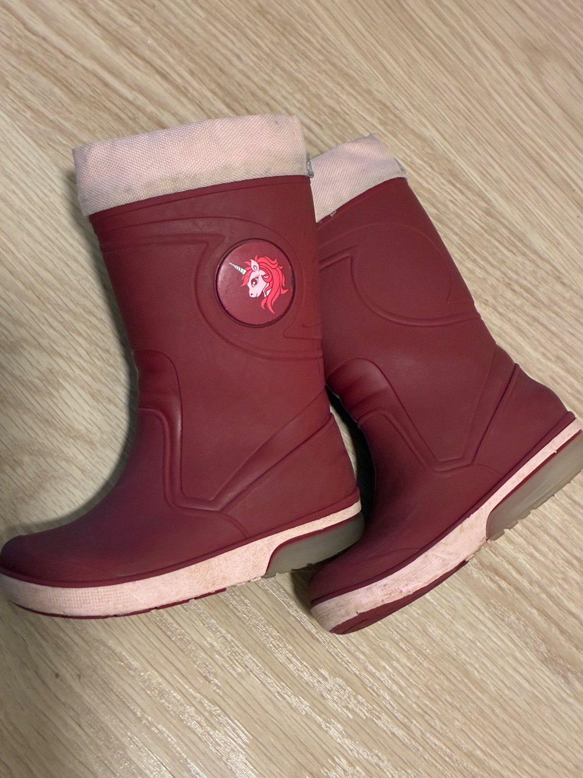 Ponukam nosene, ale v peknom stave gumáky Lupilu. Dievčenské, tmavo bordove s ružovou. Kedysi podpatpk svietil, uz nesvieti. Na funkčnosti to neuberá. Veľkosť 22/23
