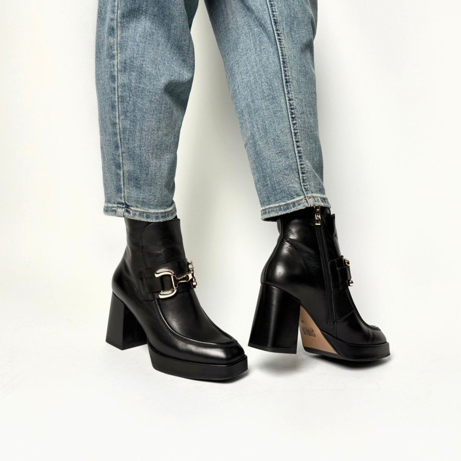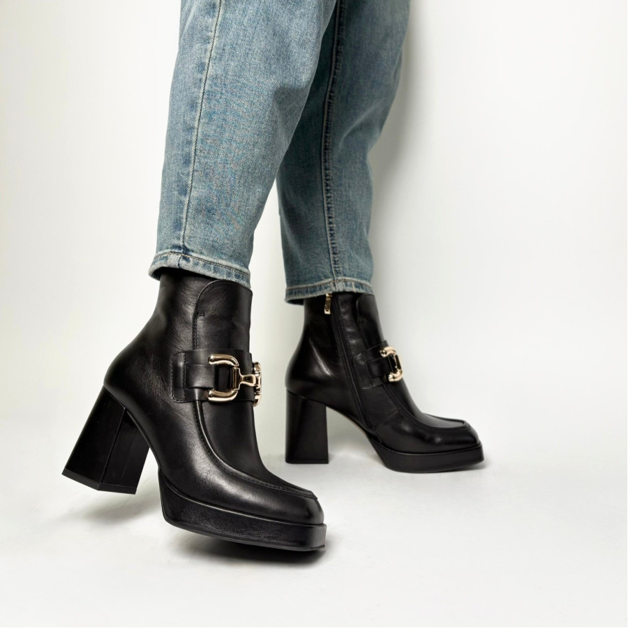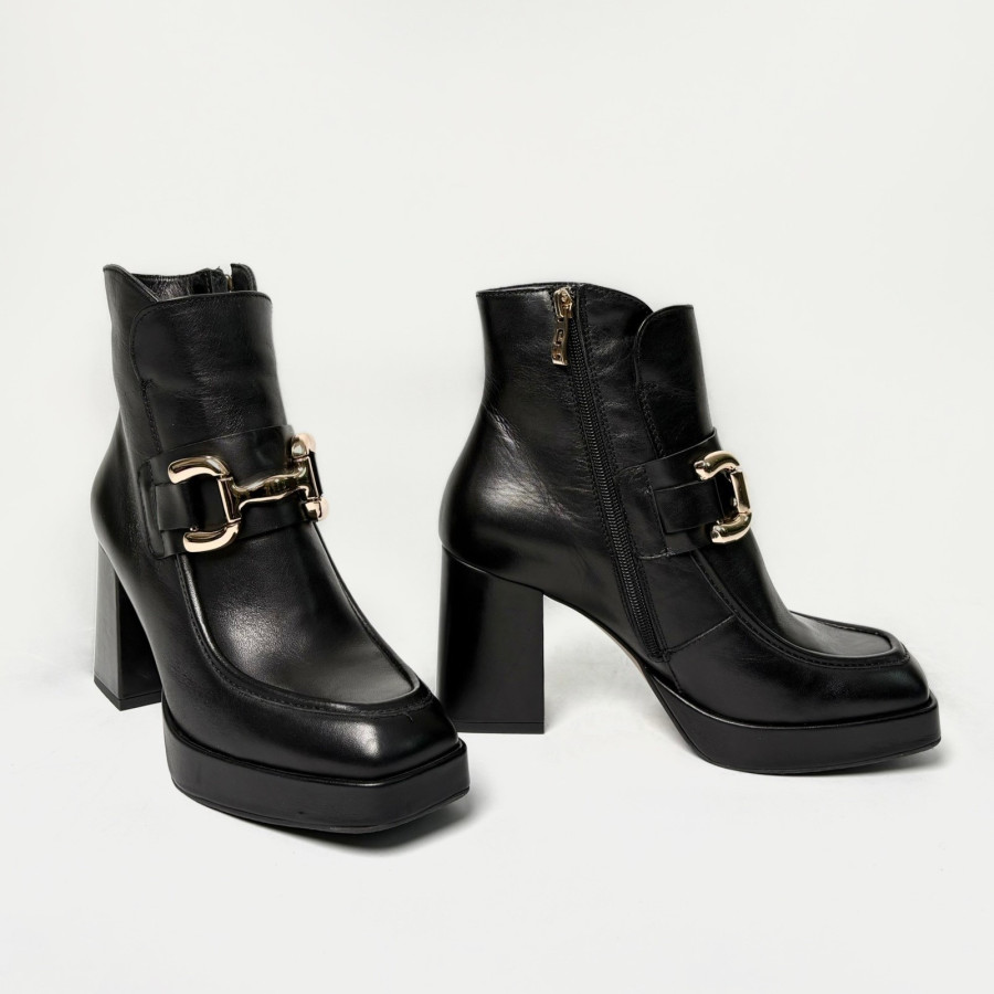 Elegantné dámske členkové čižmy Simen 5646A sú spojením moderného štýlu a vysokej kvality spracovania. Vyrobené z pravej hladkej kože v klasickej čiernej farbe, pôsobia luxusne a vďaka detailu v podobe kovovej ozdoby v zlatej farbe dodávajú outfitu sofistikovaný nádych.