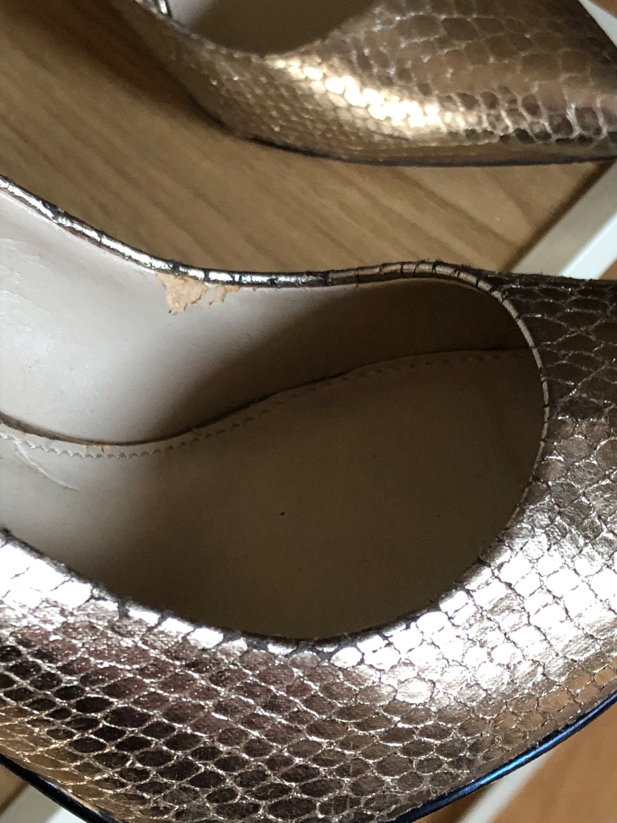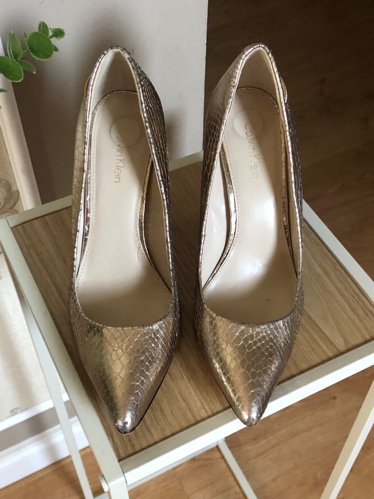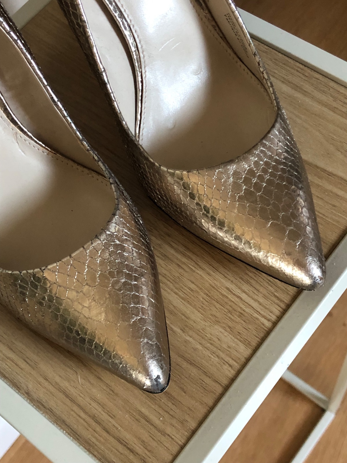 Luxusne lodičky zlatej farby s hadím vzorom, hrubší opätok, super stav, len jemne sú supnuté z vnútornej strany, nič nevidno zvonku.