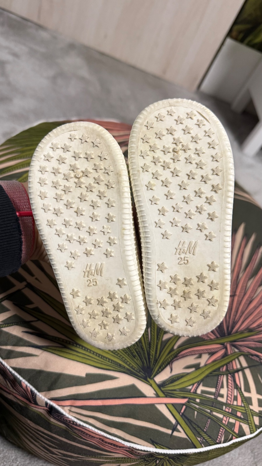 Nosené len príležitostne v nosiči. Po zemi sa s nimi nechodilo. Trochu žmolky. Bez poškodení. Veľkosť písaná 26/27, ale sú trochu menšie. VD: 15 cm.