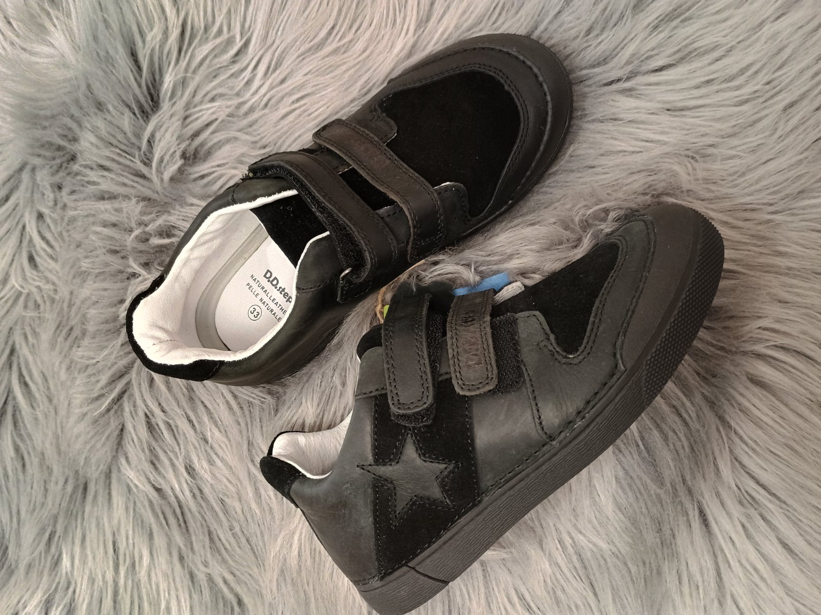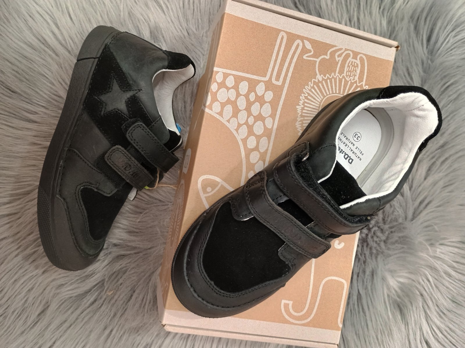 Štýlové čierne detské celokožené topánky s hviezdičkou od značky D.D.Step. Zapínajú sa na suchý zips, takže sa ľahko obúvajú. Majú tvarovanú stielku, ktorá je pohodlná. Výhodou je vyvýšená guma v prednej časti, ktorá bráni okopávaniu topánok. Topánočky sú vyrobené z kvalitného koženého materiálu