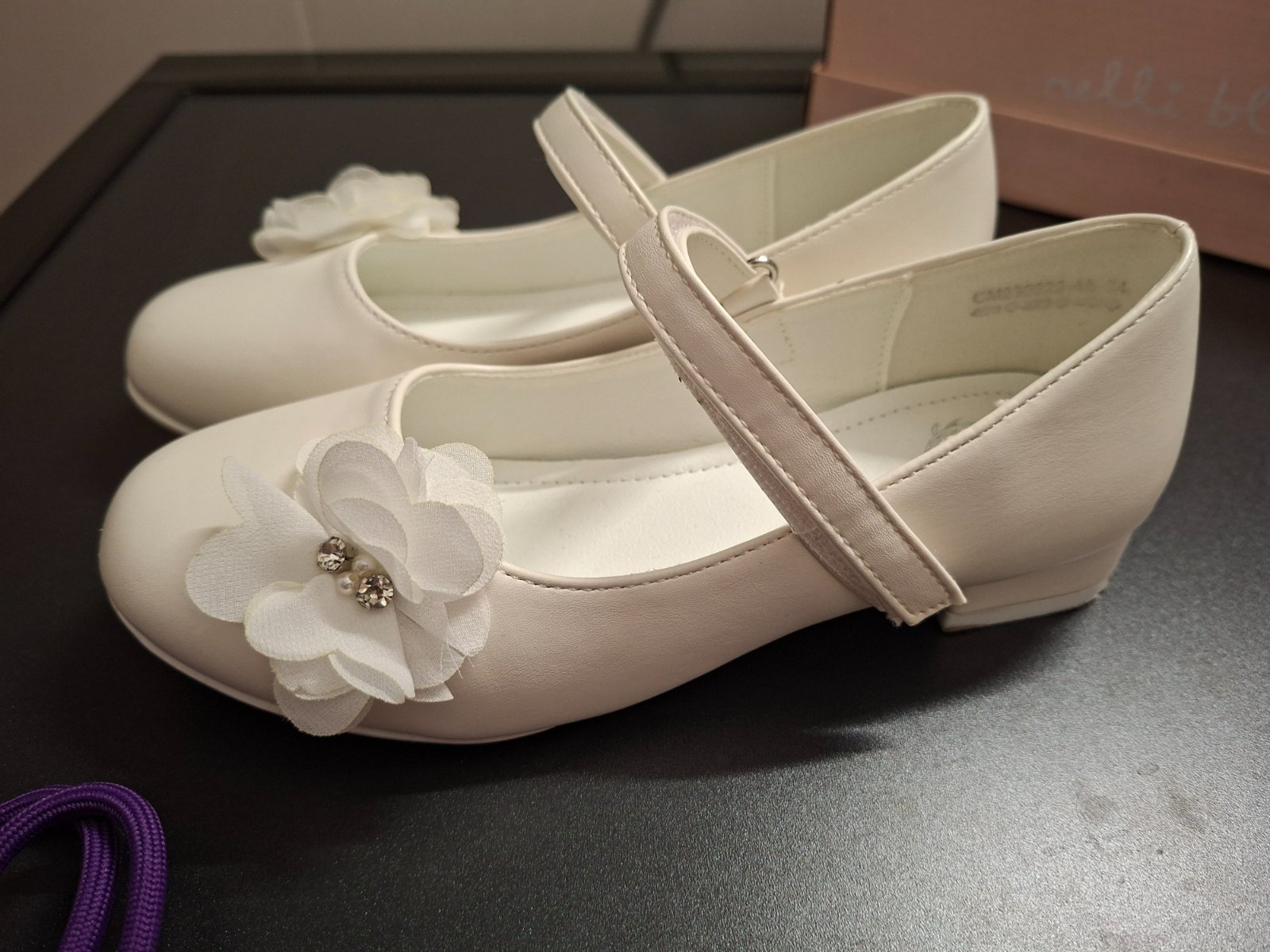 Dievčenské topánočky vhodné na 1.sv.prijímanie, číslo 34.Sú pohodlné. Vpredu na špičkách úplne minimálne viditeľné škrabančeky- pri dlhých šatách nič nevidno.