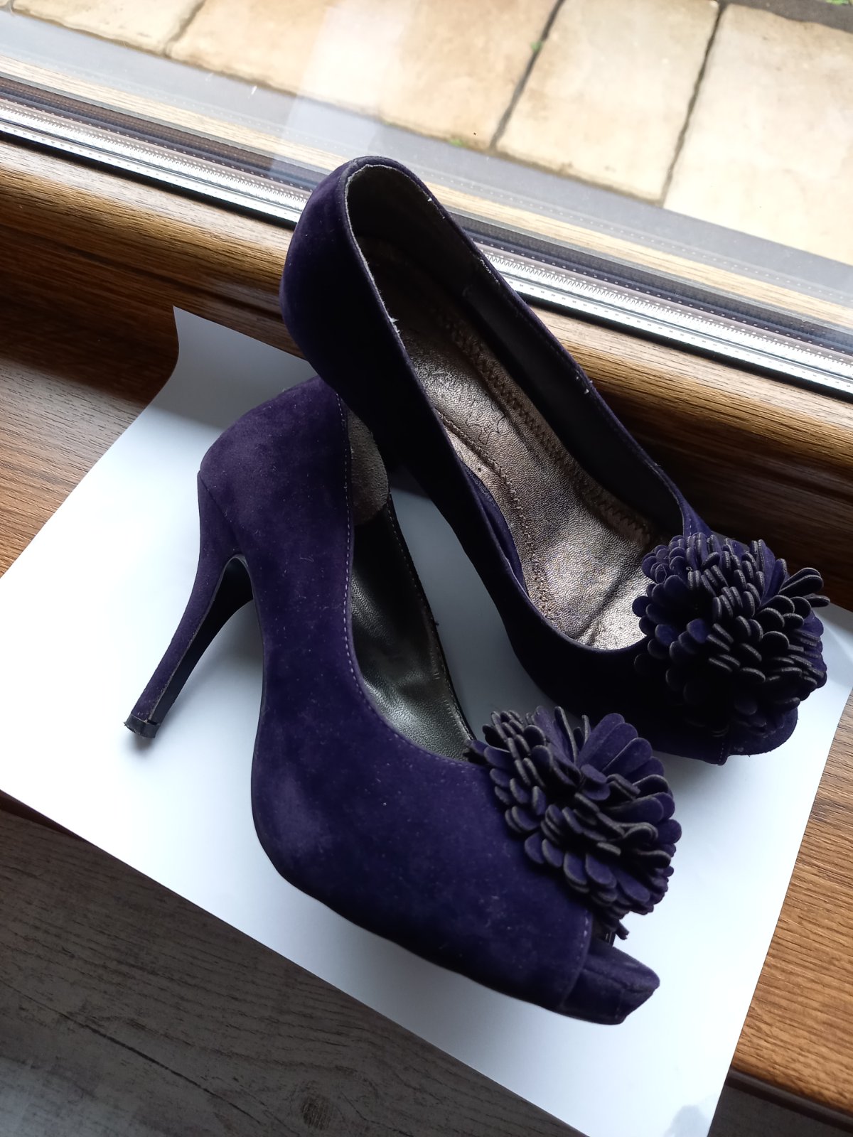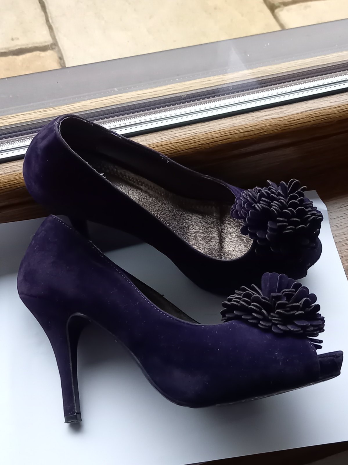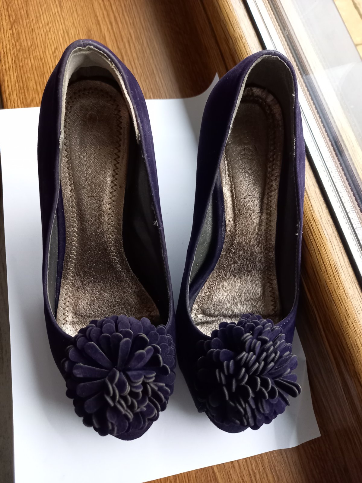 Pohodlné štýlové športovo-elegantné topánky. Nosené, pätníky sú na okrajoch mierne zošľapané, inak vo veľmi peknom stave. Výška opätku 7 cm. Farba je tmavošedá, špičky modré, vrch topánky je vo fia...