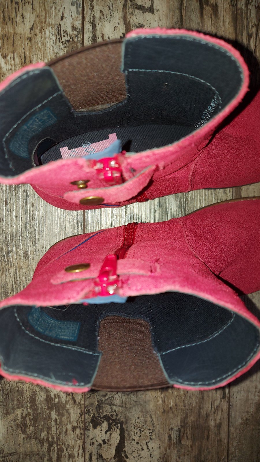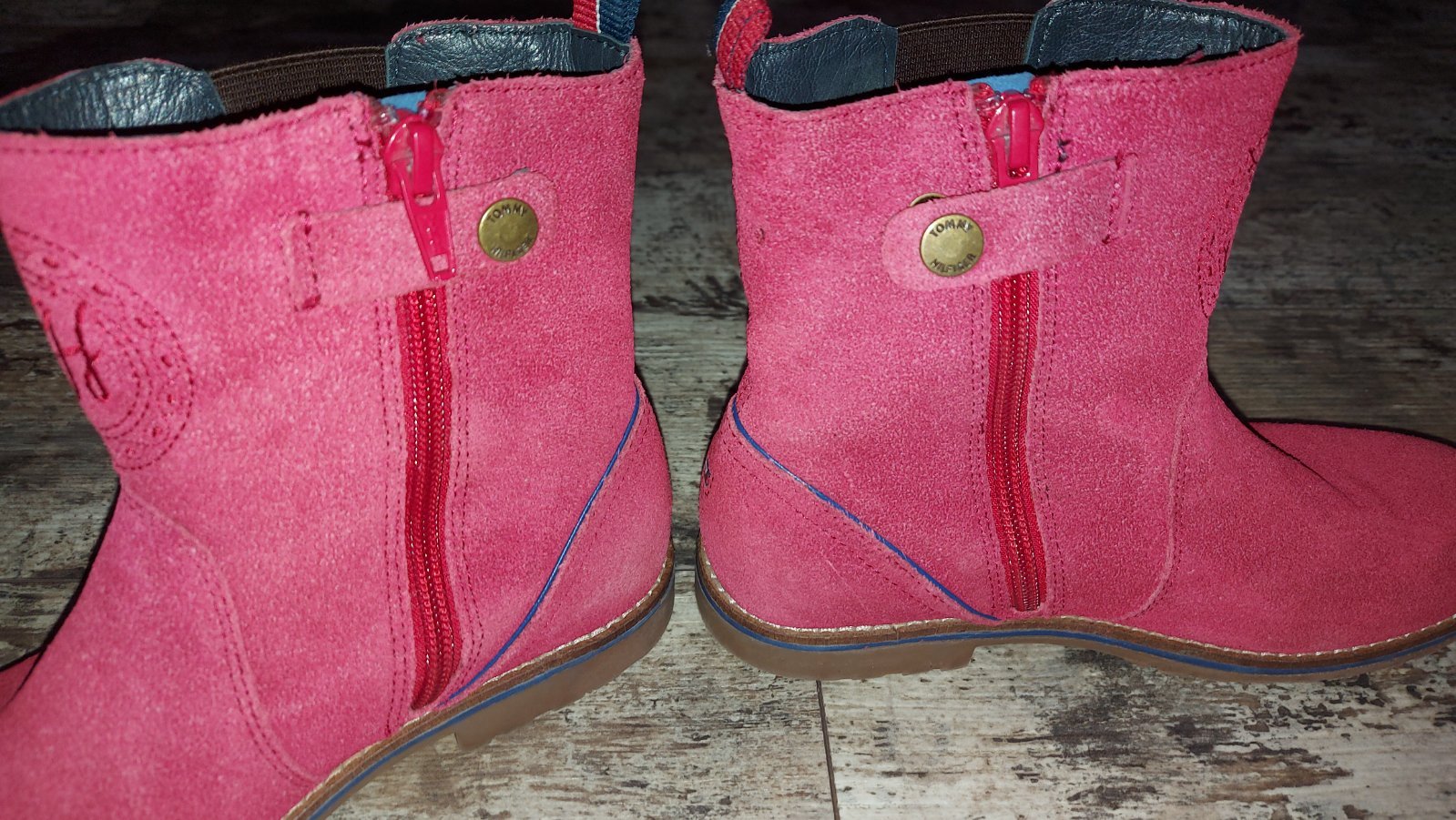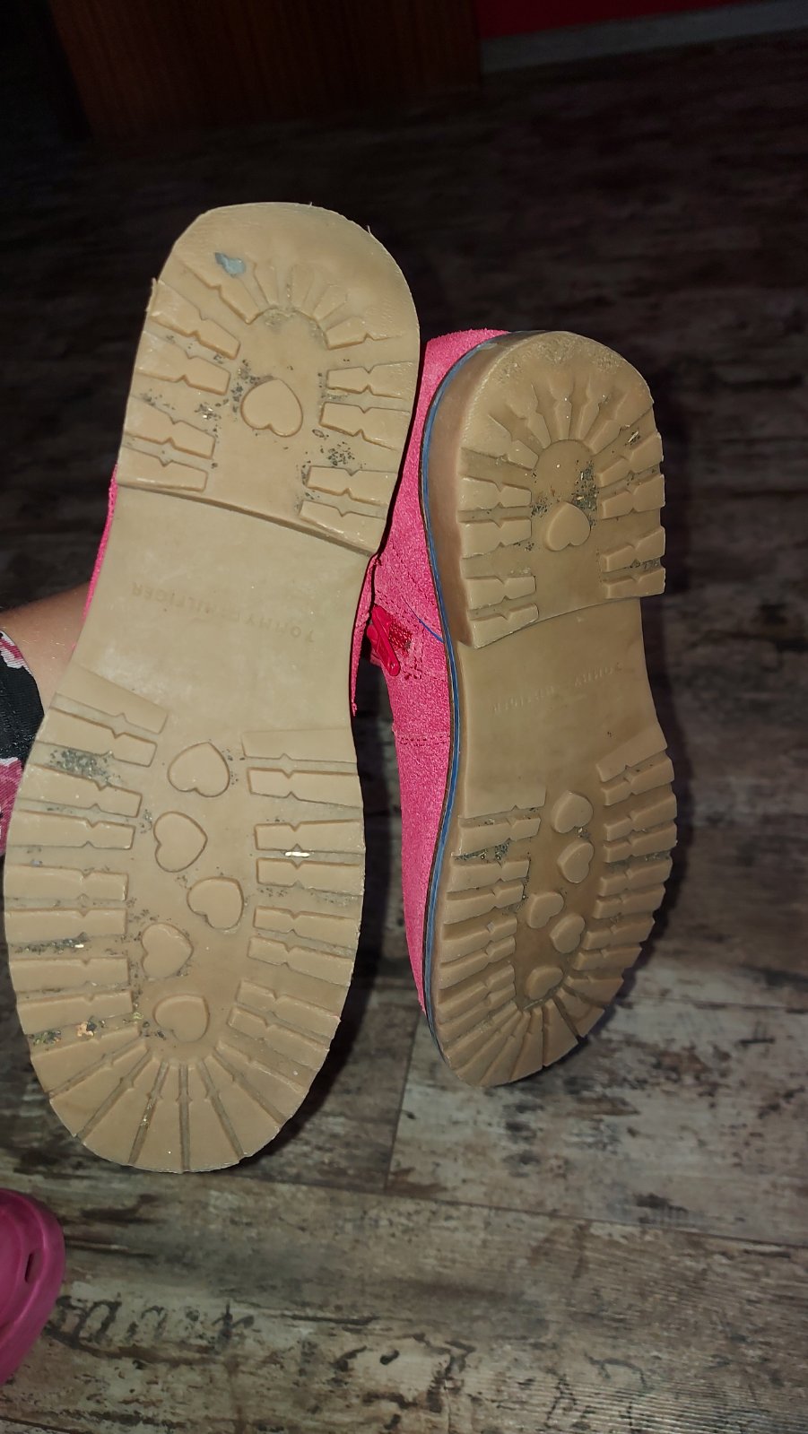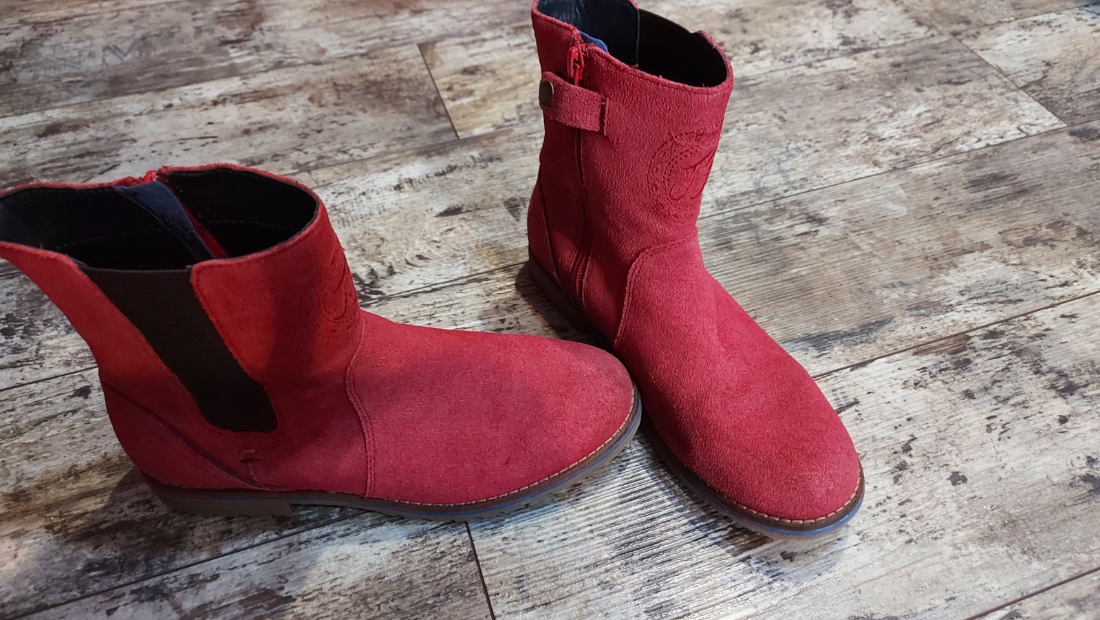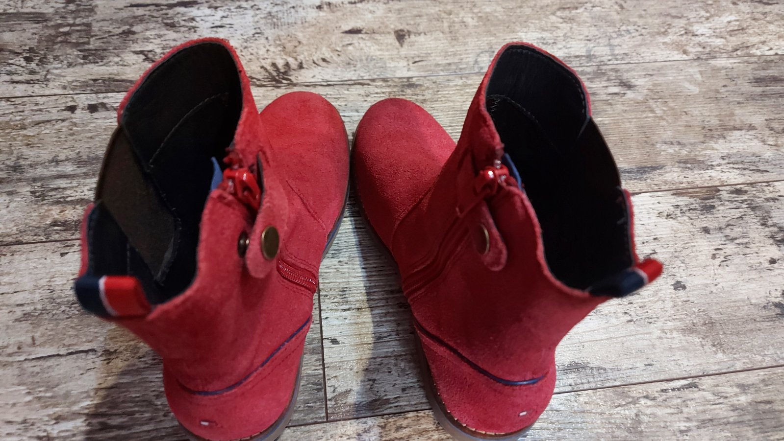 Zachovale polocizmicky, nezateplene, kozenne, na vrchu brusena koza. Farba je menej vyrazna ako na obrazkoch,skor tmavocervena, ale nie taka syta, najviac podobna je ta, kde je logo TH. Su velmi pekne,tak ako na brusenej kozi su tam farebne odtiene. Nasla som tam miniaturnu odreninku alebo co to je (vid foto), pata mierne schodena. Odfotila som aj zo spodku, potrebovali by doumyvat podrazky,ale uprimne sa mi uz s tym nechce hrat. Topanky, ktore urcite zaujmu a zvyraznia outfit. Vnutorna dlzka 22,5 cm do 23 max.