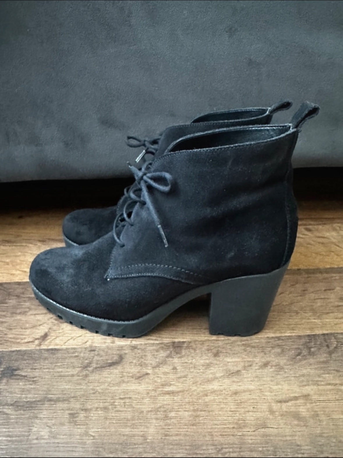 Ponúkam krásne čierne kožené kotníkové čižmy na šnurovanie s traktorovou podrážkou na podpätku. Značka je originál Tommy Hilfiger a veľkosť 39, vnútornú dĺžku som namerala 25cm-25,2cm. Ja nosím 40-...