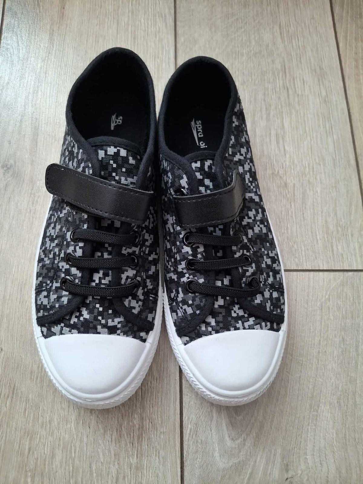 Úplne nové chlapčenské tenisky. Synovi, žiaľ, kvôli vysokému priehlavku nesadli. Farba je taká zvláštna - šedozelená, viac asi šedá ako zelená. Pôvodná cena 29,95 €.
