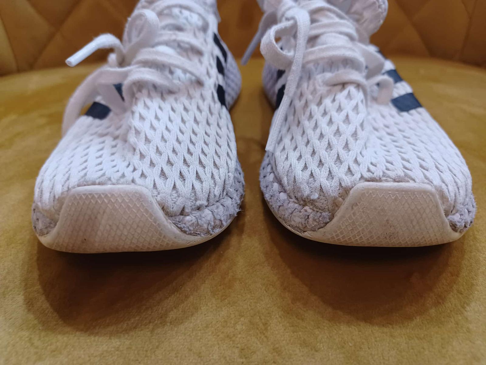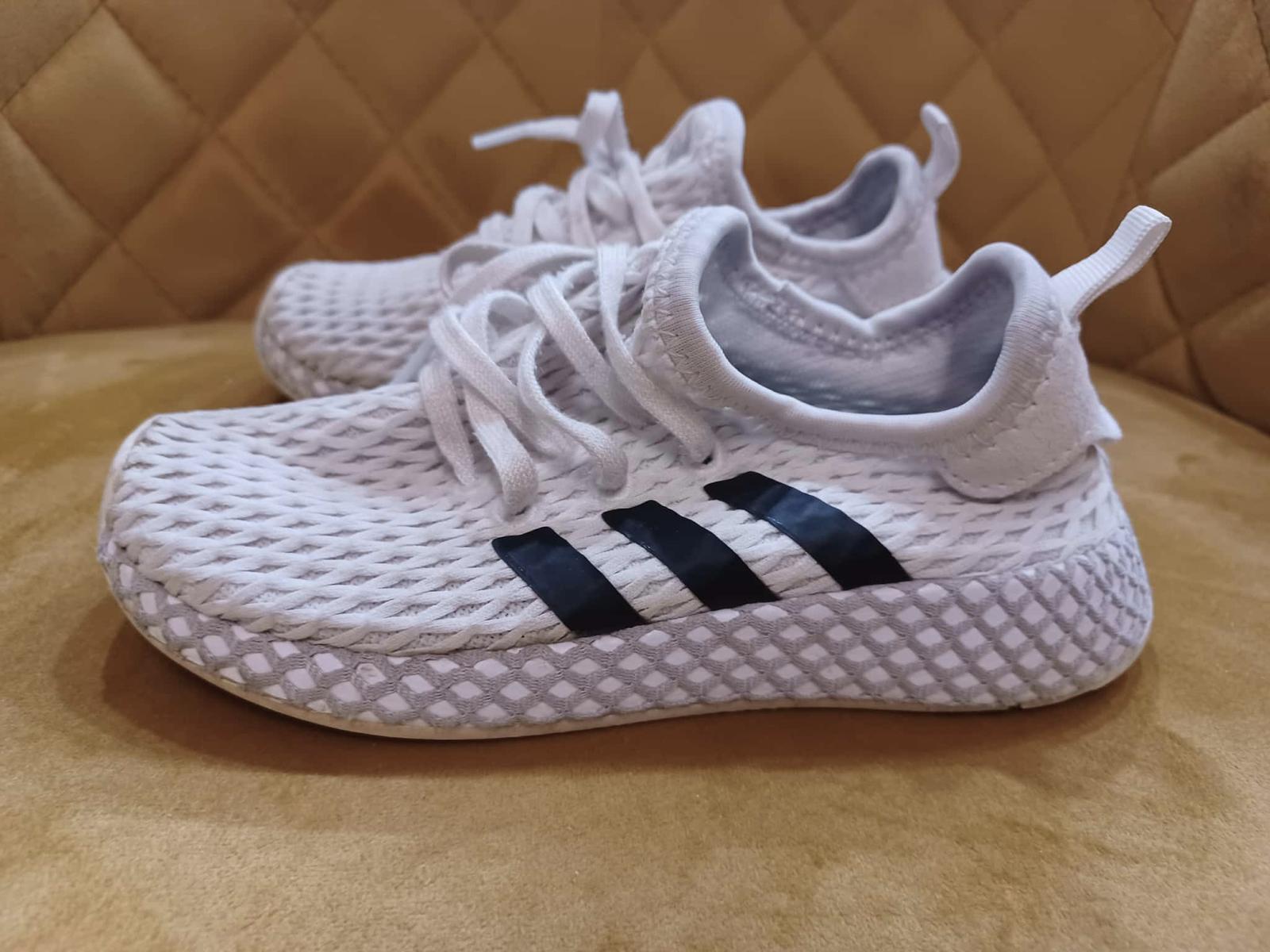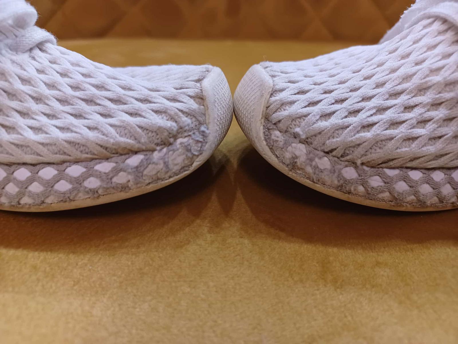 Vzdušné ohybné tenisky. Nie sú žiarivo biele (ale neprala som ich) a pri podrážke je vrchná časť "sieťky" ošúchaná - viď foto. Sú to našuchovačky, ktoré sa dajú dotiahnuť šnúrkami.