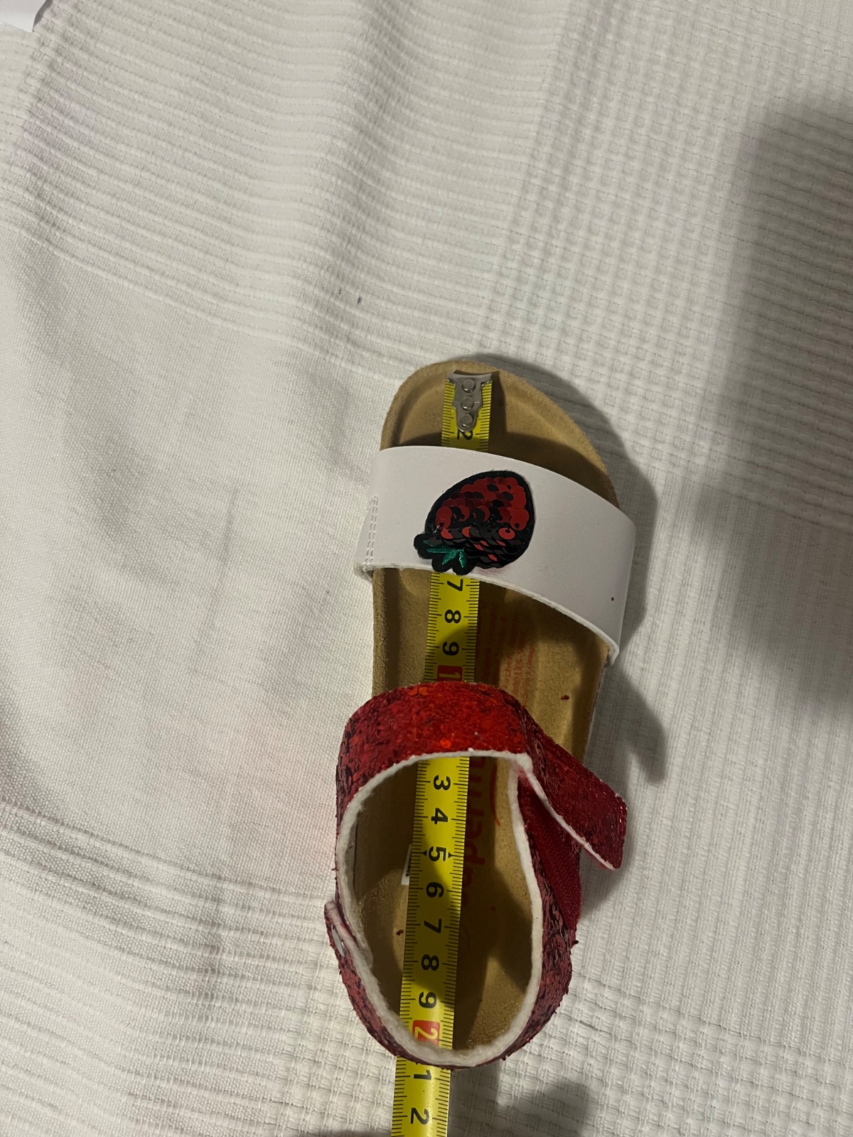 Krásne sandálky s trblietkami na remienku okolo nohy a flitrovou jahodou. Obuté pár krát.