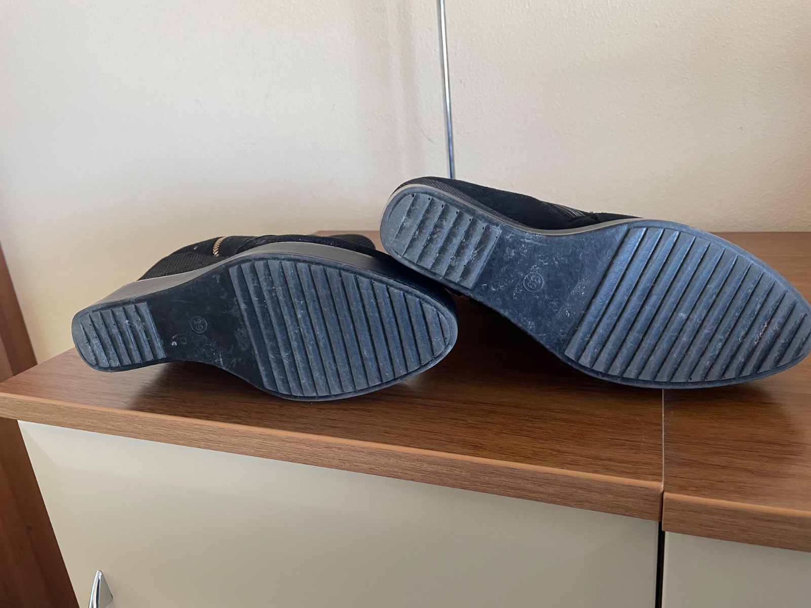 POnúkam krásne čierne čižmy na vysokom opätku. Opätok je vysoký 10 cm, farba krásna sýta čierna. Napriek vysokému opätku sú veľmi pohodlné. Sú takmer nenosené, obuté možno dvakrát do kostola.