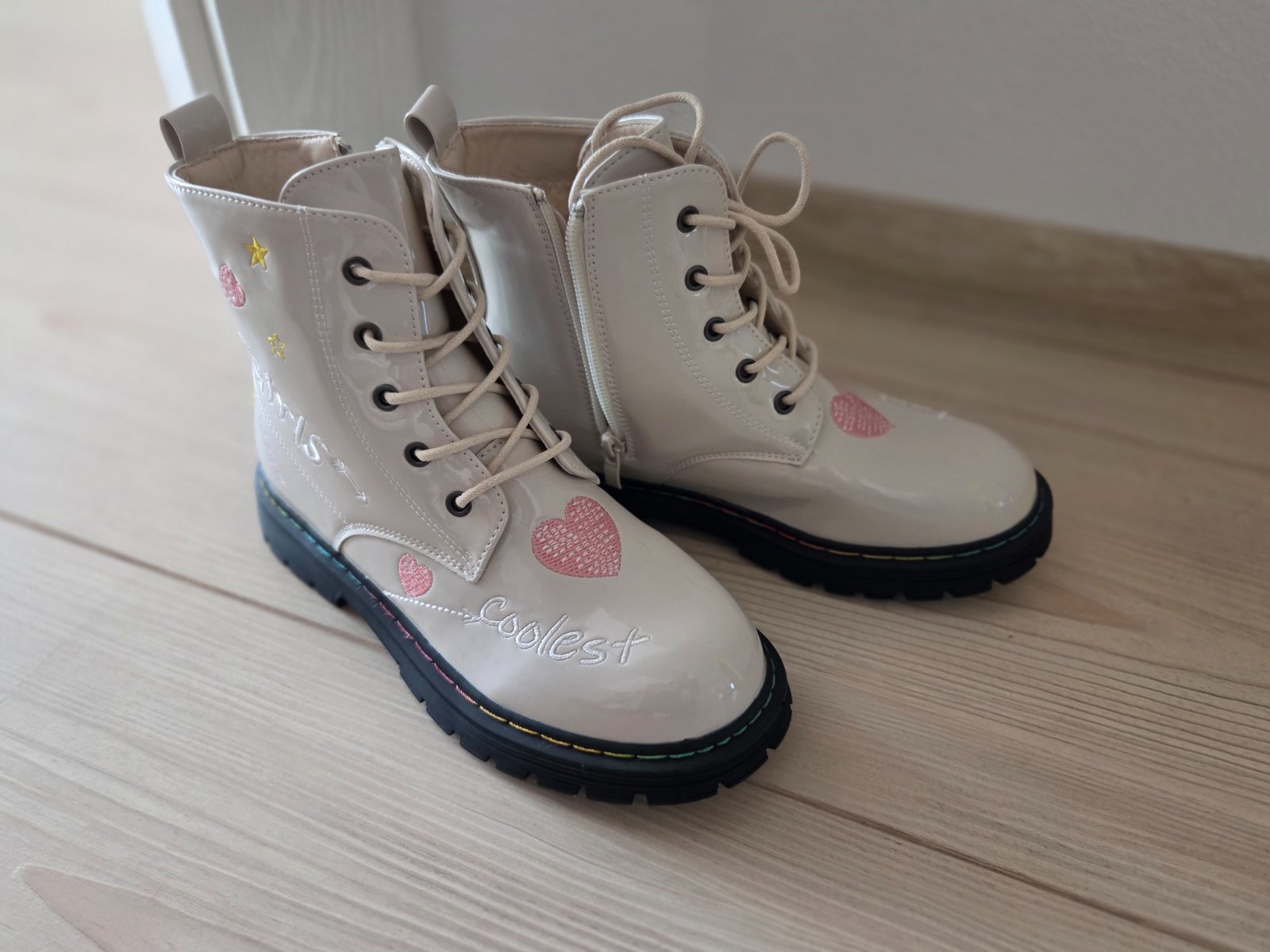 Pár krát obuté, krémová farba, celokožené, zvršok brúsená koža, spredu šnurovanie pre ideálne napasovanie na nohu, zboku zips pre ľahké obúvanie. Na boku sa zafarbili od riflí, nič strašné, možno b...