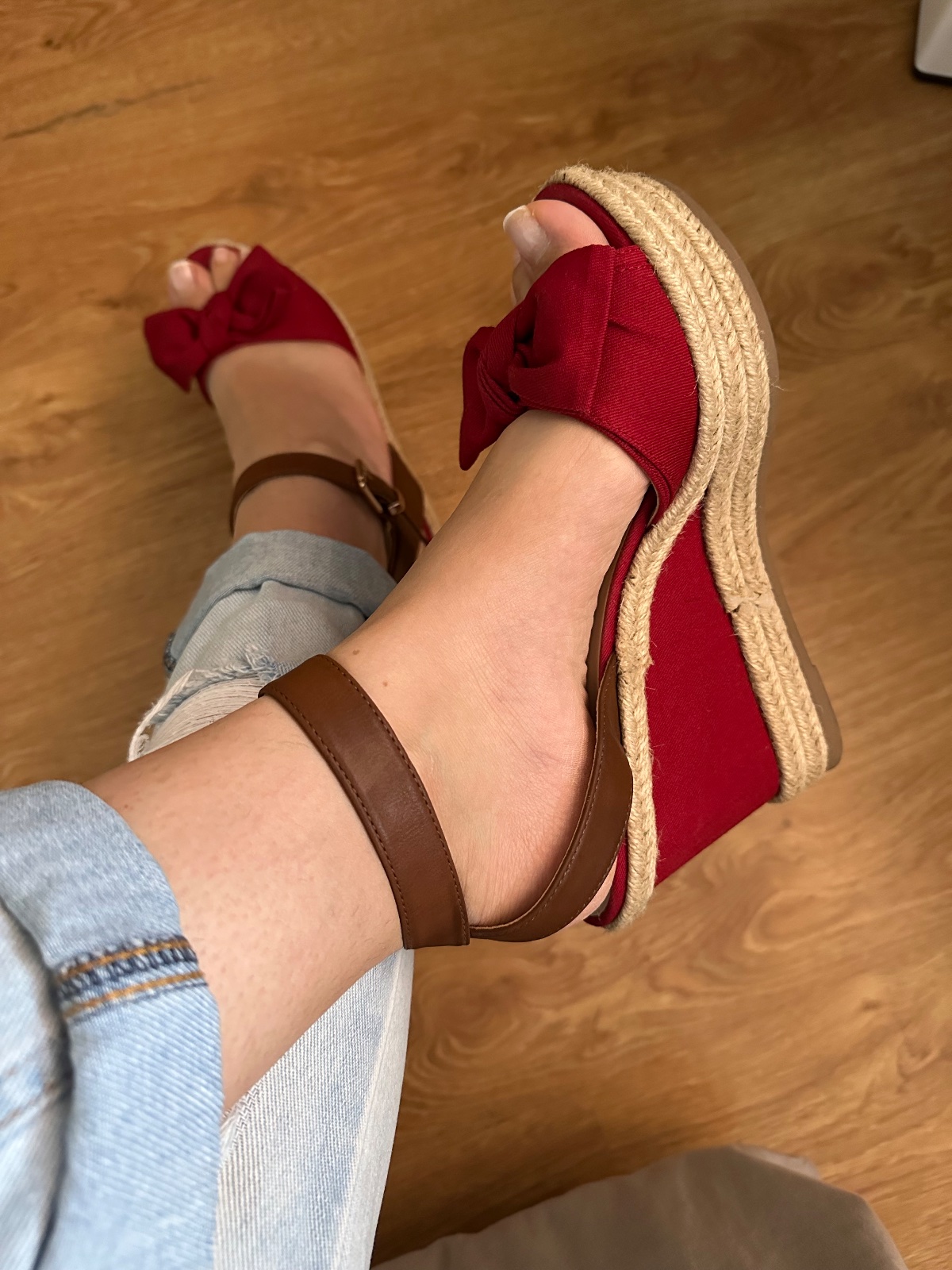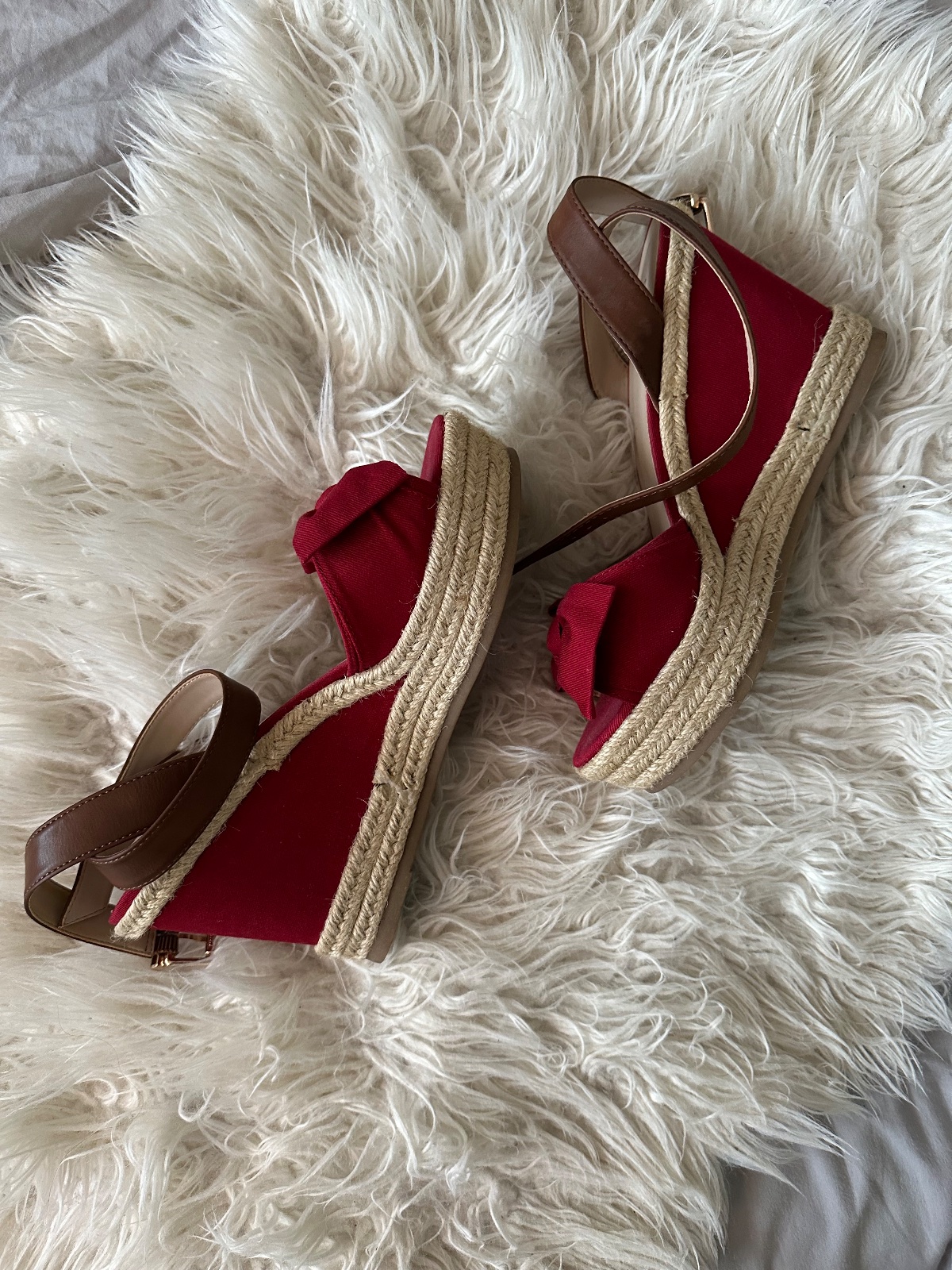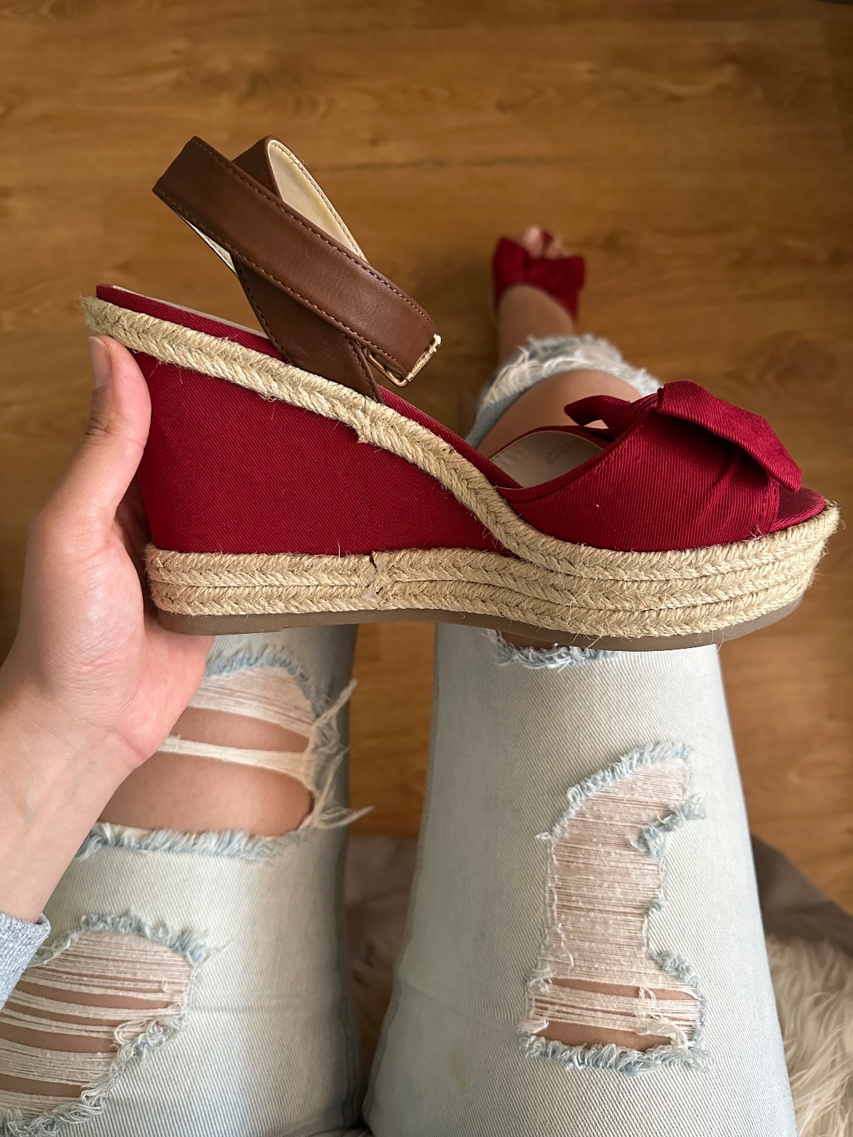 Vsuvky sú kožené s klinovým opätkom, ktorého výška je cca 6cm. Farba je matná červená. Na topánke je uvedená veľkosť 39, ale rozmerovo je to skôr 38, dĺžka topánky je 25 cm.