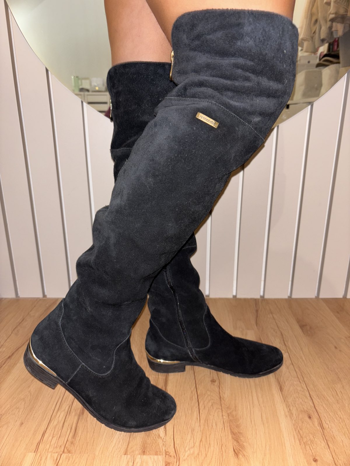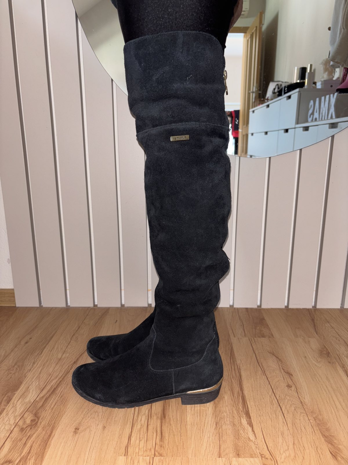 Výborný stav, kožené, brúsená koža, modré, nad koleno, zateplené, veľkosť 37,aj na 37.5
