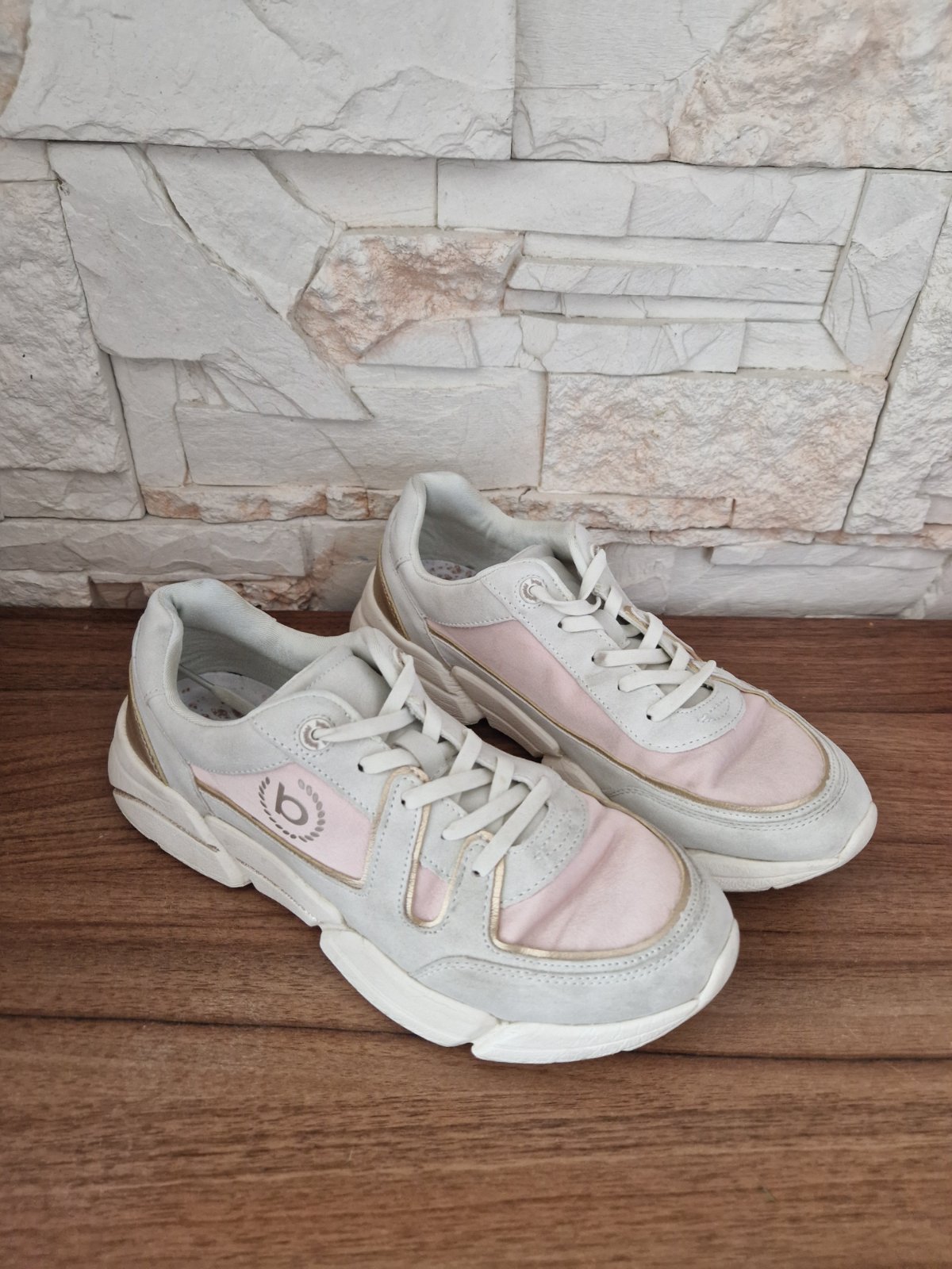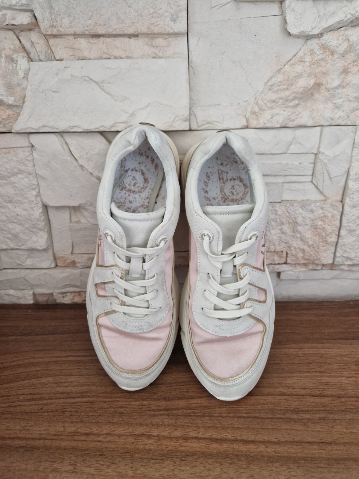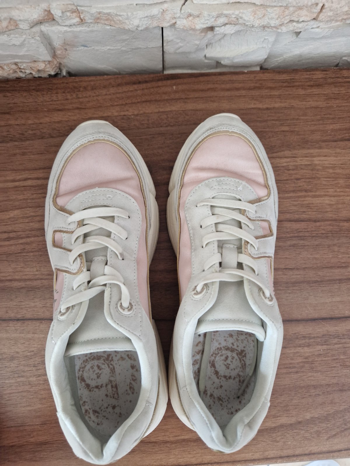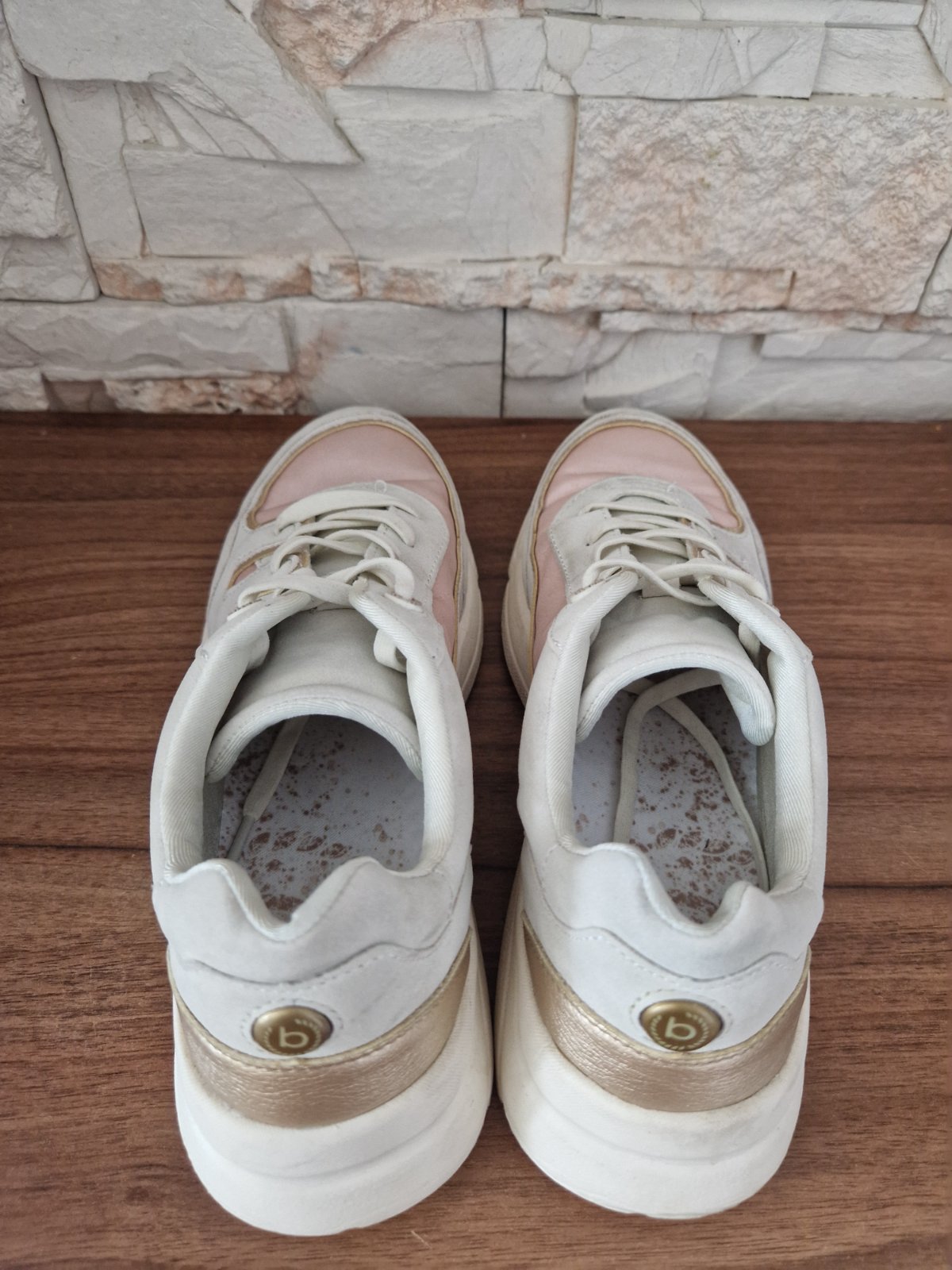 Predám štýlové tenisky zn.Bugatti. Asi 3x obuté. Takže vo výbornom stave. Veľkosť uvedená 41, ale mňa tlačia, takže sedia na 40tku. Z tohto dôvodu ich posúvam. Krásne farebné prevedenie - kombinácia krémovej, zlatej a staroružovej.