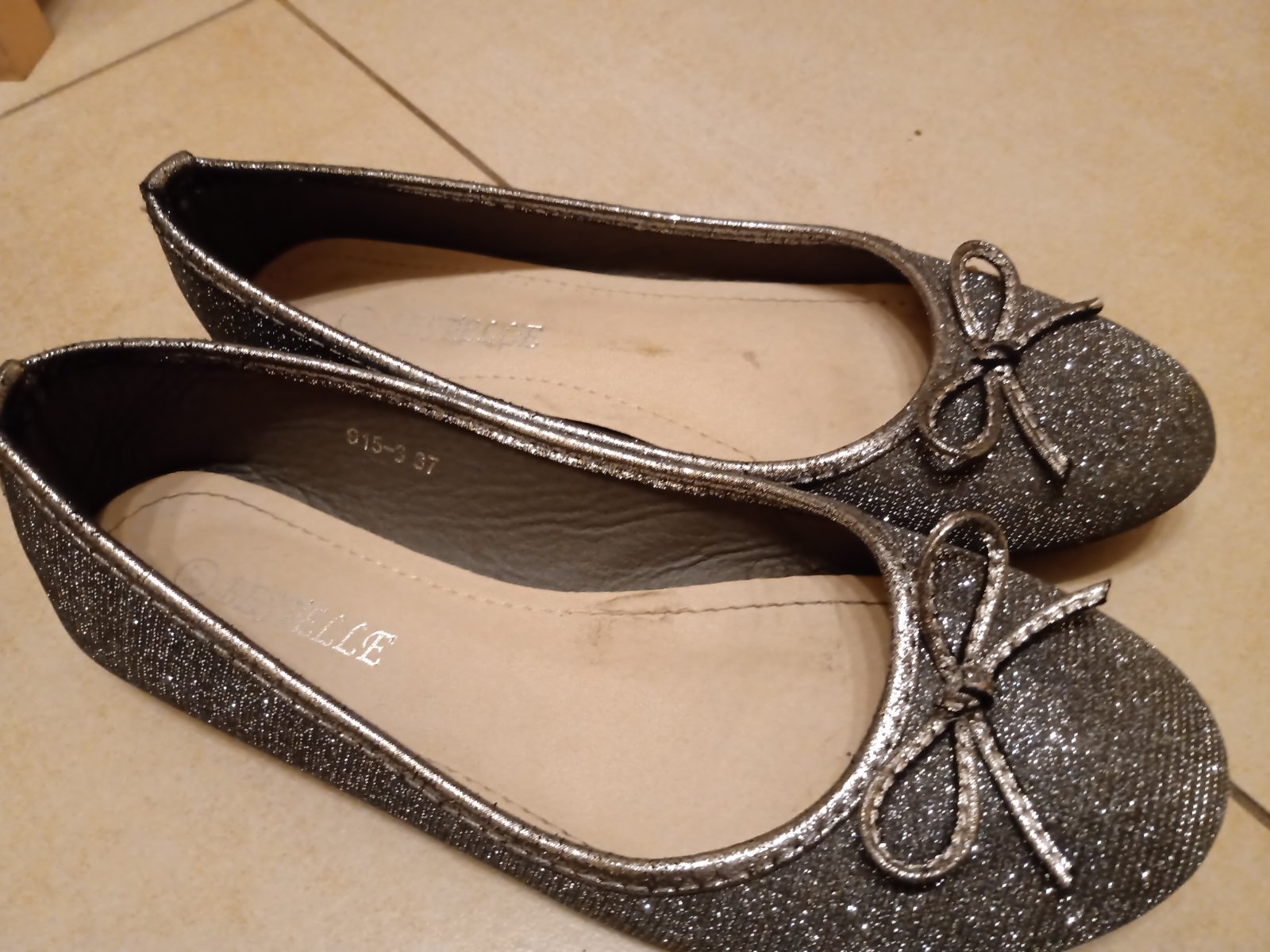 Tamaris baleríny striebornej farby, ako nové, označená veľkosť 37 ale sedia skôr na 38, vnútorný rozmer 24 cm
