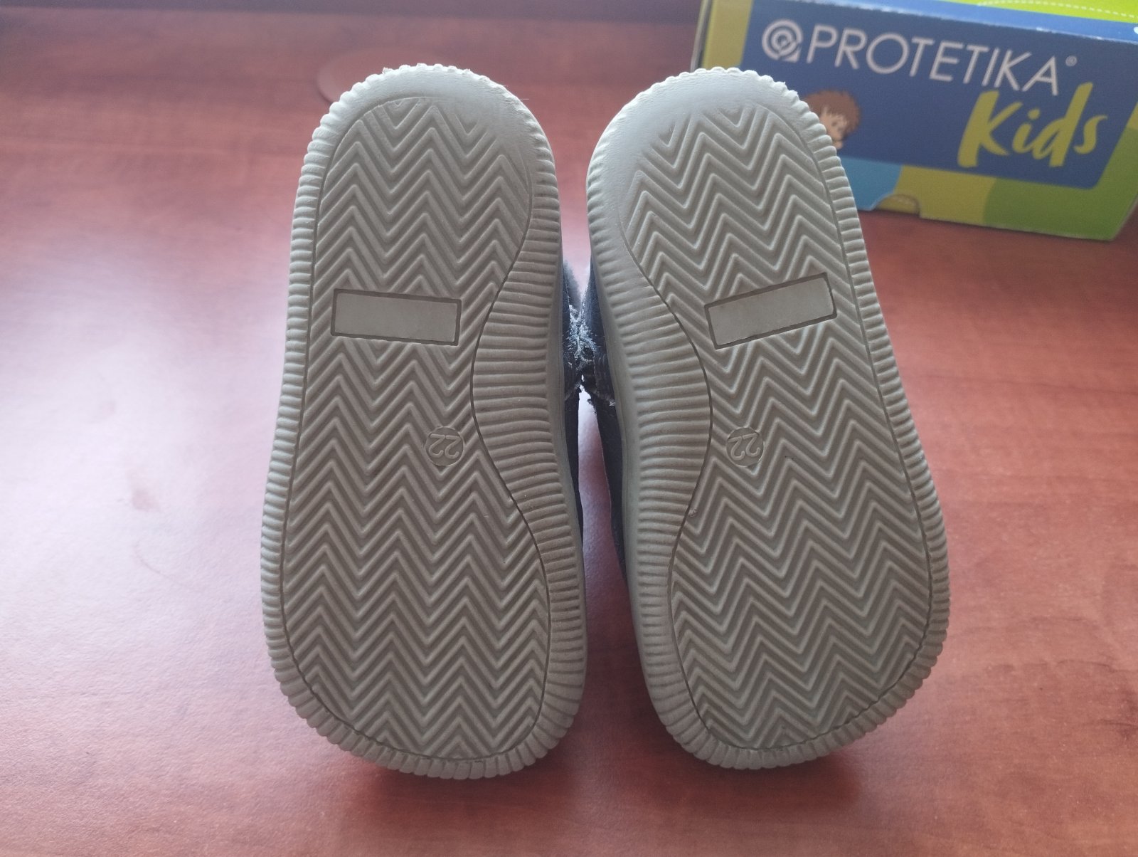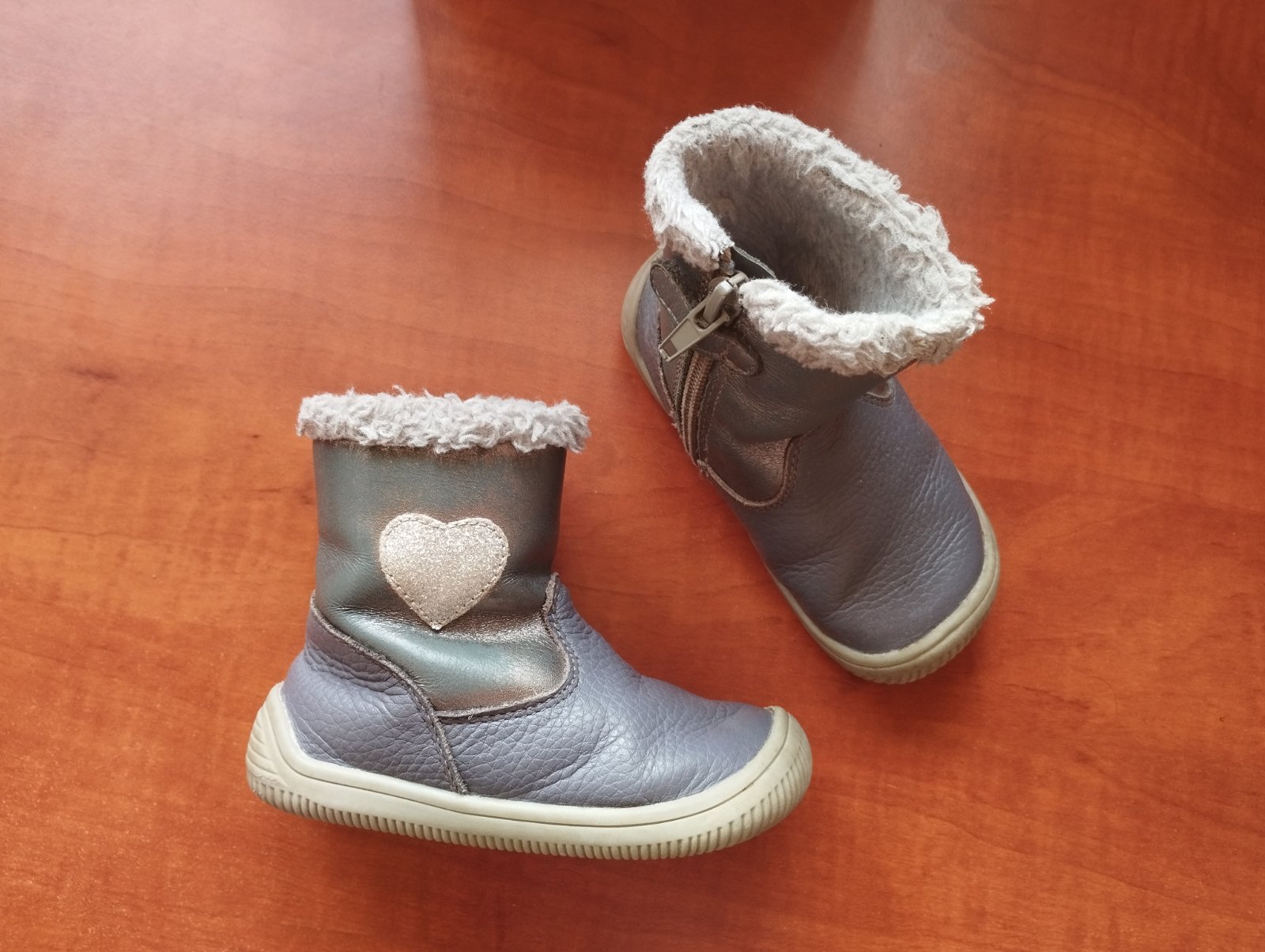 Zateplené barefoot čižmy nosené 1 sezónu. Strieborná farba sa z vonkajšej ušne trocha zosúchala hneď po pár obutiach, je to zohľadnené v cene. Ináč sú vo veľmi peknom stave, podrážka odolná, ale ohybná do všetkých strán, podporí chôdzu začínajúcich chodcov.