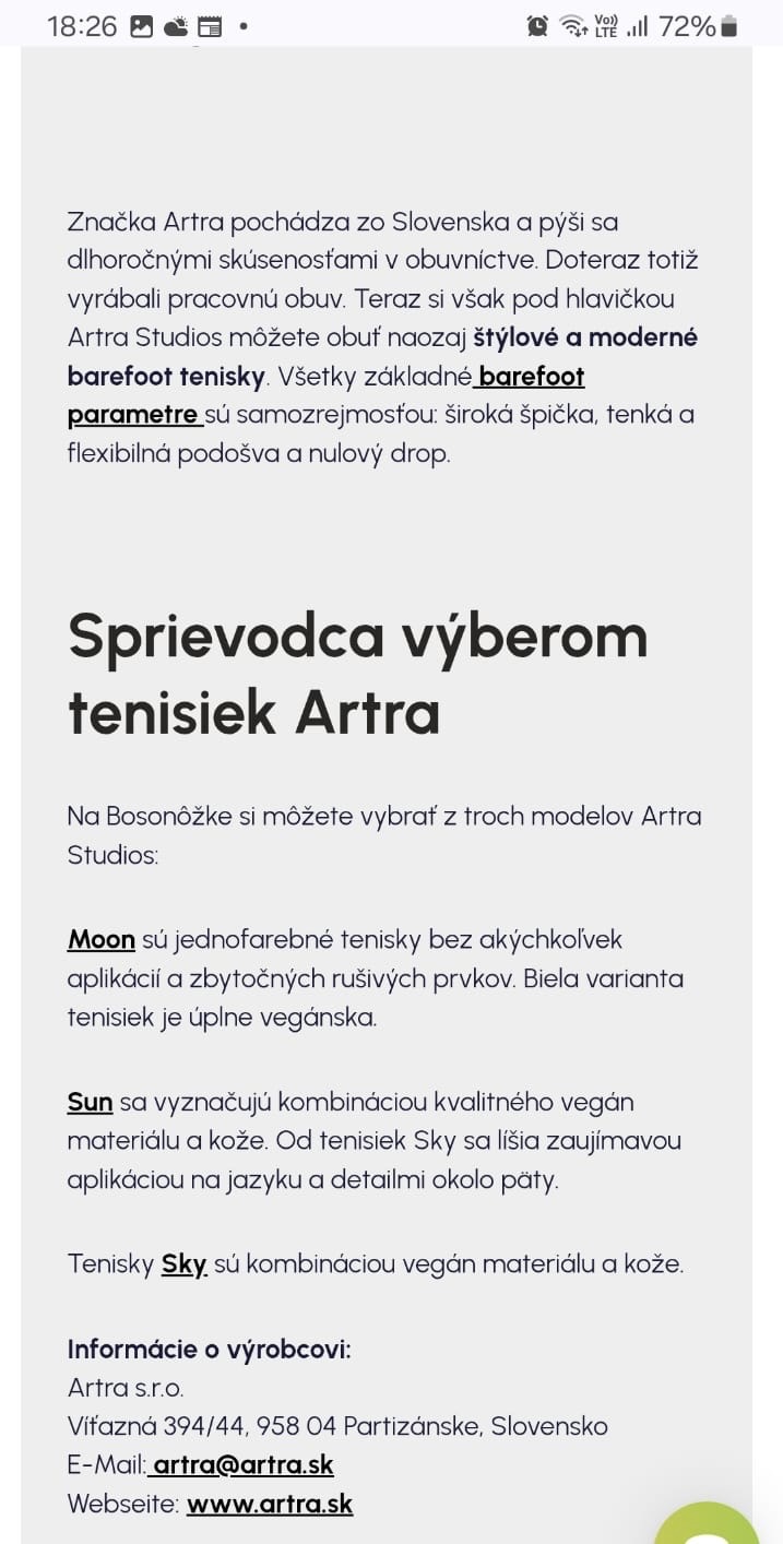 Značka Artra pochádza zo Slovenska a pýši sa dlhoročnými skúsenosťami v obuvníctve. Doteraz totiž vyrábali pracovnú obuv. Teraz si však pod hlavičkou Artra Studios môžete obuť naozaj štýlové a moderné barefoot tenisky. Všetky základné barefoot parametre sú samozrejmosťou: široká špička, tenká a flexibilná podošva a nulový drop.