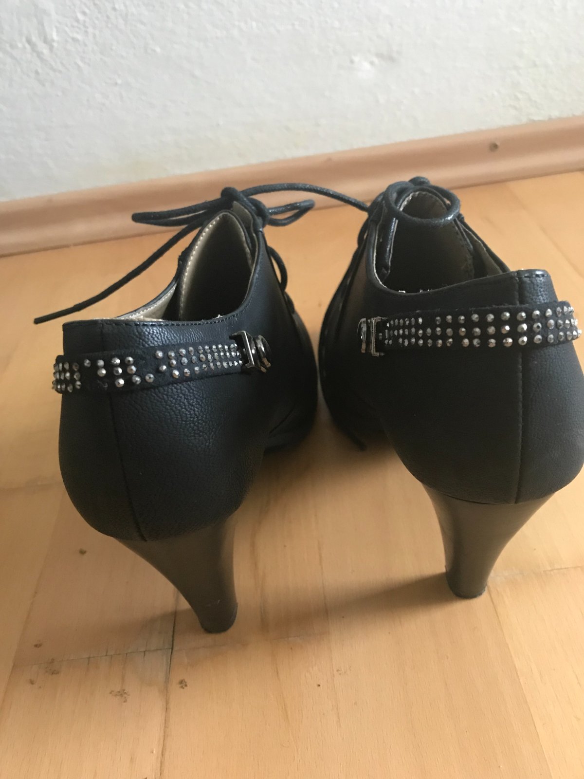 Čierne elegantné topánky tri krát obuté nemajú žiadnu vadu- kaz len na fotkach zle vidno v prednej časti a po bokoch su velke kvety, topanky su akoby latkovo lakované a na nich kvety