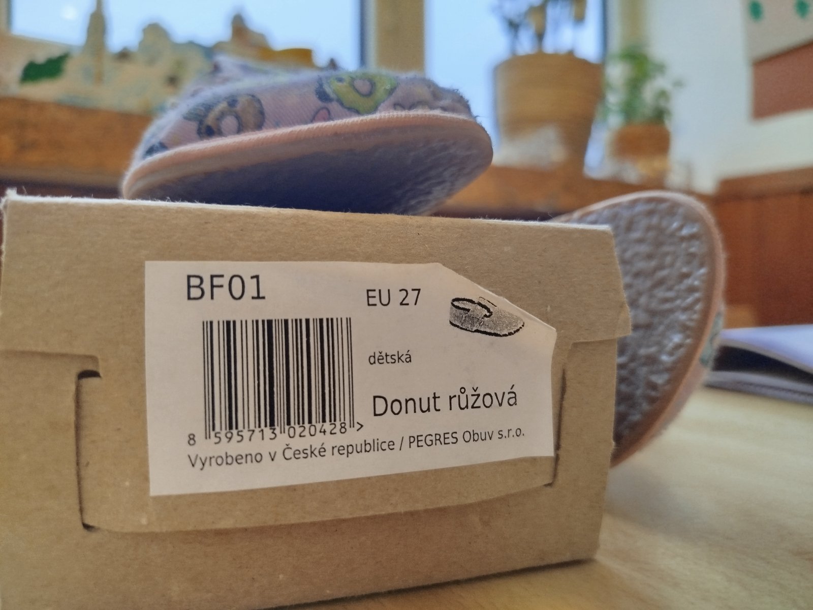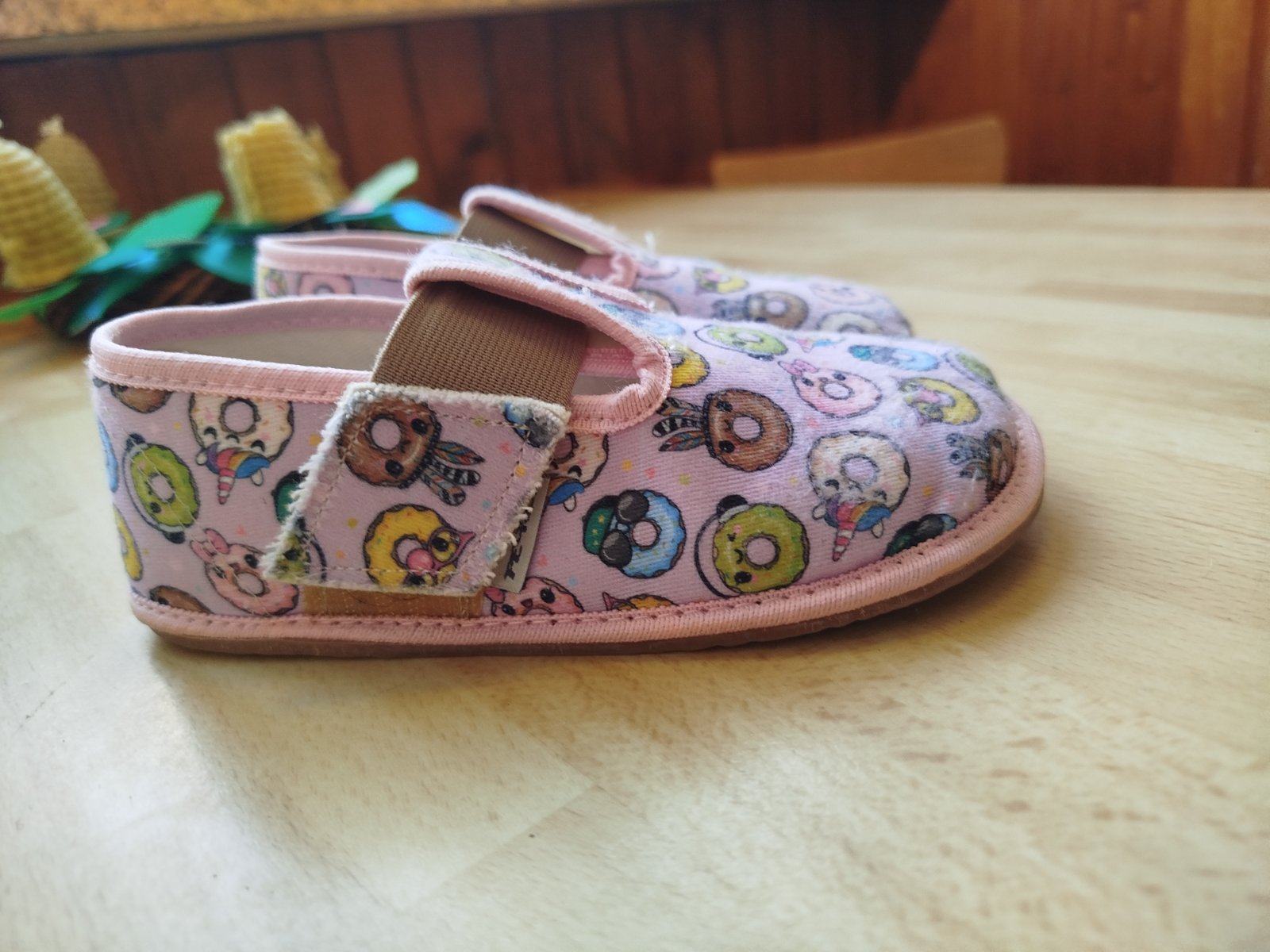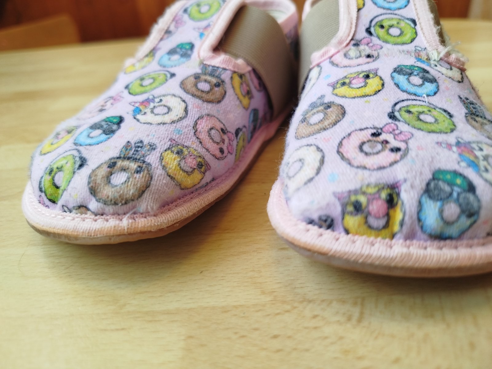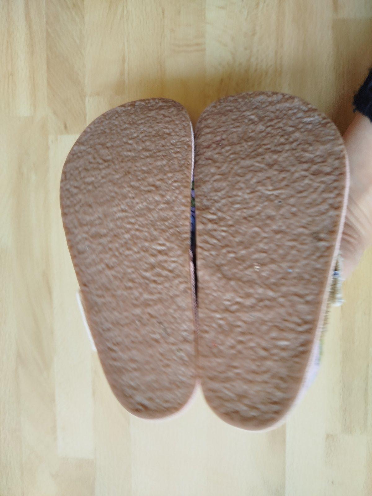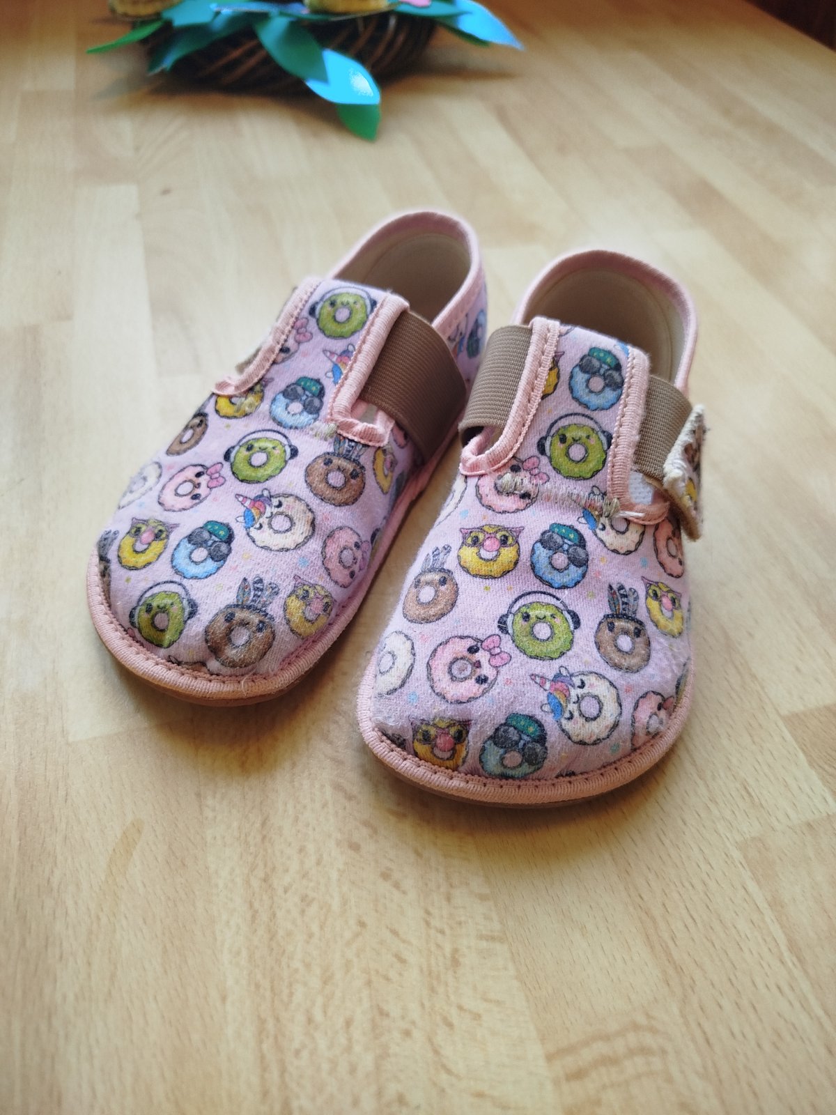 Veselé barefoot papučky vo veľmi peknom stave, po jednom dieťati, ktoré chodilo málo do škôlky. Podrážka vôbec neschodená. Vnútorná stielka sa dá vybrať, jej dĺžka je 17,5 cm. Suché zipsy na zapínaní sú v perfektnom stave.