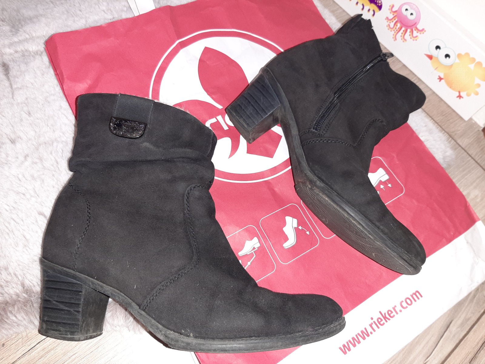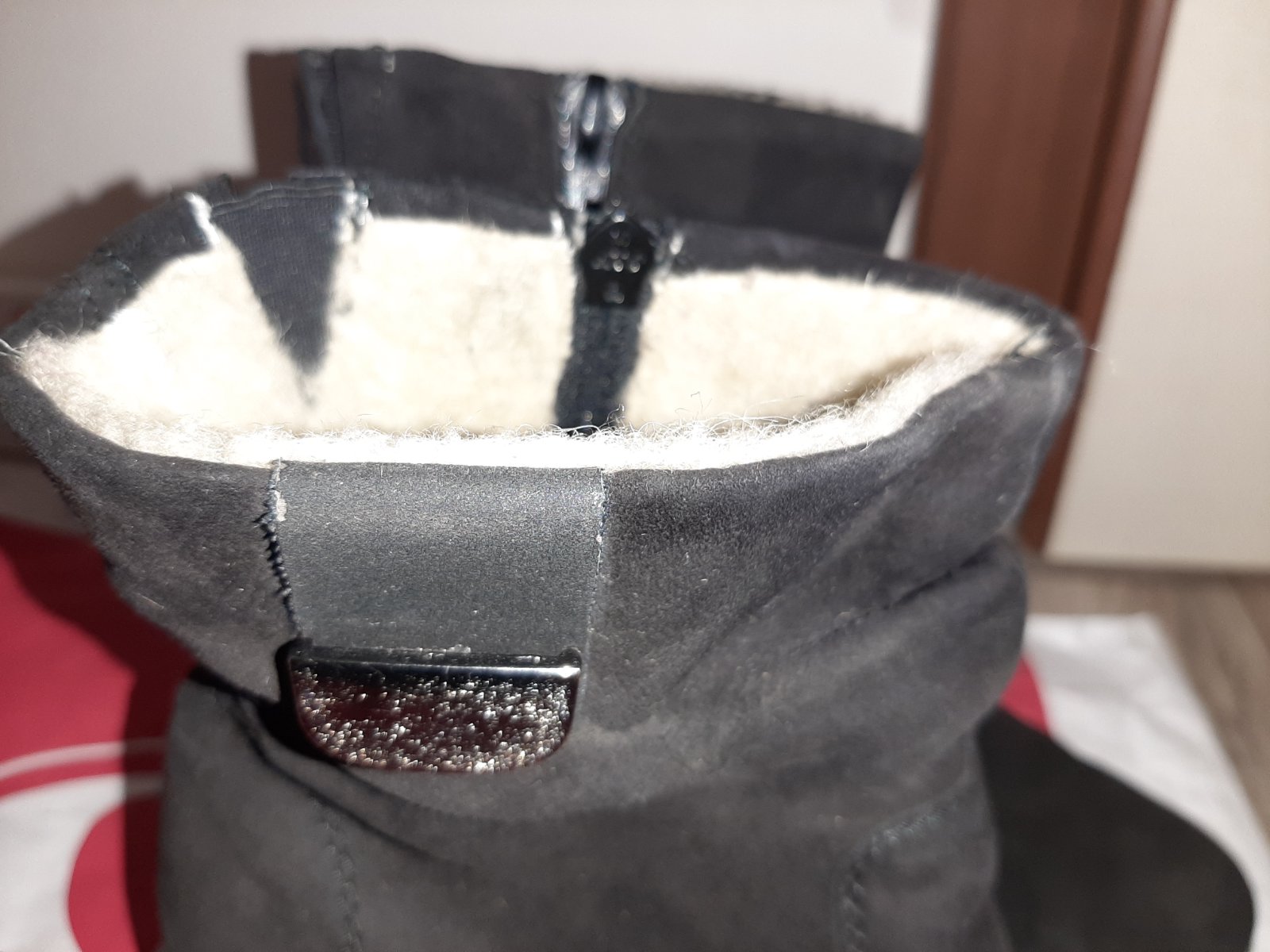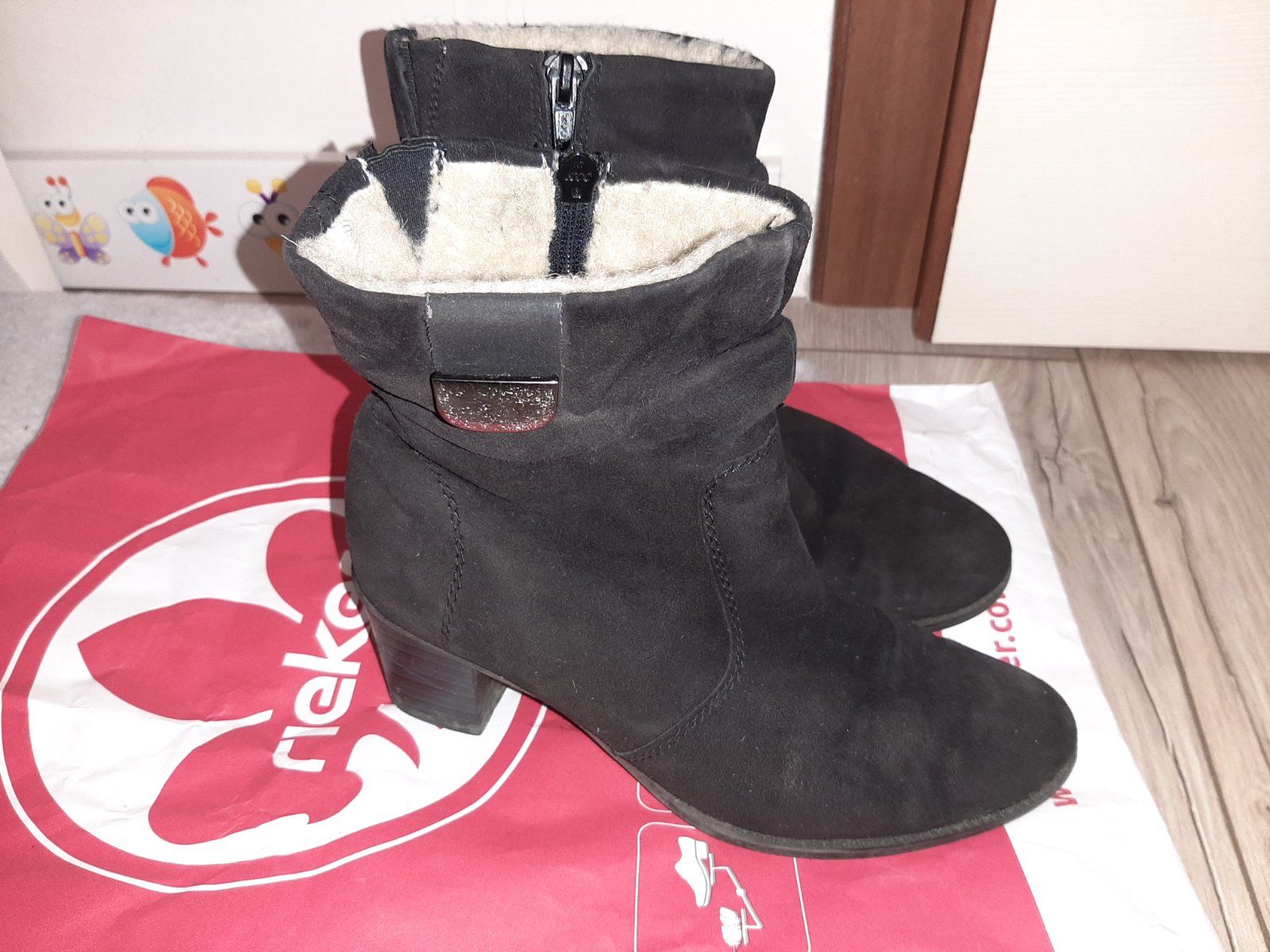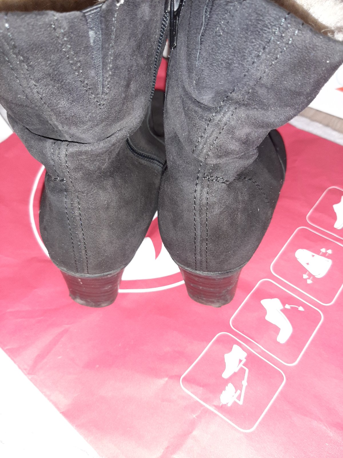 Čierne zateplené kotníčky, výborný stav, vnútorná dĺžka 24 cm, celková, sedia na 36, tak sú aj uvedené, napriek vnútornej dĺžke. Opätok 5,5 cm.