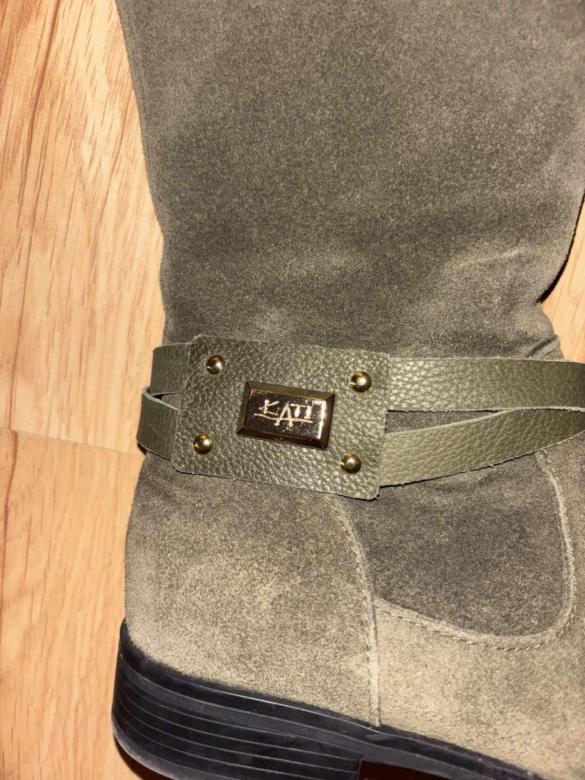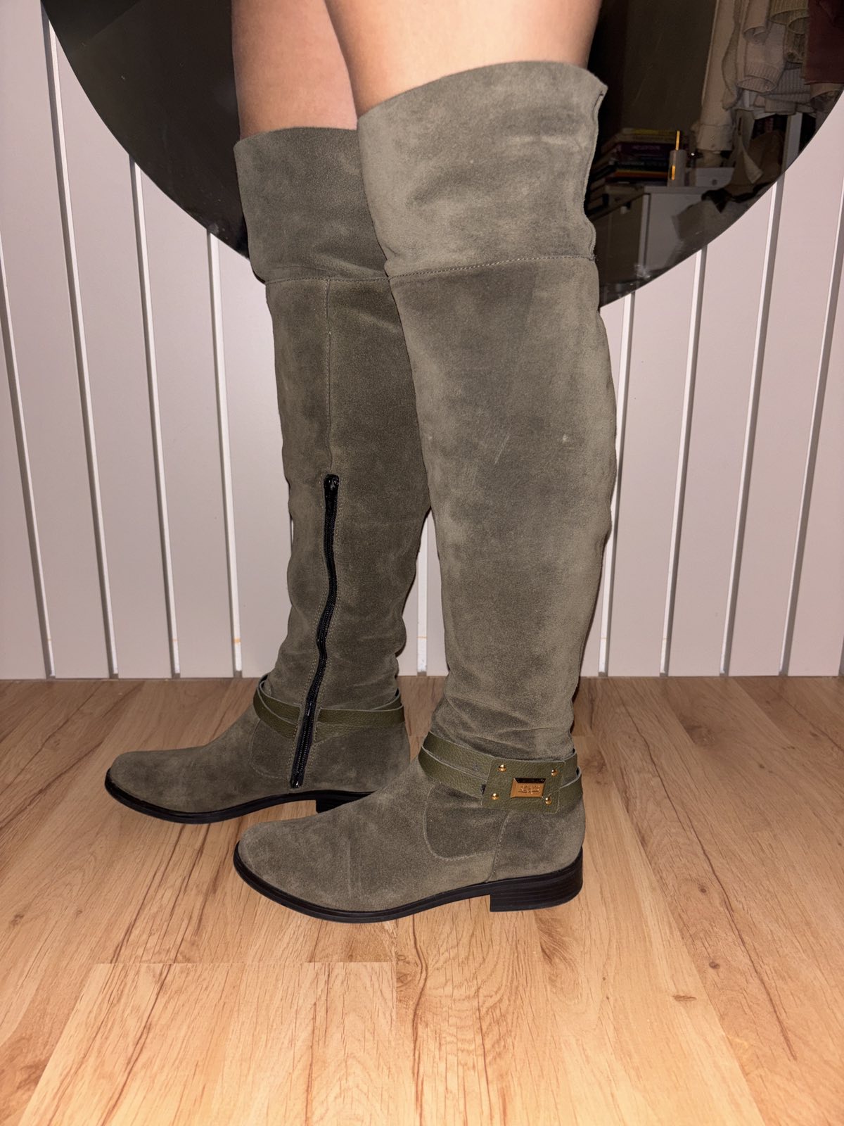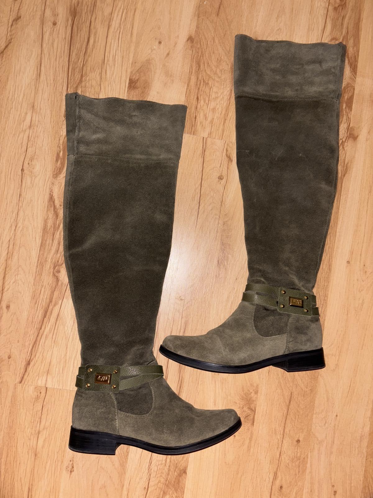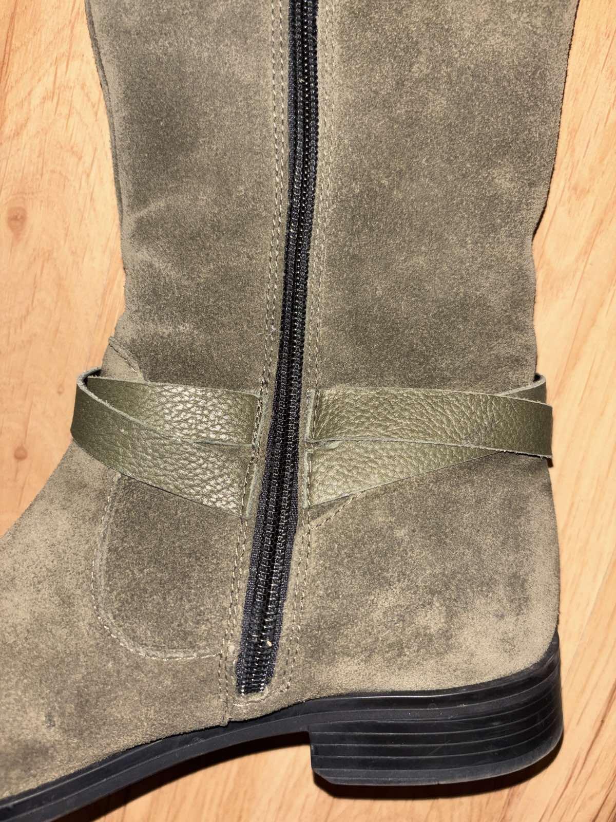 Výborný stav, nad koleno, brúsená koža, olivové, veľkosť 37
