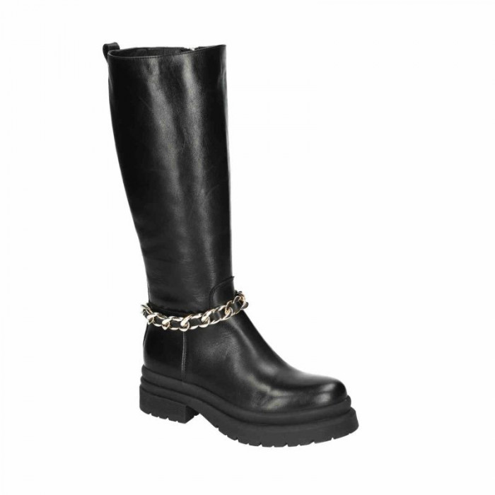 Vysoké elegantné čižmy značky Simen na vyššej podrážke si zamiluje každá žena. Kvalitná kožená obuv sa pýši prvotriednym spracovaním, prírodným materiálom, nadčasovosťou a pohodlnosťou. Dámsky model, ktorý sa veľmi ľahko kombinuje, pôsobí veľmi žensky a luxusne. Zaujímavá aplikácia retiazky na prednej strane dodáva celkovému vzhľadu šmrnc a jedinečnosť. Podrážka je veľmi moderná a tlmí nárazy pri každom kroku. Originálny kúsok do každého šatníka ženy. Výborný model na jesenné a zimné prechádzky či cesty do práce.