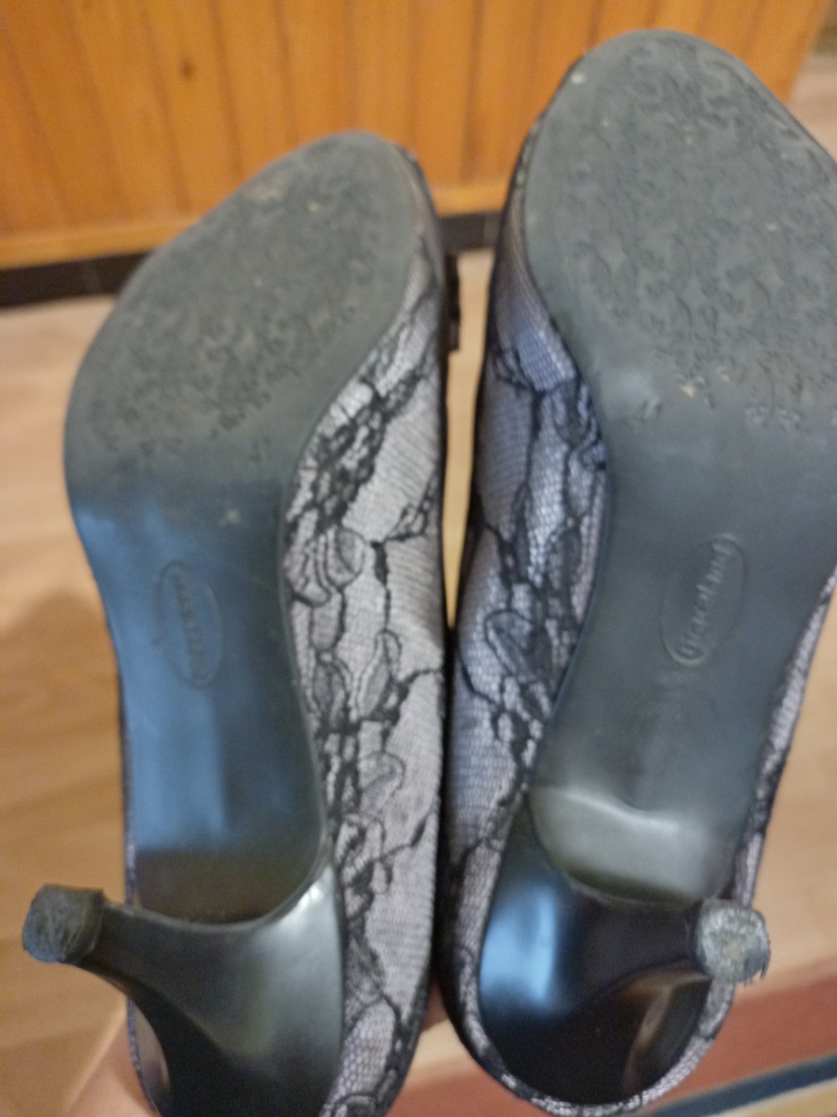 Dámske lodičky s čipkovaným vonkajšom , raz obuté, maju drobnú chybu na podpätku inak sú vo výbornom stave