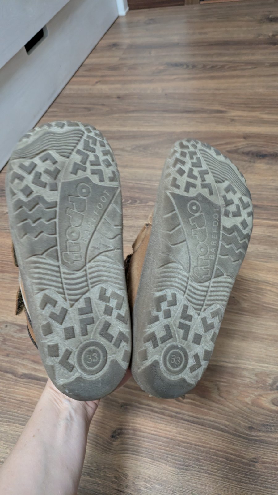 Froddo BareFoot TEX Autumn Grey Nosené Na ľavej topánke modrý fľak od farby (mne sa nedalo vyprať) Veľkosť 33 VD 215 mm 30 eur