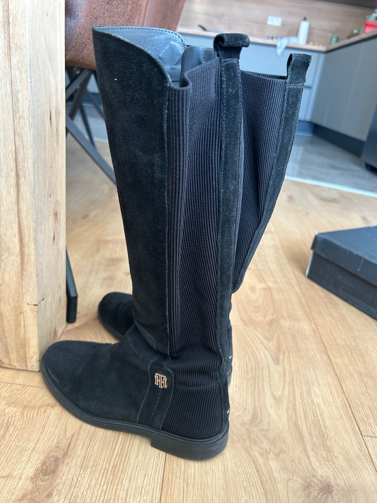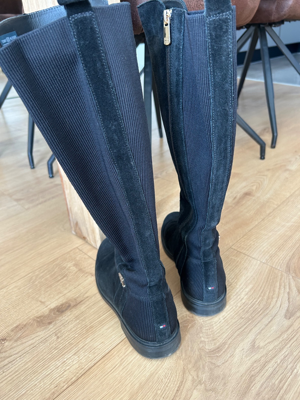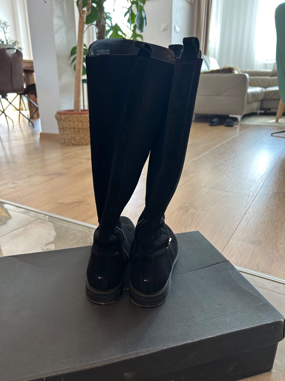 Čižmy sú minimálne nosené. Farba nie je vôbec vyblednutá, to skôr lepšie nešlo odfotiť. Sú kožené, semišové. Vzadu je gumička čiže sa prispôsobia látkam, aby neodstávali, poprípade vhodnejšie aj na širšie lýtka ako mám ja. Sú super, ale ja nie som typ na vysoké čižmy. Sú teda v 95 % stave, veľkostne sedia presne na 38. Netlačia, pohodlné. Cena bolo 75€