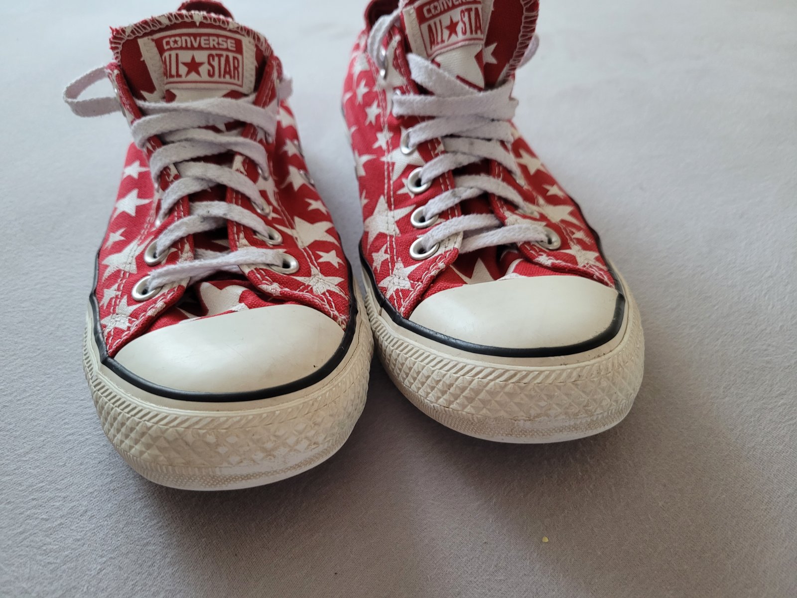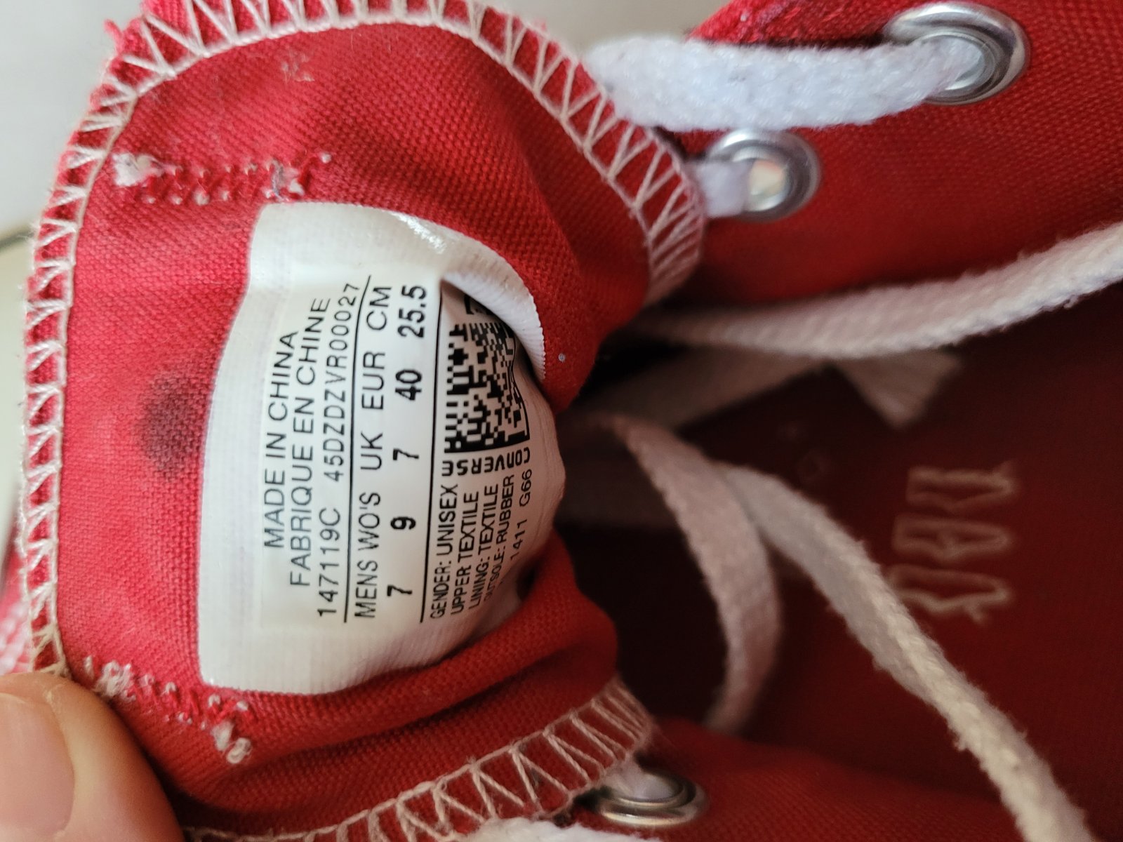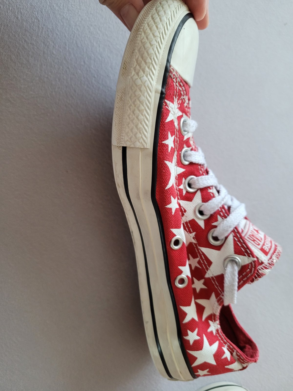 Zaujímavé textilné Conversy, červený podklad s bielym nápisom. Kupované v UK, veľkosť 7,5. Veľmi dobrý až výborný stav bez poškodení. Nevhodné na široké chodidlo. Dĺžka vnútornej stielky 26 cm. Su...
