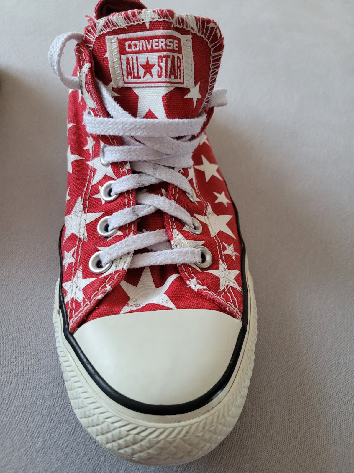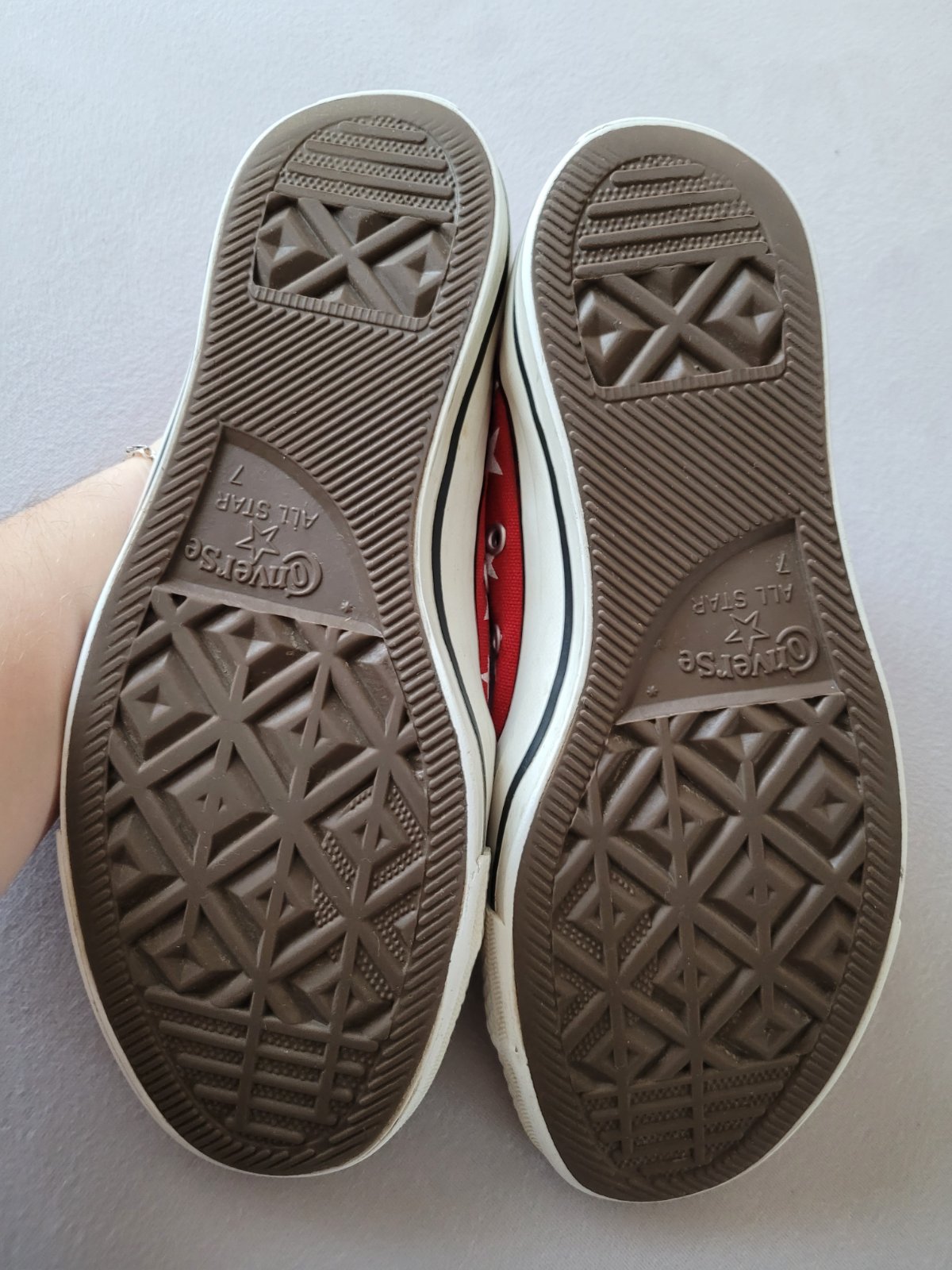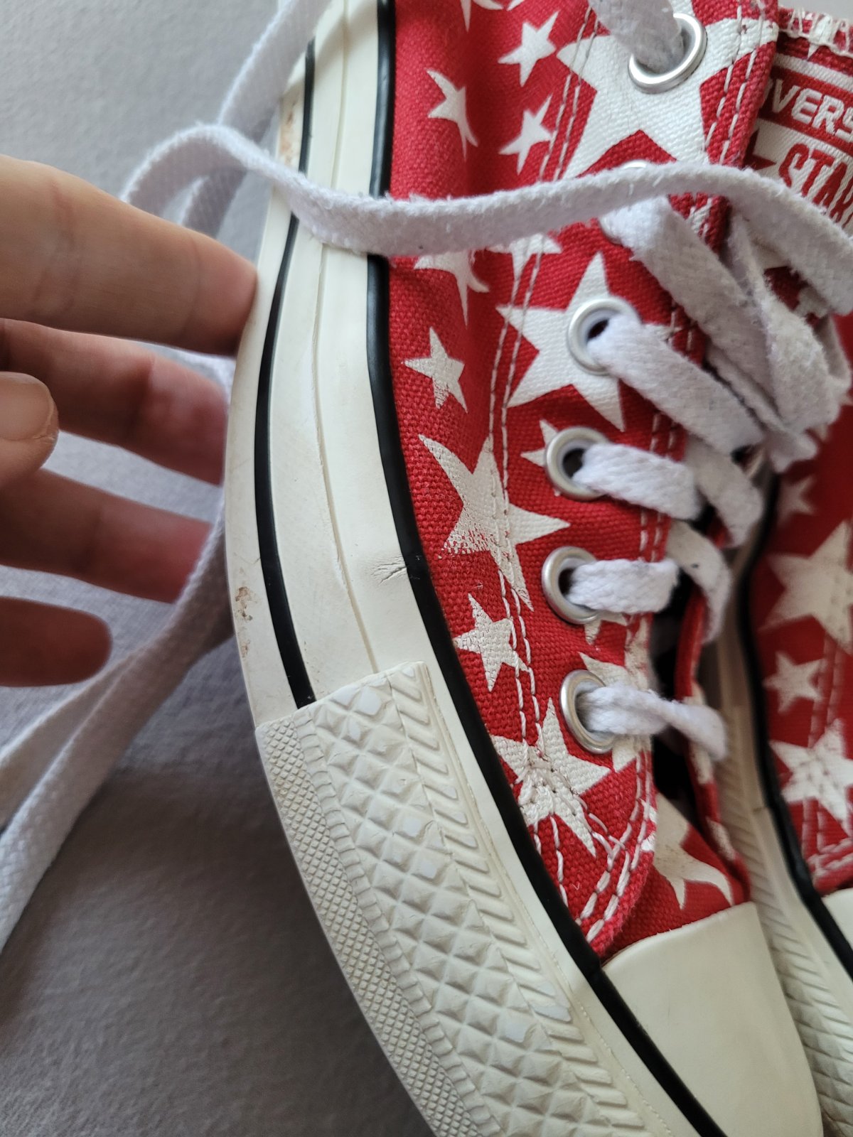 Zaujímavé textilné Conversy, červený podklad s bielym nápisom. Kupované v UK, veľkosť 7,5. Veľmi dobrý až výborný stav bez poškodení. Nevhodné na široké chodidlo. Dĺžka vnútornej stielky 26 cm. Su...