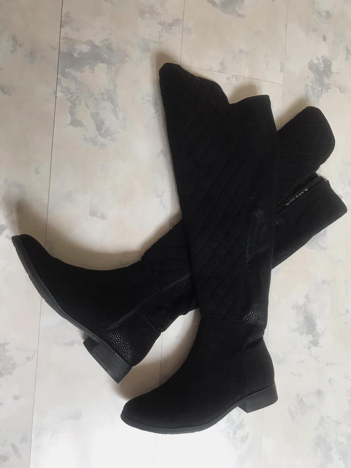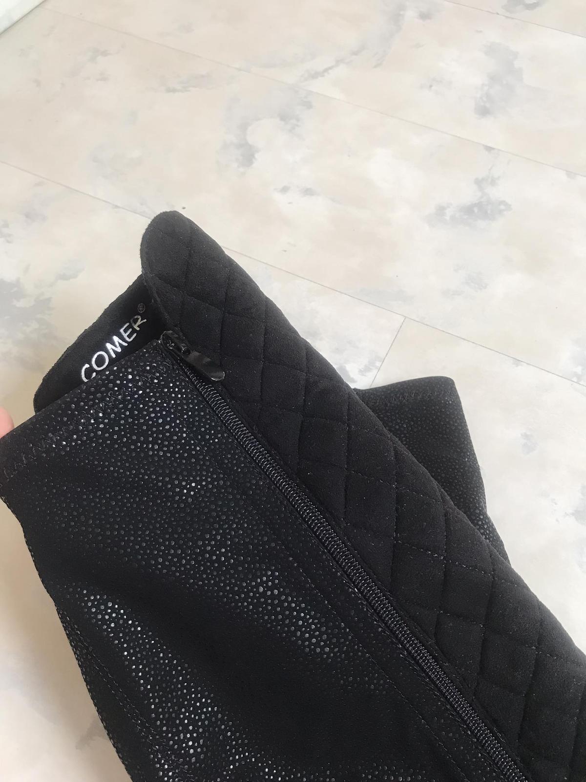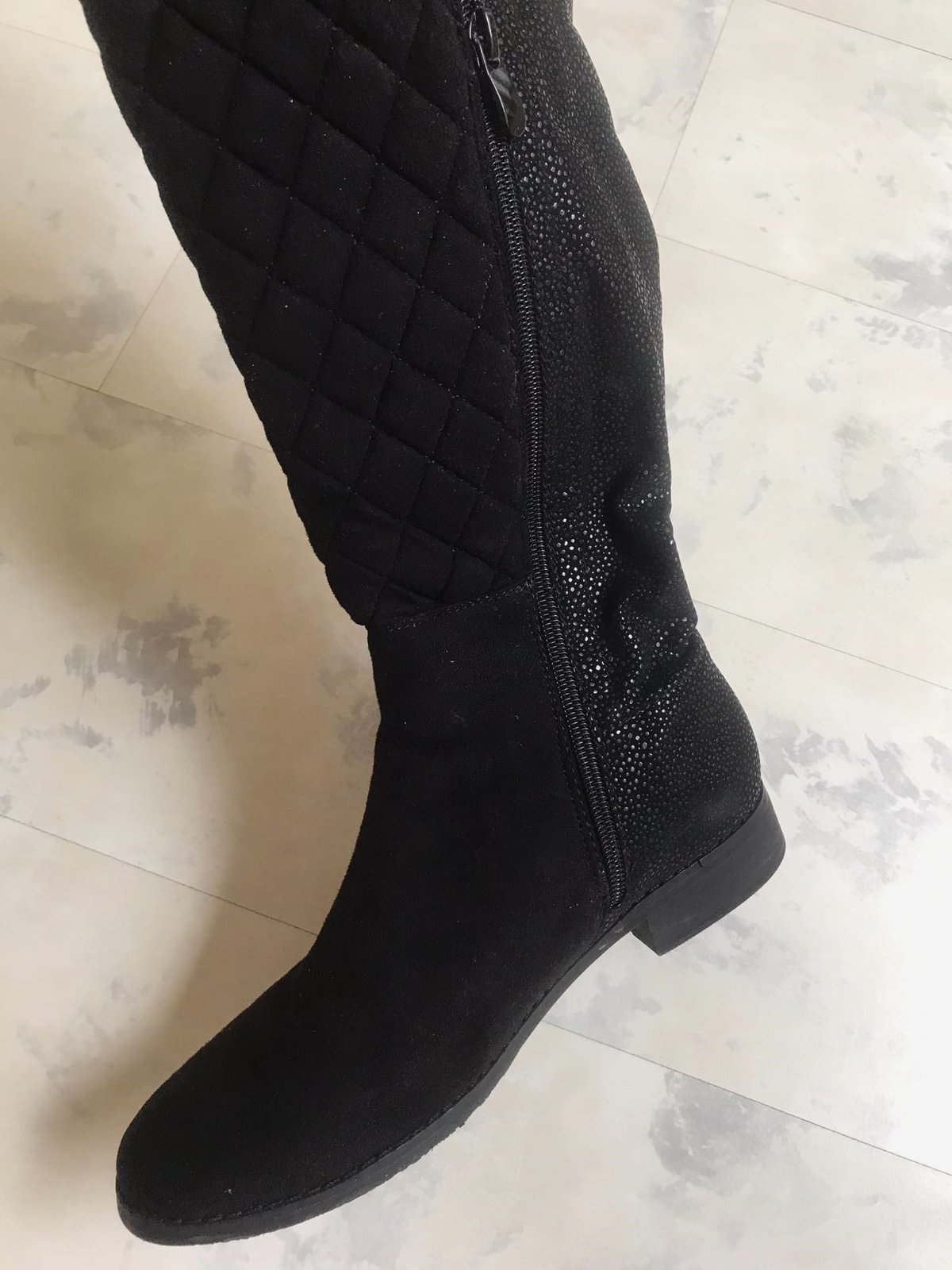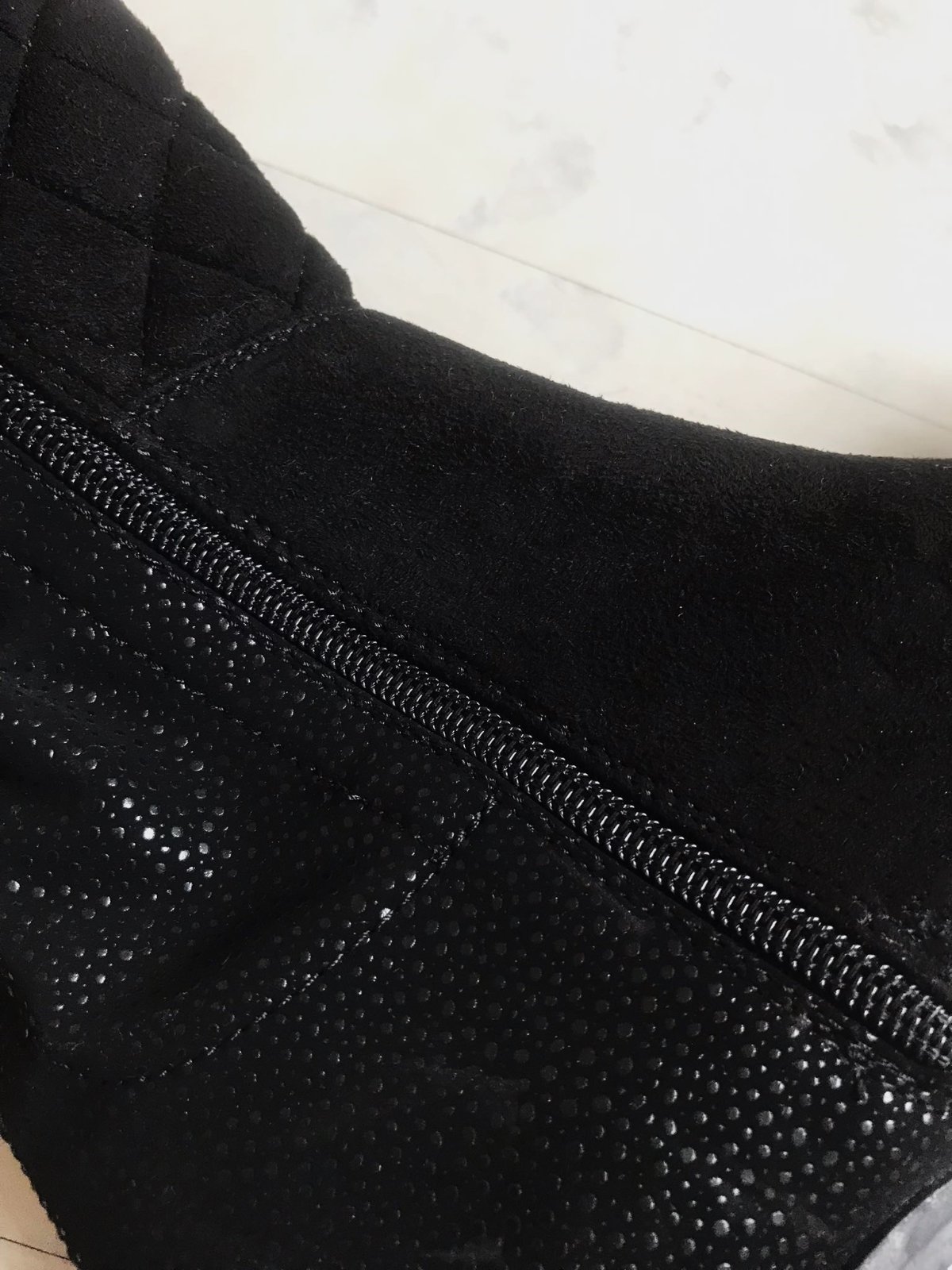 vysoké vpredu zateplené moderné jazdecké čižmy,1 x obuté - ako nové, zvnútra zips,na povrchu látkový semiš preštepovaný - v prednej časti,zadná časť impregnovaná látka s jemnými trblietkami,veľmi efektné a trendové,top kúsok,krásne sedia na nohe,tzv. jazdecký štýl,ľahúčke,super údržba,porch v látkovej úprave podobnej nízkovlasovému semišu.