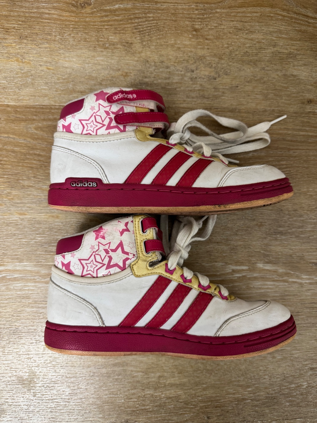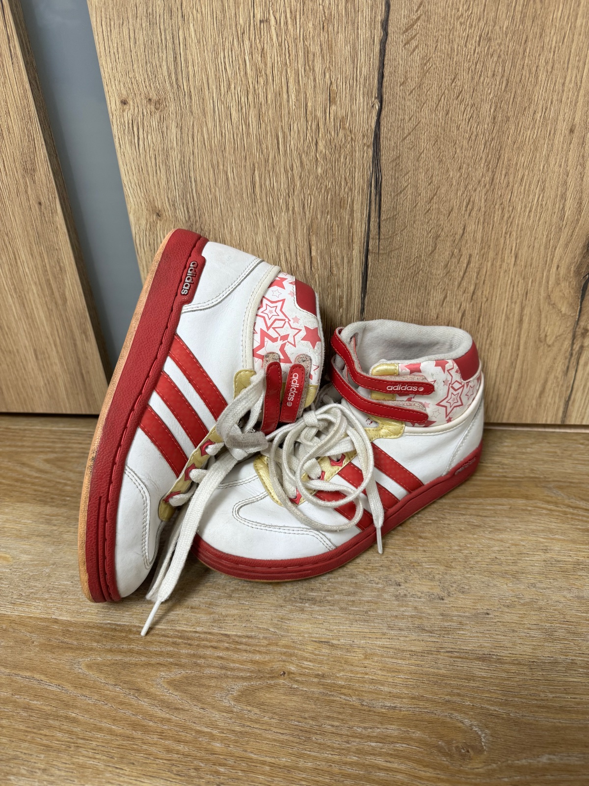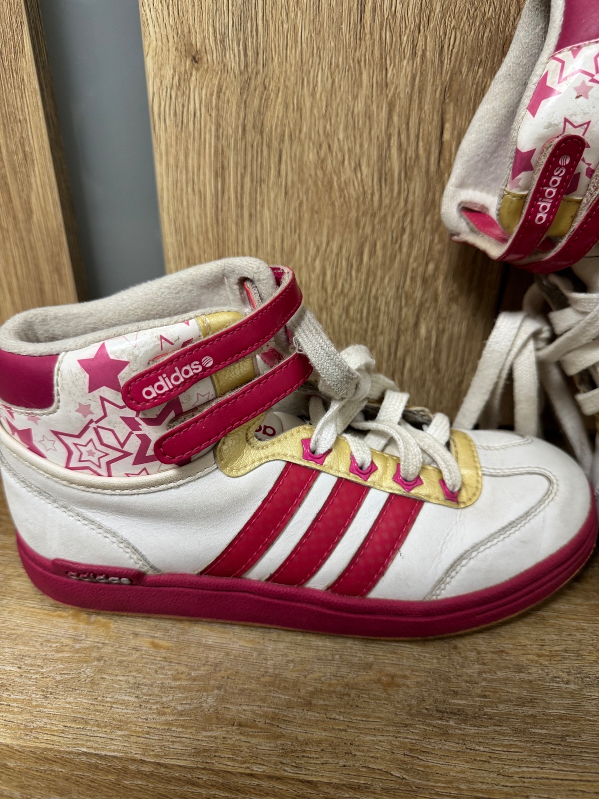 Ponúkam pekné netradičné vyššie tenisky značky Adidas v peknej ružovo-bielej kombinácii farieb so zlatobéžovou pri šnúrkach. Tenisky sú na šnúrky a hore sa ešte lepia suchým zipsom. Motív hviezdičiek. Veľkosť je uvedená 35 a vnút. dĺžka je uvedená 21cm, no ja som namerala vnútornú dĺžku až 22cm. Boli sem-tam nosené na striedačku, naďalej v peknom stave, bežné známky nosenia, všetko detailne nafotené. Poštovné podľa taríf.