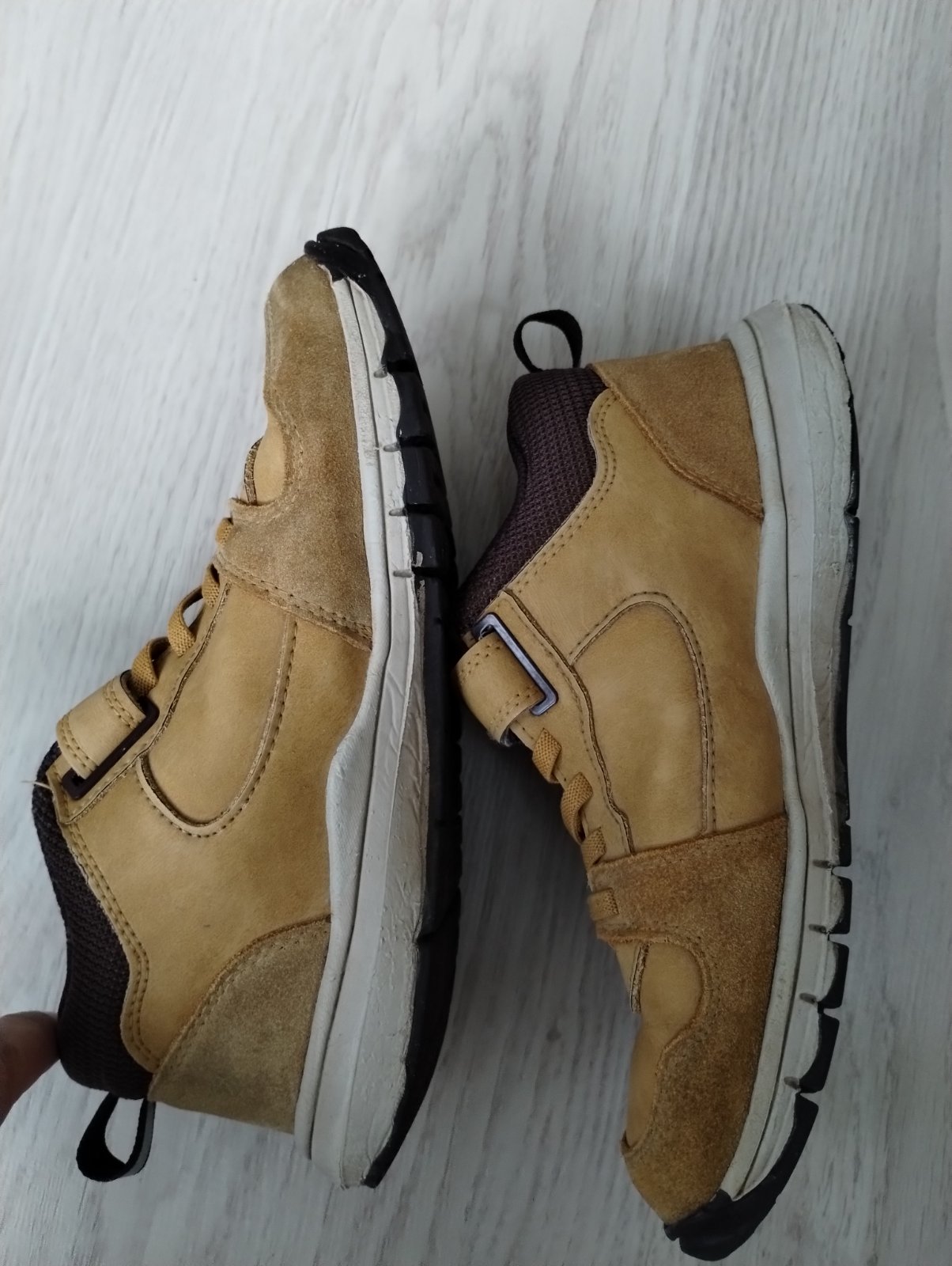 Kožené tenisky na suchý zips, odolné, majú flexibilnú podrážku. Bežné známky nosenia, nosené jednu sezónu - kupované 3/2025 (mám k nim aj doklad v prípade reklamácie). Boli pravidelne impregnované, dĺžka stielky 21,5cm.