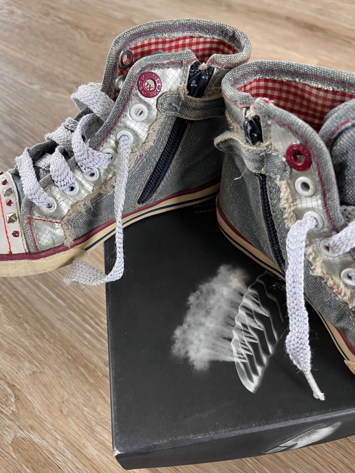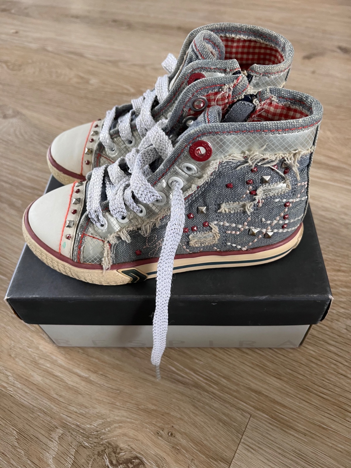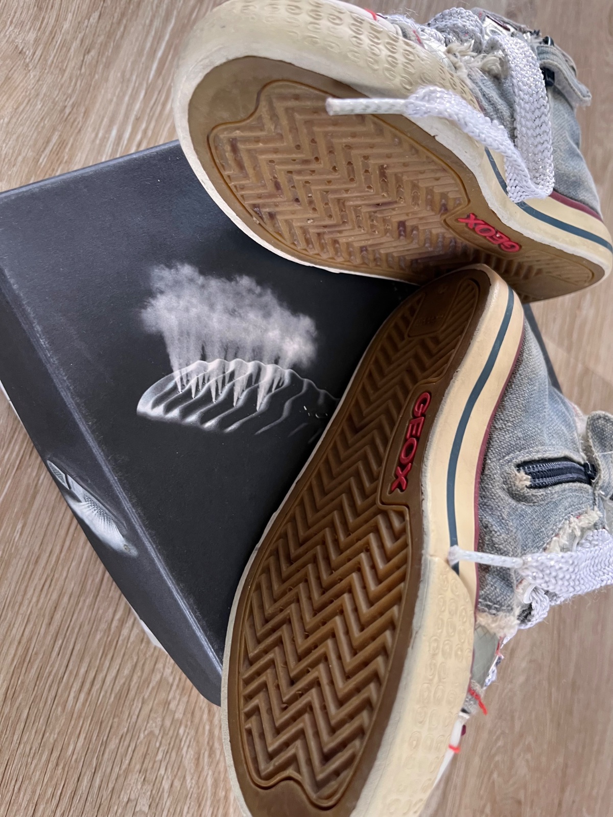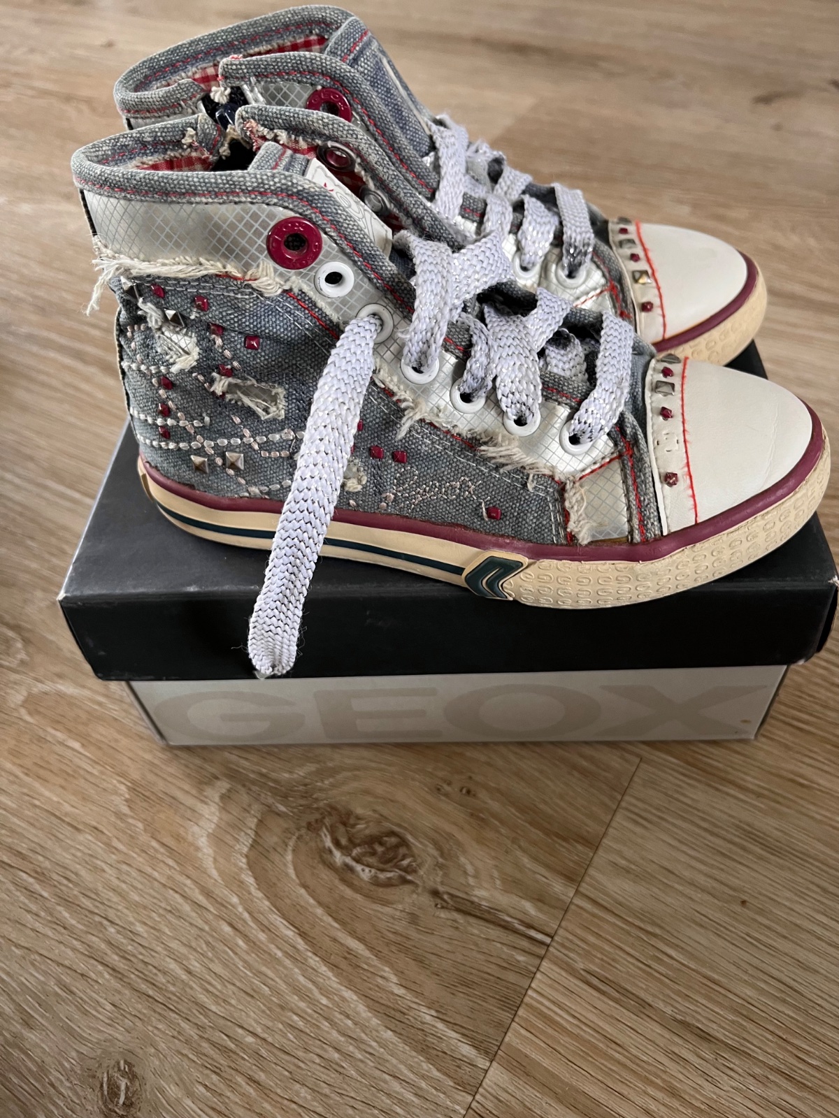 Štýlové riflové tenisky kotníkové. Značka Geox, preto sú na nohu 28. Ľahko sa obúvajú, lebo sú na zips. Kožená vnútorná stielka. Na pravej chýba jeden cvočuk, viď foto.