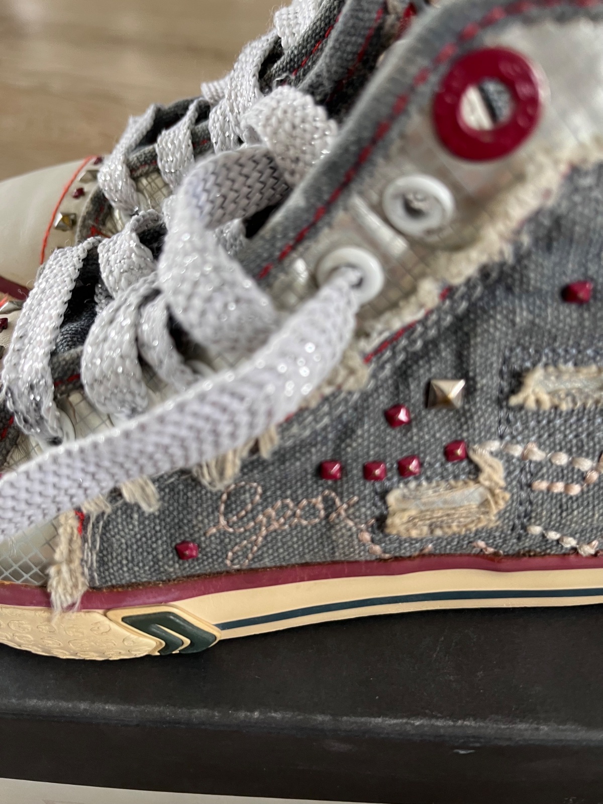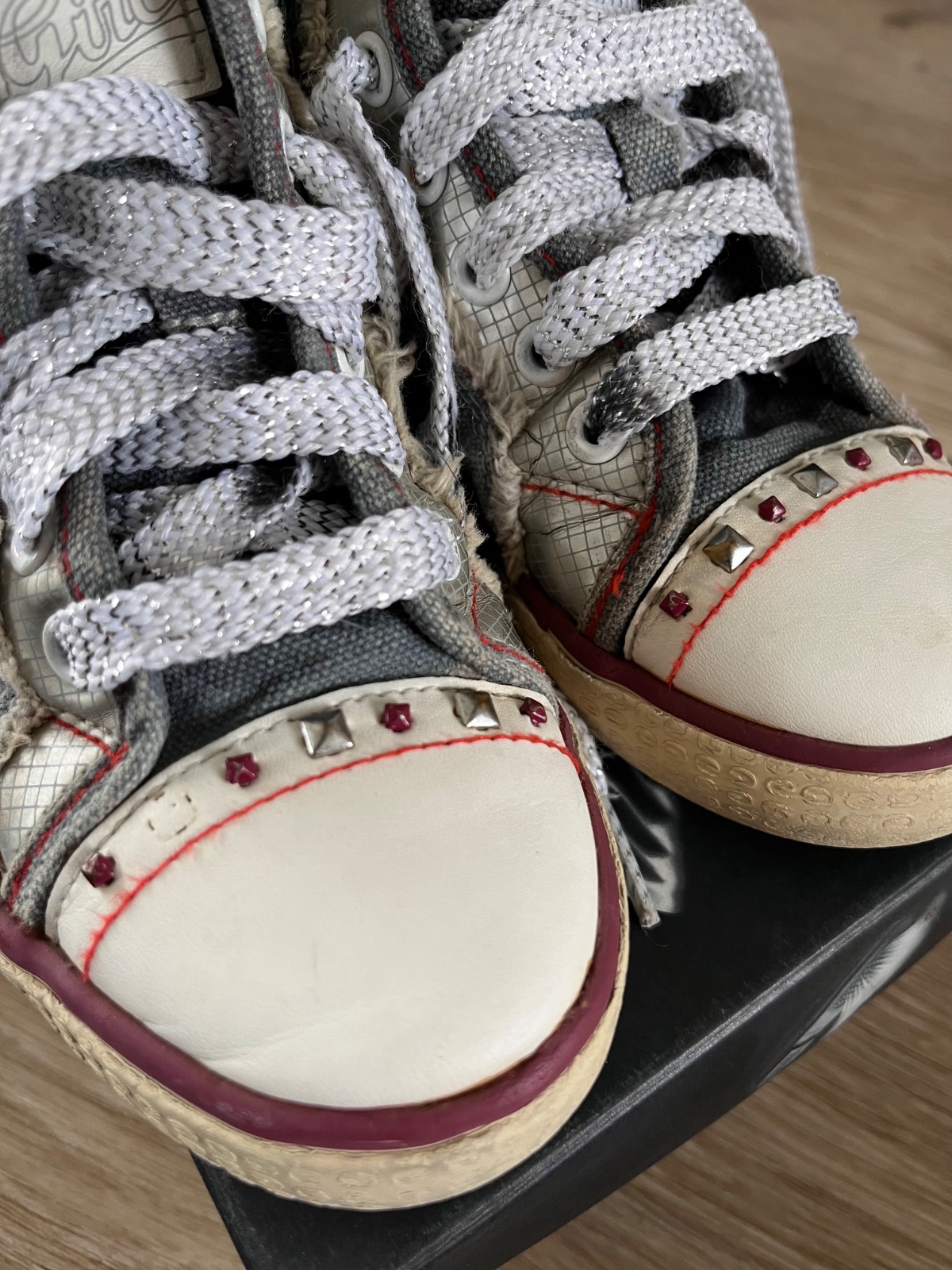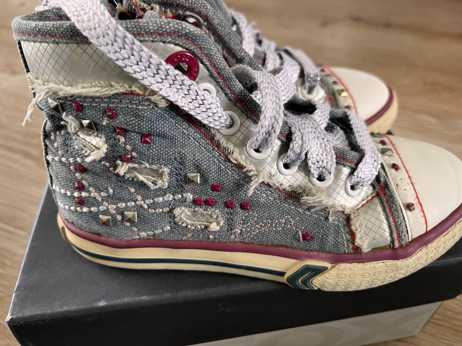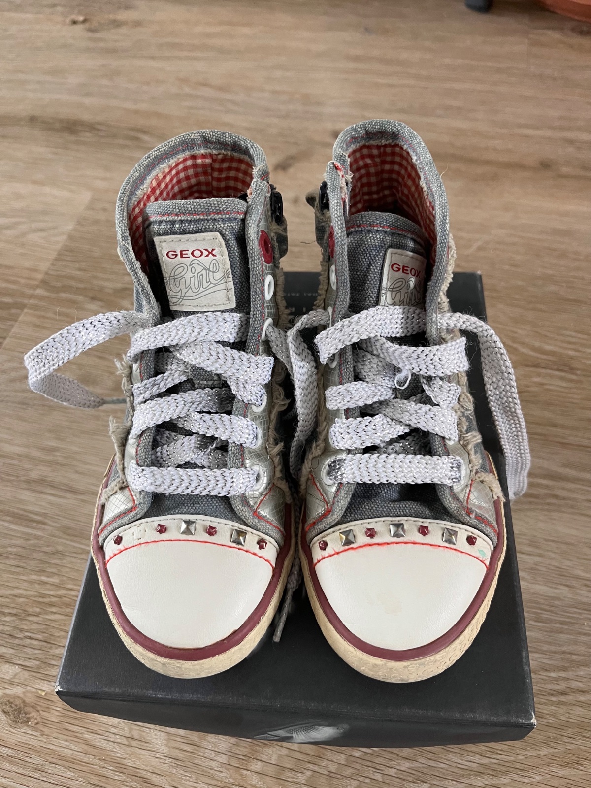 Štýlové riflové tenisky kotníkové. Značka Geox, preto sú na nohu 28. Ľahko sa obúvajú, lebo sú na zips. Kožená vnútorná stielka. Na pravej chýba jeden cvočuk, viď foto.