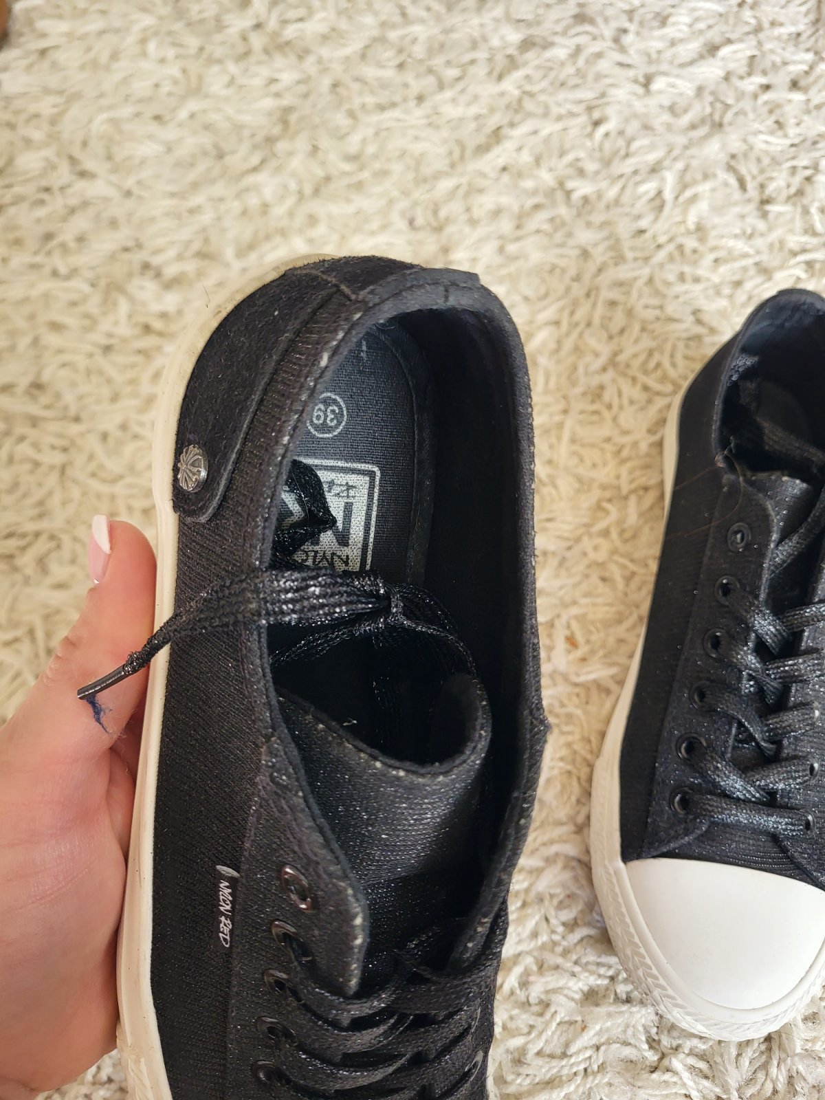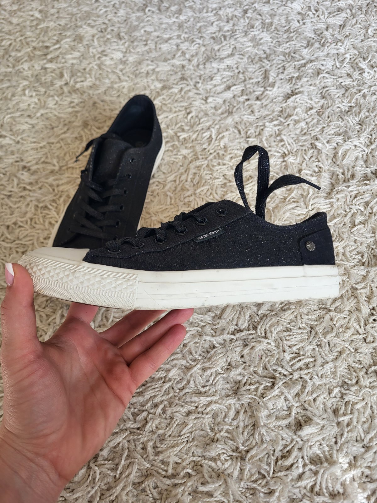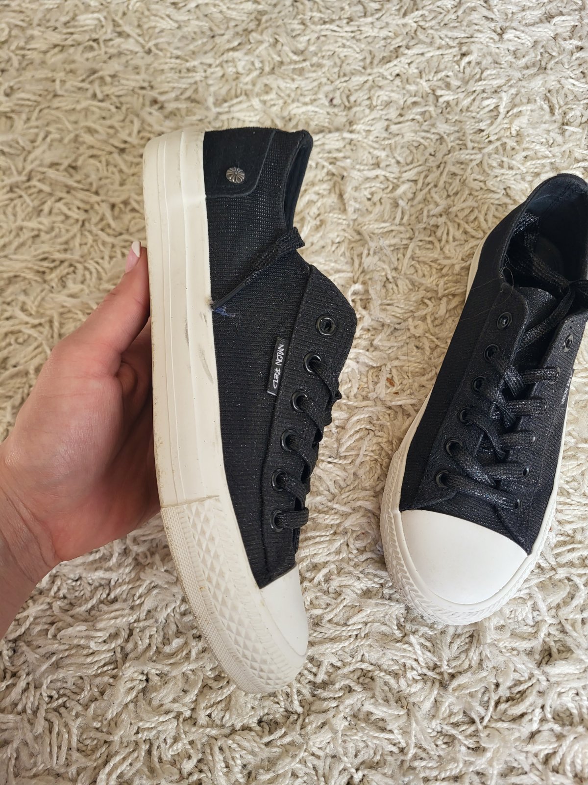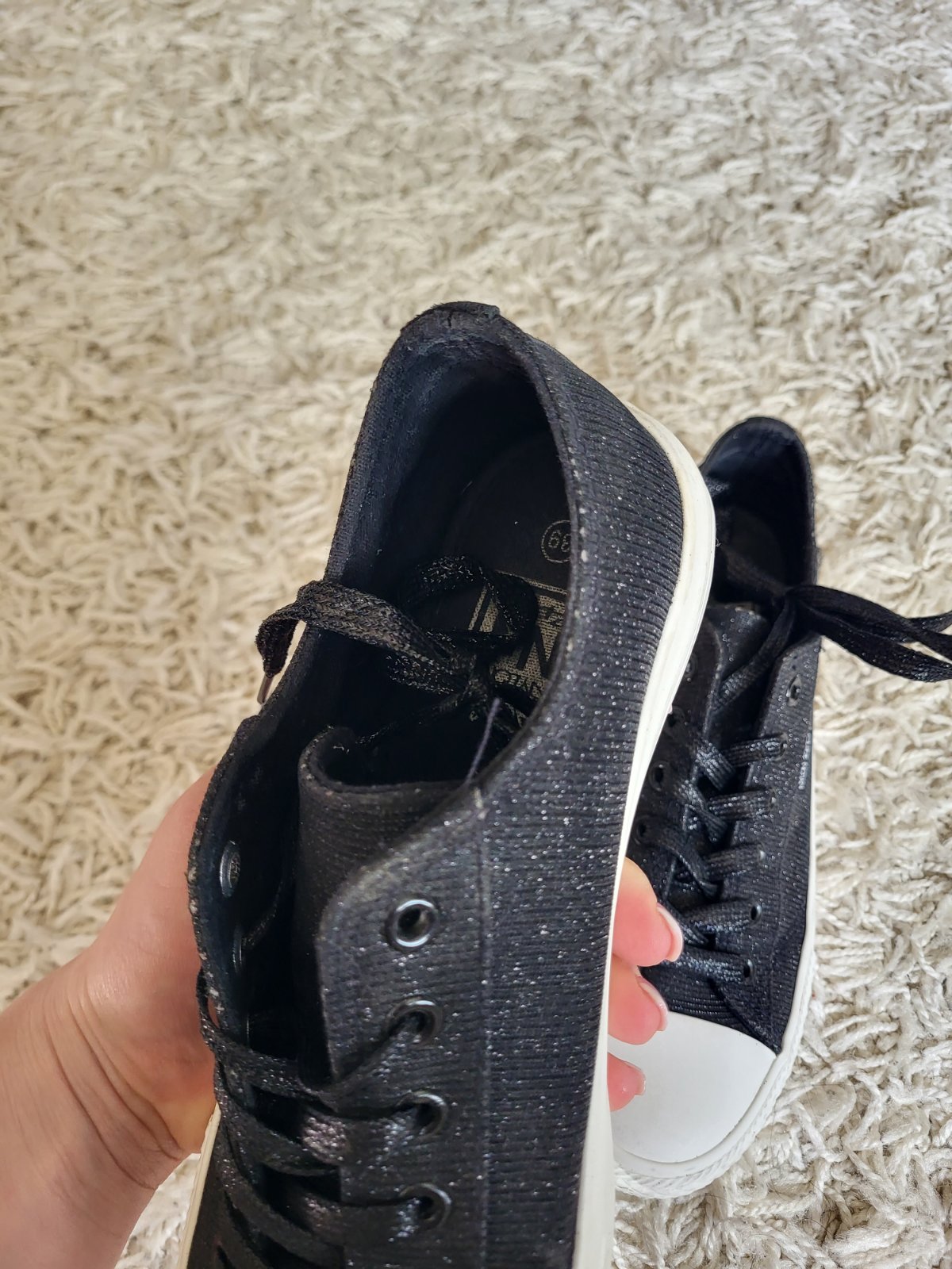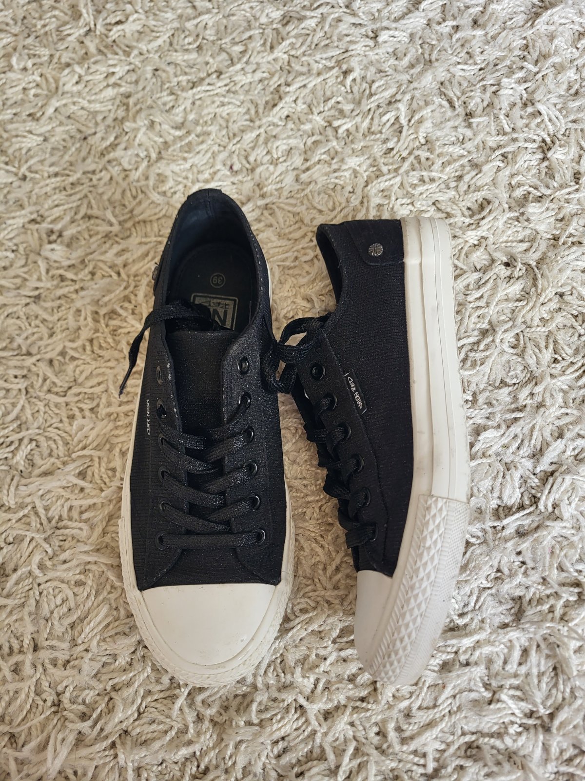 -stav vidno na fotkách, majú známky nosenia: šmuhy na podrážke, strata farby/trblietok ako je jazyk a okolie viď fotky, na prvý pohľad to nie je nejak extra vidieť