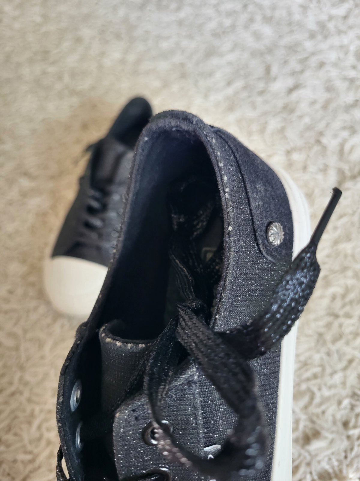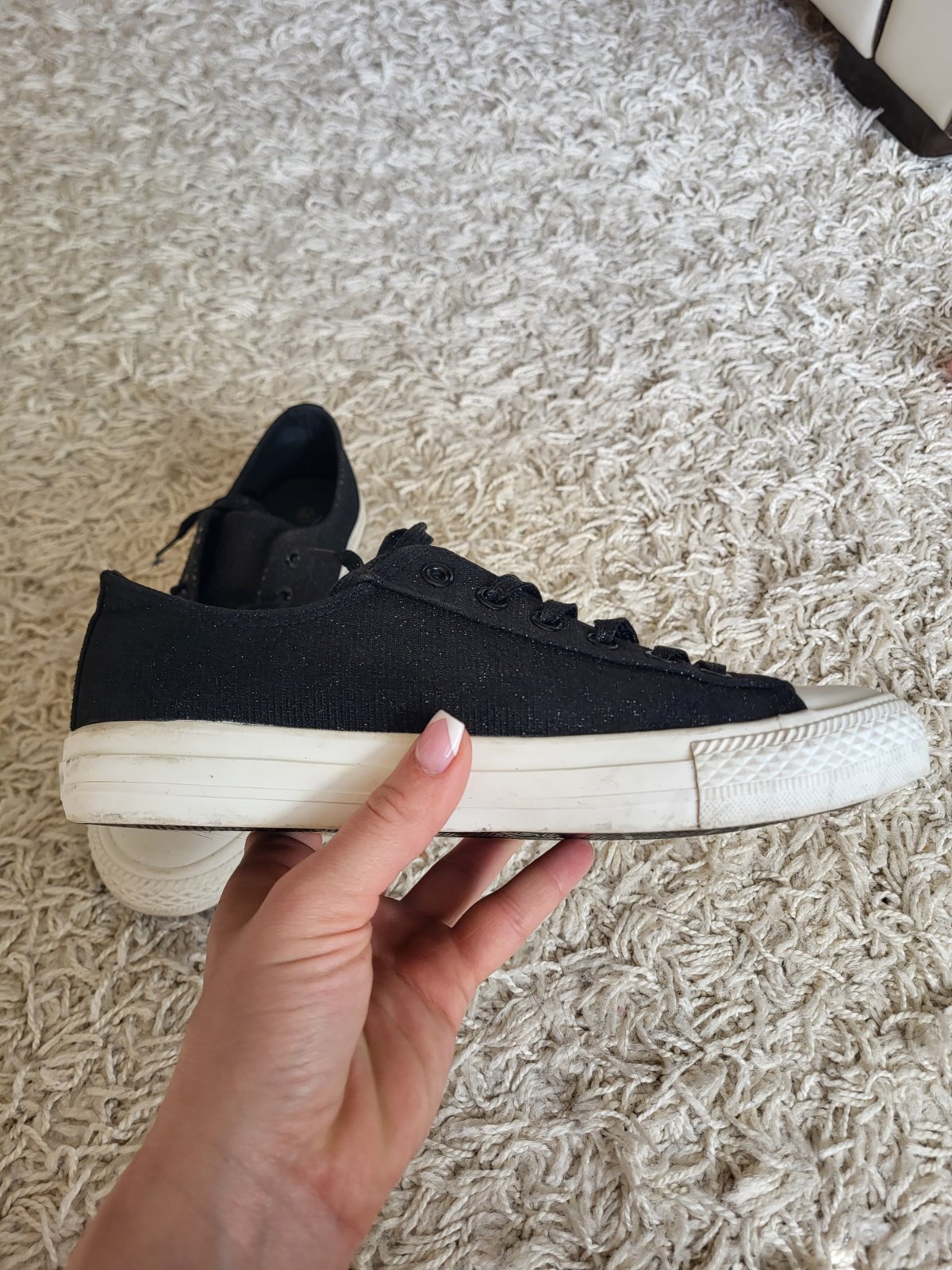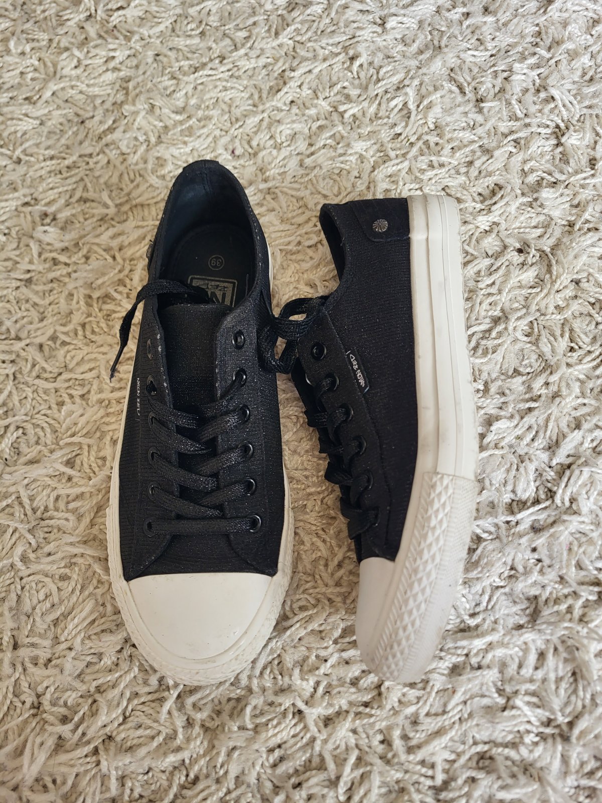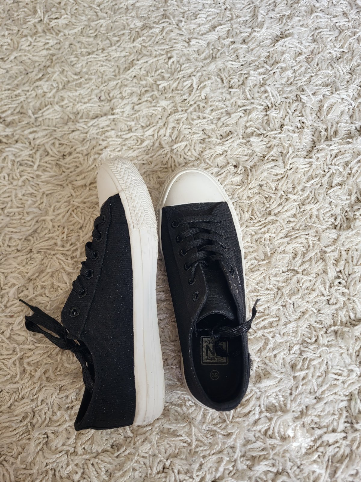 -stav vidno na fotkách, majú známky nosenia: šmuhy na podrážke, strata farby/trblietok ako je jazyk a okolie viď fotky, na prvý pohľad to nie je nejak extra vidieť