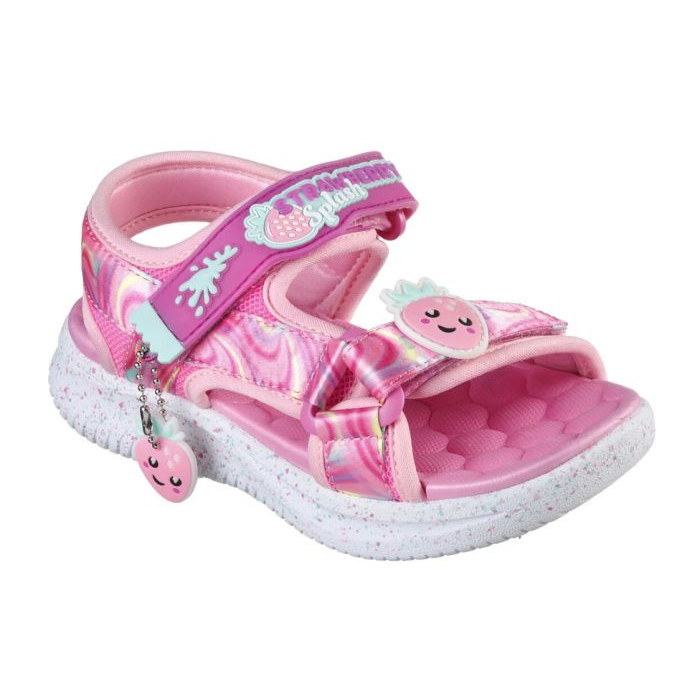 Dievčenské sandále Skechers s roztomilým motívom jahody. Tieto sandále budú určite sladkým pokušením pre vaše ratolesti, nakoľko majú jahodovú vôňu. Neodolateľné roztomilé sandálky pre malé slečny, ktoré sú maximálne pohodlné a flexibilné. Nádherný detský motív podotkne celkové prevedenie sandálok a preto nechajte svoje dieťa urobiť kroky vo svete farbených motívov. Vďaka nastaviteľnému suchému zipsu sa dá sandálka ľahko obúvať aj vyzúvať. Odpružená stielka je podporná a ľahká. Podošva poskytuje pružnú a priľnavú podporu.