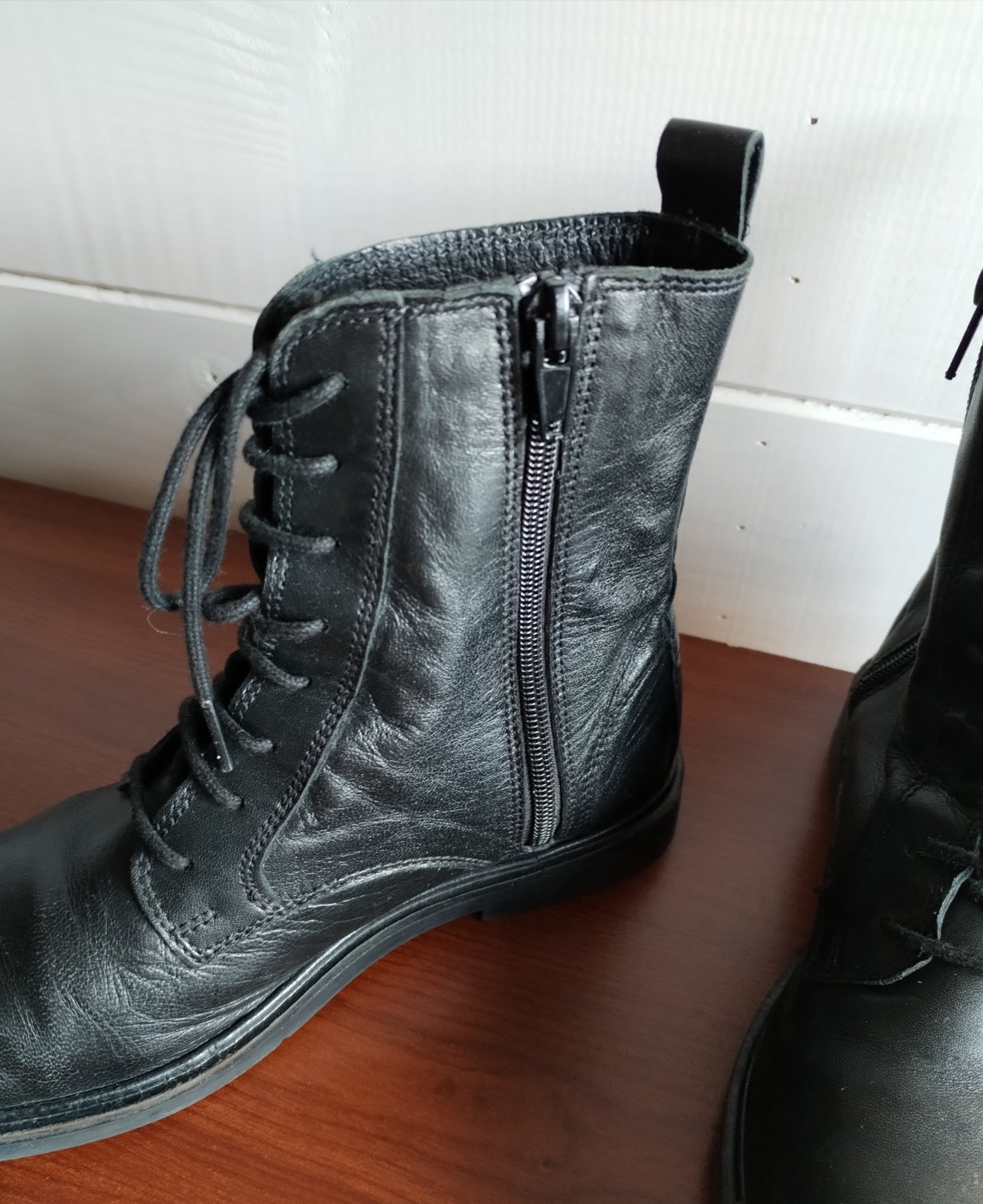 Krásne, vyššie členkove topanky, kožené, koža je jemná, mäkkučká. Nosené, v dobrom stave, maju pár škrabancov, ak sa nakremuju, nedostatky nebude vôbec vidiet. Kupované nové, nosené len mojou dcérou na striedačku s inými topankami.