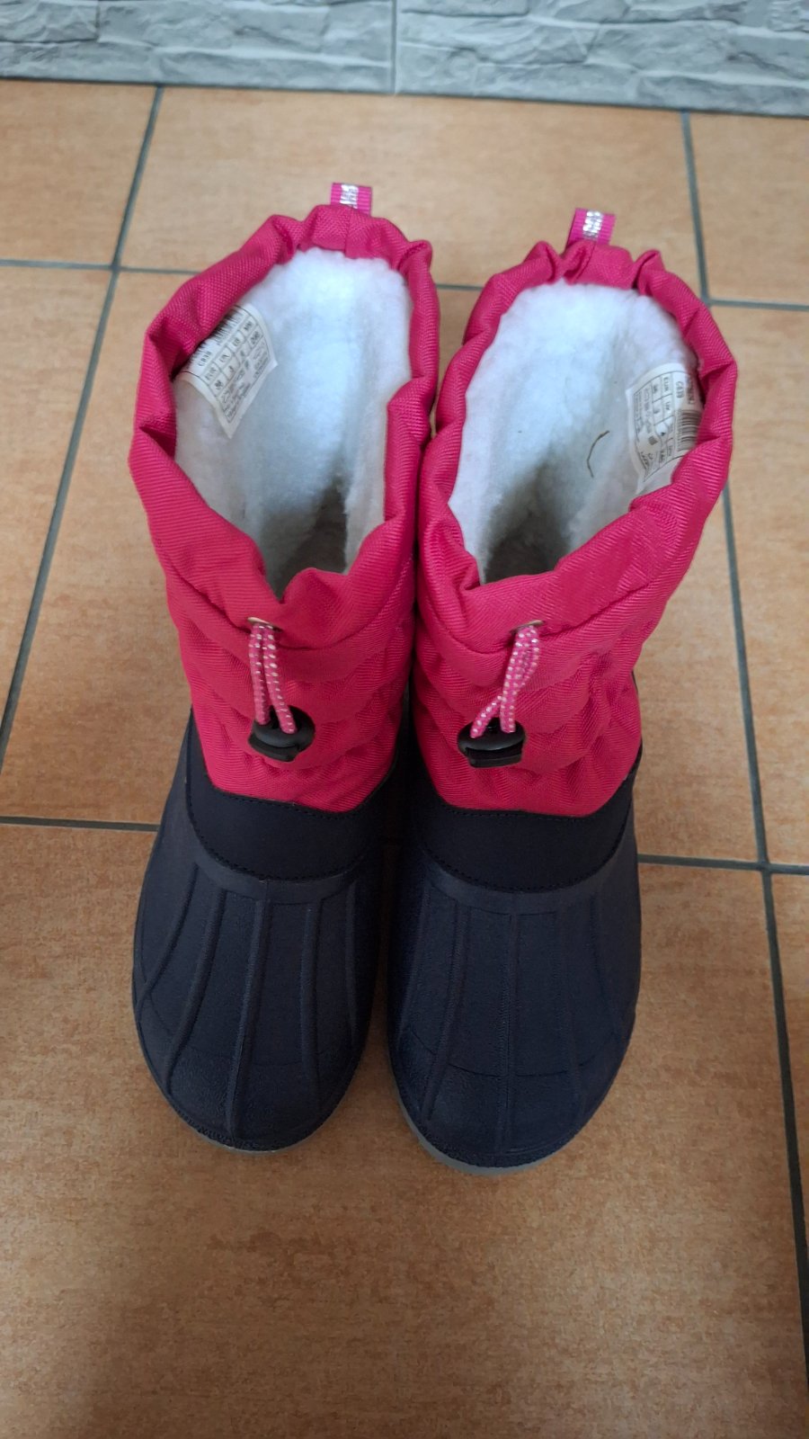 Skoro nenosené snehule, ako nové. Teplé, nepremokavé, na vrchu s gumičkou na zatiahnutie. Vnútorná dĺžka 24 cm, viď. etiketa na fotke.