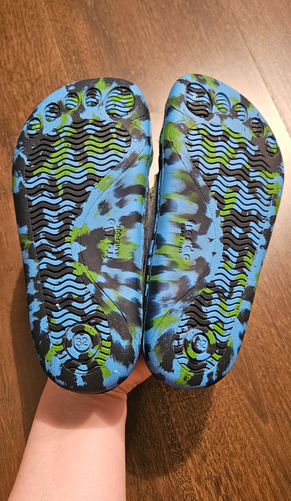 Volne: Frodo canvas platenky v. 32, VD: 21,5 x 7,7 cm, farbu stratili po cisteni kefkou a vodou, inak vo vybornom stave, suchace drzia pevne, podrazka neosuchana, vnutorna vlozka cista. Vhodne aj ako prezuvky. Cena 11 Eur + posta