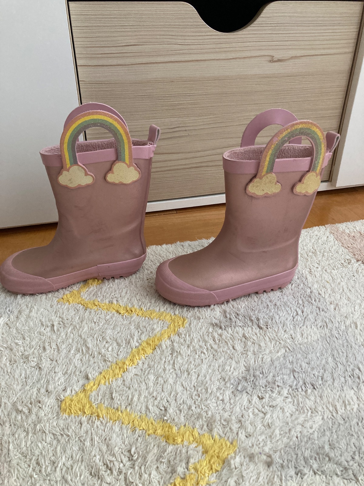 Ponukam na predaj flisom zateplene gumaky s duhami značky HaM. Povrch je metalicky ruzovy. Tento na niektorých miestach poskriabany, jednoducho gumaky boli nosene, aj keď zriedka, škrabancom sa nevyhli. Tiež na duhach praská farebná potlač. Nemajú žiadne poškodenia, ktoré by ovplyvnili ich funkčnosť. Velkost 27, VD vid foto. Sedia na velkost.
